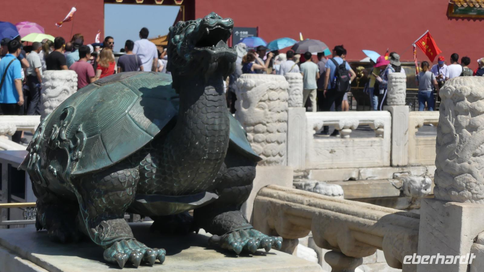 Am Morgen fahren wir vom Hotel nur ein kurzes Stück zum Tiananmenplatz. Zunächst müssen wir eine Sicherheitskontrolle passieren, um auf den Platz des Himmlischen Friedens zu kommen. Wie wir an einer langen Menschenschlange sehen, wird hier Mao immer noch von vielen verehrt. Über eine Stunde werden die Chinesen geduldig anstehen, um ins Mausoleum zu gelangen. Der weltweit größte Platz wird vom Nationalmuseum, Stadttor, Volkskongresshalle und dem Tor des Himmlischen Friedens umfasst. Dieses Tor mit dem Mao-Porträt bildet den Zugang zur Kaiserstadt, der Verbotenen Stadt. Drei Stunden nehmen wir uns für die Besichtigung dieser Stadt in der Stadt Zeit. Bei schönstem Wetter - blauer Himmel über Peking (!) schießen wir unzählige Fotos und Lin versteht es prima, uns an den Massen von Besuchern seitlich vorbei zu lotsen. So sehen wir in den Randbereichen eine Porzellansammlung und die Gemächer der Kaiserin. Für mich selbst wird eine zufällige Begegnung mit einer iranischen Touristin interessant: für ein Gruppenfoto hatte ich sie gebeten, uns zu fotografieren. Auf meine anschließende Frage nach ihrer Herkunft antwortete sie aus Isfahan in Iran. Ich selbst war vor vier Monaten mit einer Eberhardt-Gruppe in Isfahan. Auf dem dortigen Imam-Platz habe ich erklärt, dass dieser nach dem Tiananmen-Platz in Peking der weltweit zweitgrößte Platz ist. Wenn man so will, schließt sich für mich jetzt ein Kreis, der vor 4 Monaten in Isfahan begann.