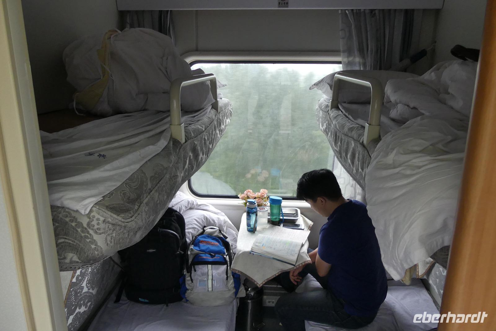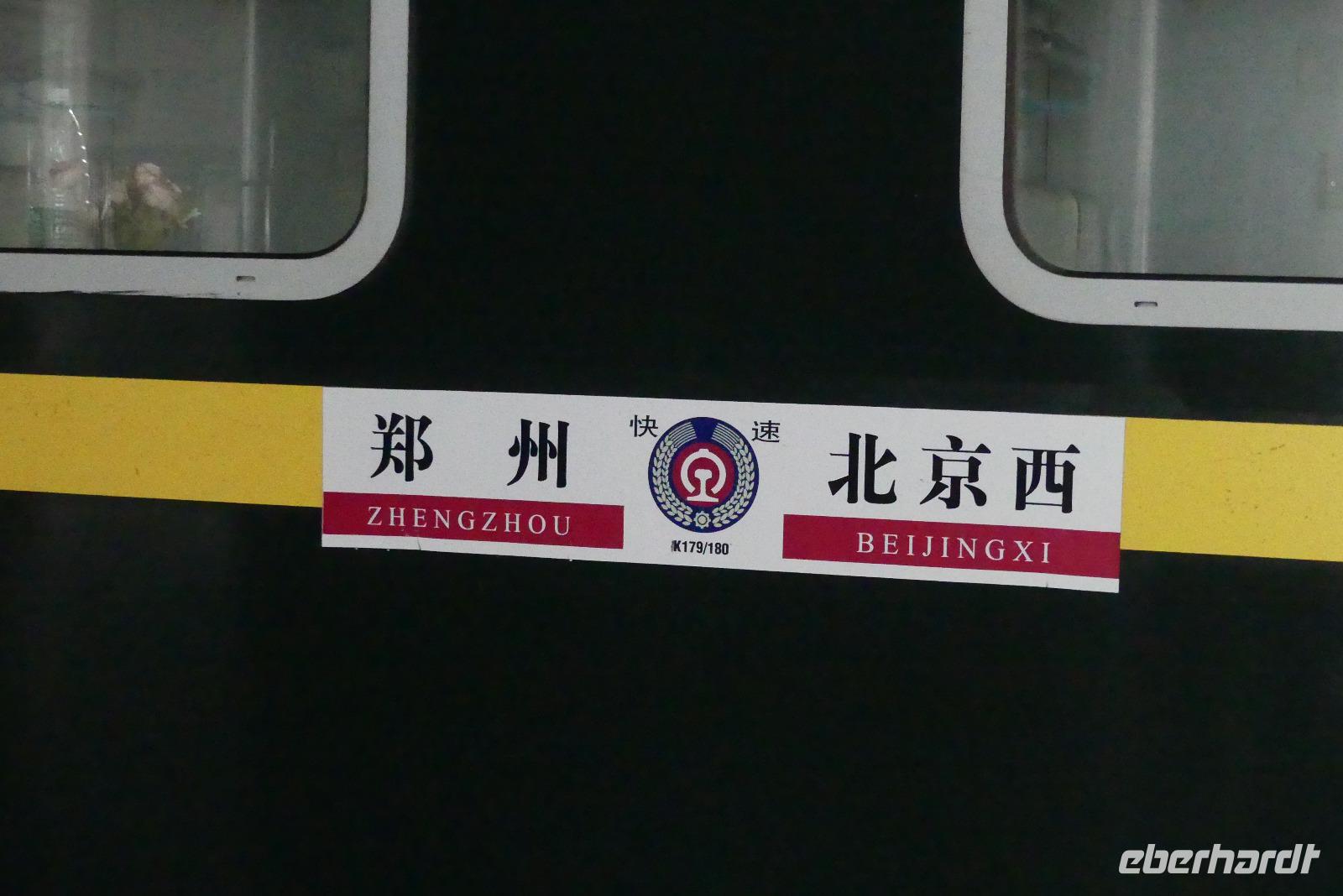 Gegen 22.00 Uhr steigen wir in den Nachtzug nach Zhengzhou. Sicherlich eine ganz spezielle Erfahrung. Wir verbringen die Nacht in 4-Personen-Abteilen. Ein Waschraum und Toilette befinden sich im Waggon. Reisschnaps soll uns das Einschlafen erleichtern, wirkt aber nicht bei jedem. Ich hätte wohl eine ganze Flasche gebraucht, um schlafen zu können, denn das immer wiederkehrende Ruckeln stört...