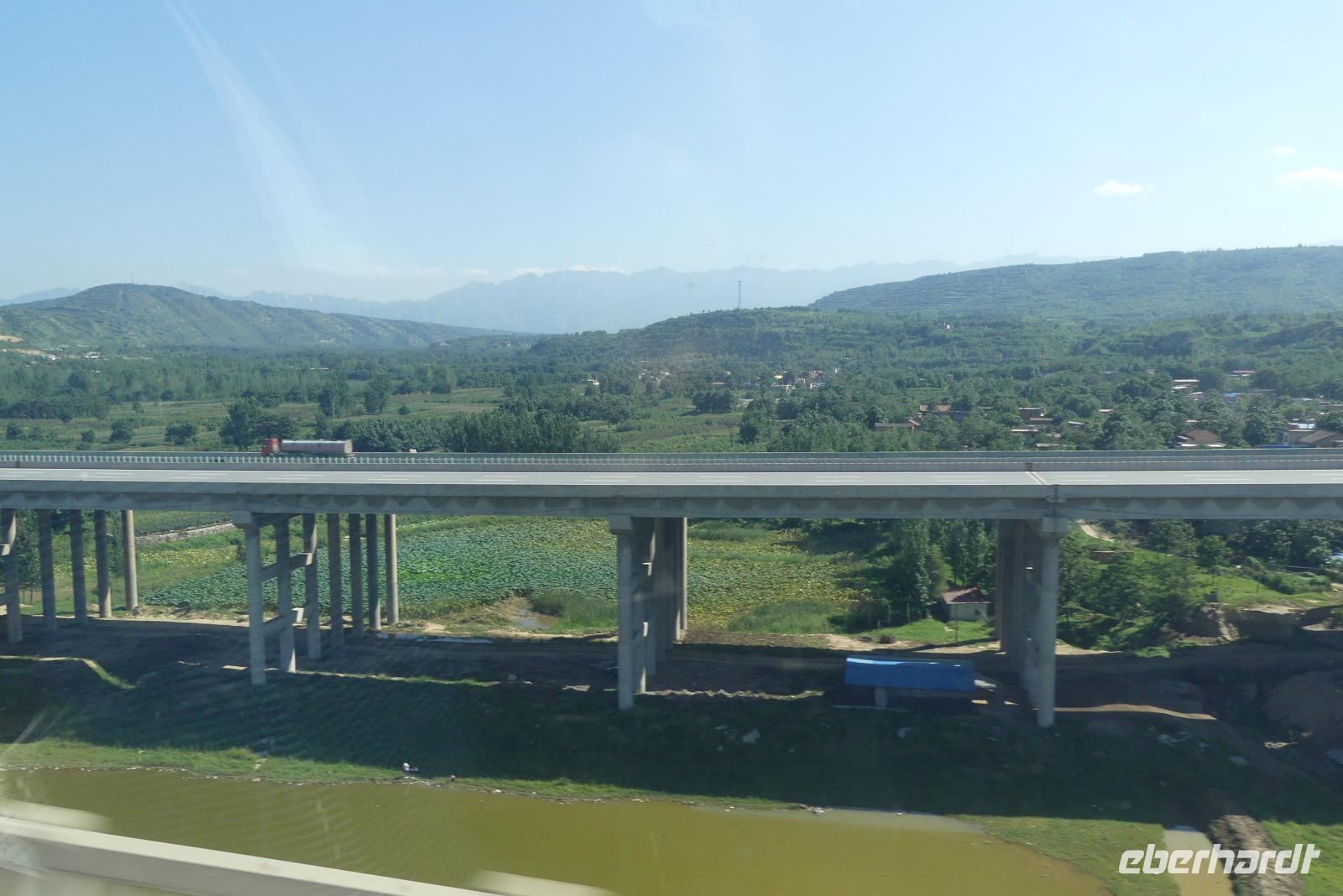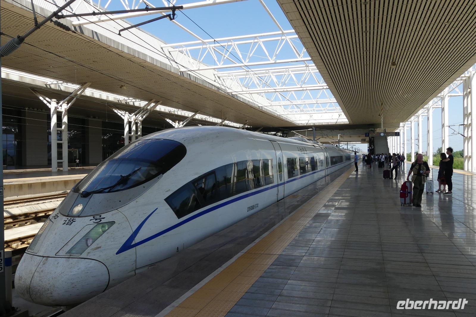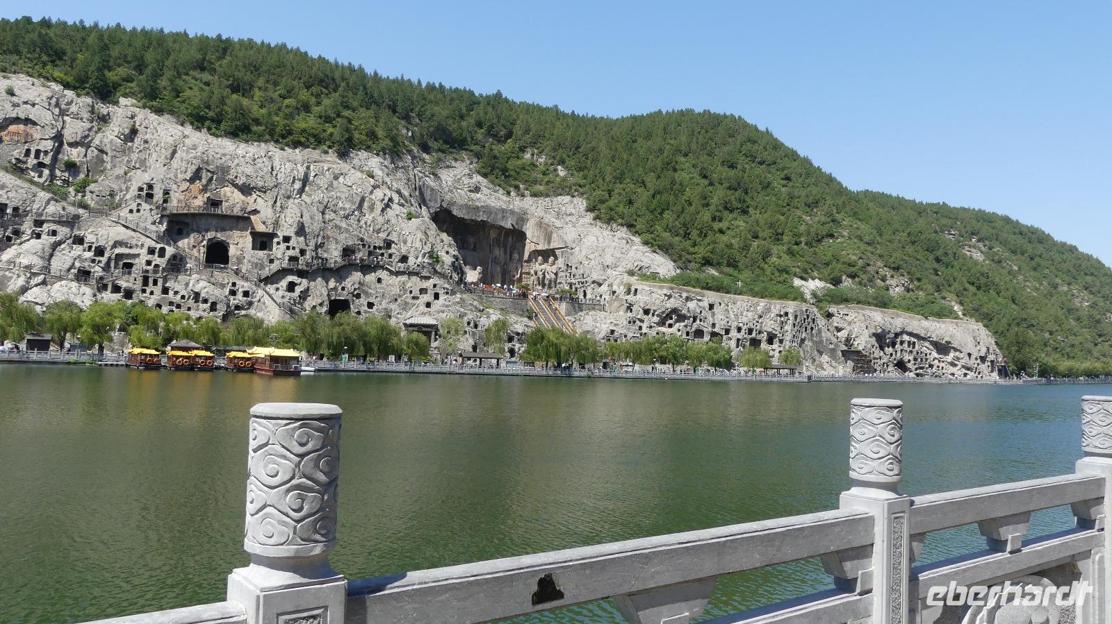 Der Tag in Luoyang beginnt mit strahlendem Sonnenschein und sommerlichen Temperaturen. Luoyang ist mit etwas über 2 Millionen Einwohnern eher eine kleinere Provinzstadt. In der Geschichte war sie jedoch mehrfach Hauptstadt Chinas. Ihre bekannteste Sehenswürdigkeit sind die Longmen-Grotten. Longmen bedeutet Drachentor. Drei Stunden lang besichtigen wir die weitläufige Anlage am Yi-Fluss. Ca. 100.000 steinerne Buddhafiguren in Größen von 2 cm bis 17 m soll es hier gegeben haben. Leider sind während der Kulturrevolution viele Figuren zerstört wurden. Andere befinden sich heute in Museen. Höhepunkt der auf der UNESCO-Liste stehenden Grotten ist Fengxian Si mit dem größten Buddha von 17 Metern und weiteren schönen Figuren, wie den Bodhisattvas und den grimmig schauenden Wächtern. Besonders gefällt mir der Blick auf die Grotten von der Brücke des Yi-Flusses und dem gegenüberliegenden Ostufer. Mit vielen Buddhafotografien im Kasten fahren wir schließlich mit E-Mobilen zurück zum Bus. Es geht weiter zum Bahnhof, wo wir uns von unserem sehr netten Reiseleiter Li verabschieden. Dann gleiten wir mit 300 km/h im modernen Schnellzug Richtung Xi´an. Für die 360 km benötigen wir gerade mal 78 Minuten, in denen wir durch eine schöne grüne Landschaft, meistens landwirtschaftlich genutzt, fahren. So schnell der Zug auch ist, an den Bahnhöfen selbst zieht es sich hin. So brauchen wir vom Bahnsteig bis zum Bus noch eine halbe Stunde.