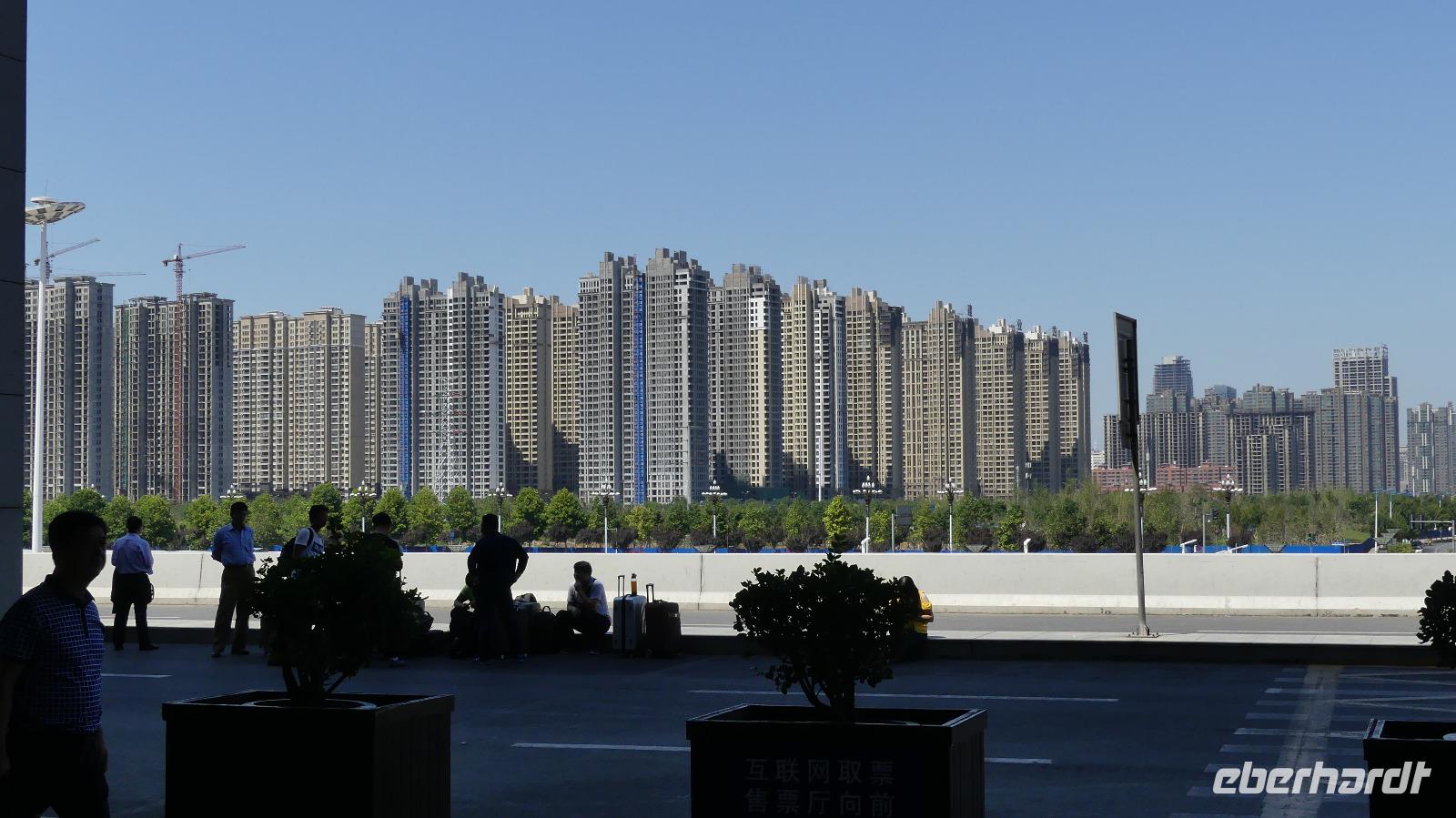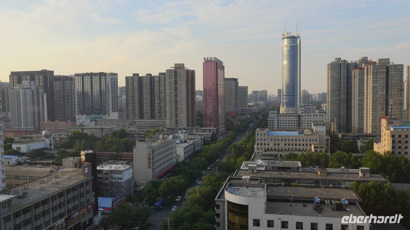 Am Morgen empfängt uns der örtliche Reiseleiter Li am Bahnhof von Zhengzhou. Von der 10 Millionen Einwohner zählenden Hauptstadt der Provinz Henan am Gelben Fluss sehen wir hautsächlich langweilige Wohnblöcke. Li meint, dass in Zhengzhou wohl die Hälfte aller Smartphones weltweit gebaut werden. Im Zhengzhou Cheered Hotel wartet auf uns ein erstklassiges Frühstücksbuffet. Im Laufe des Vormittags erreichen wir dann das legendäre Shaolin-Kloster. Schon bei der Anfahrt sehen wir in der Stadt viele Kinder auf Plätzen von Kungfuschulen. Etwa 100.000 Kinder aus ganz China werden hier in den waffenlosen Kampfküsten ausgebildet. Vor dem Kloster dann begegnen wir gleich ganzen Hundertschaften von Schülern in ihren schwarz-roten Shaolin-Trainingsanzügen. Das berühmte buddhistische Kloster schauen wir uns natürlich auch an. Nebenan befindet sich im sogenannten Pagodenwald der Mönchsfriedhof mit über 200 verschiedenen Grabpagoden.