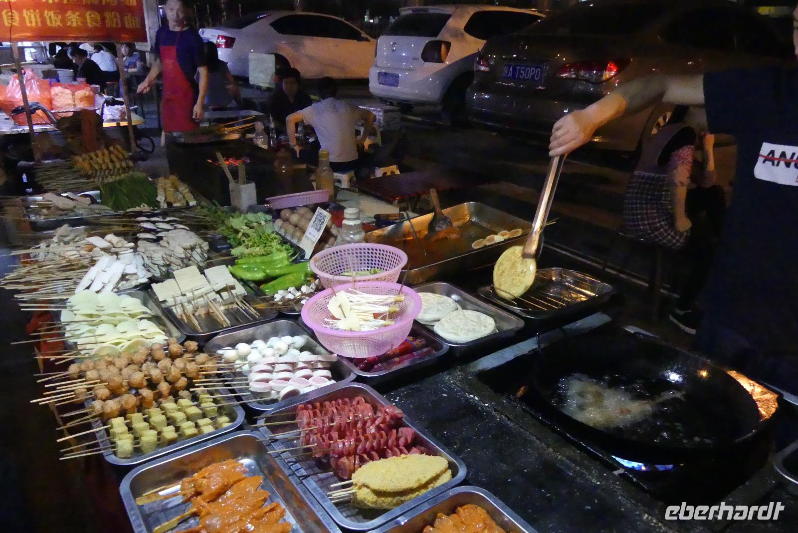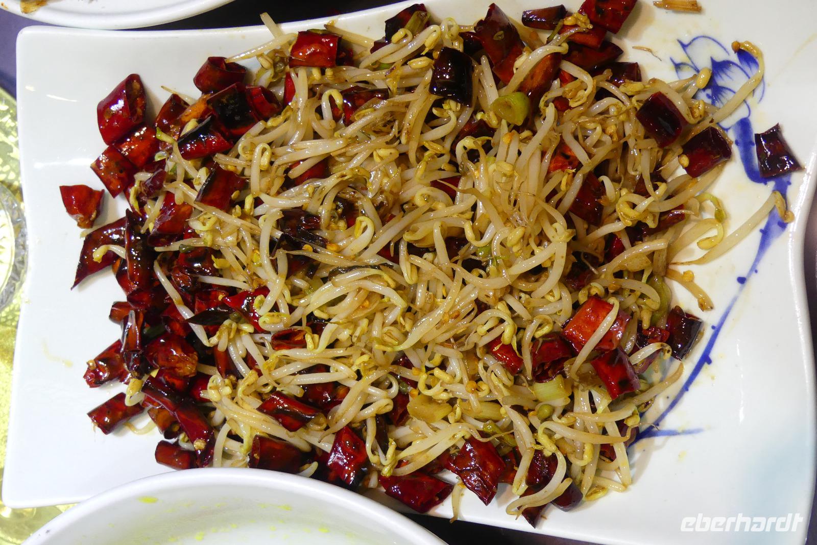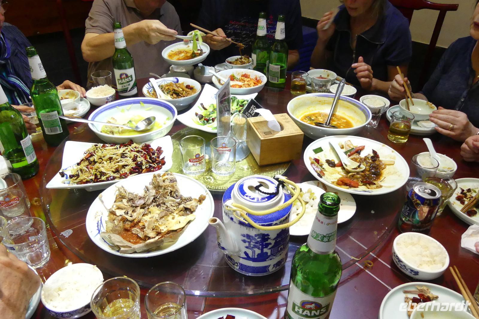 Da wir beim Mittagessen so gute Erfahrungen gemacht haben, kehren wir am Abend gleich nochmal in das gleiche Restaurant ein. Am runden Tisch mit der Drehglasscheibe gibt es wieder neue Gerichte kennenzulernen, oft gut mit Chili gewürzt. Mit unseren Bambusstäbchen machen wir Fortschritte bei der Nahrungsaufnahme - ein besonders gutes Training ist das Aufnehmen von Erdnüssen...