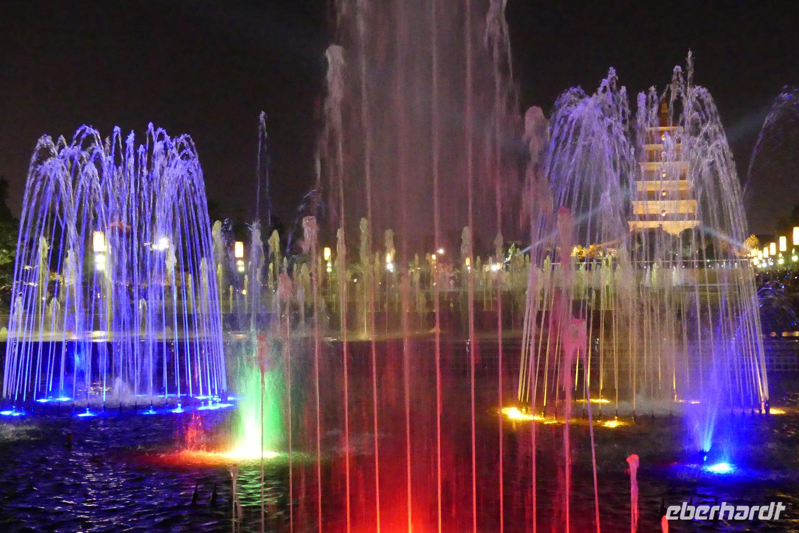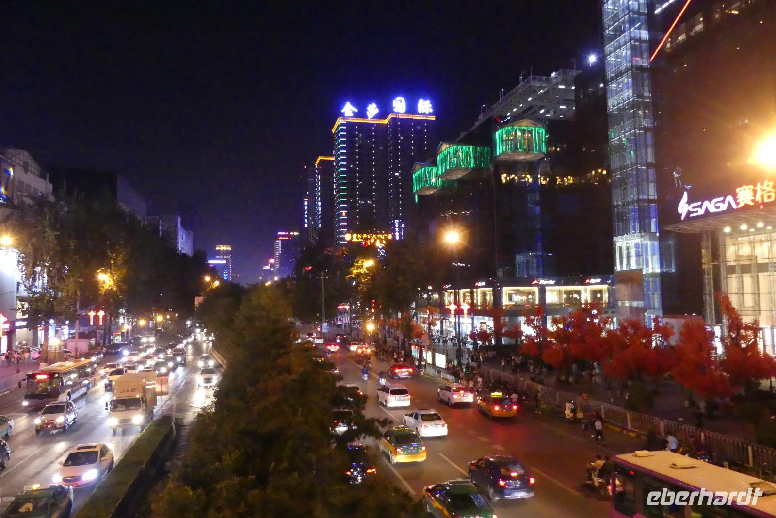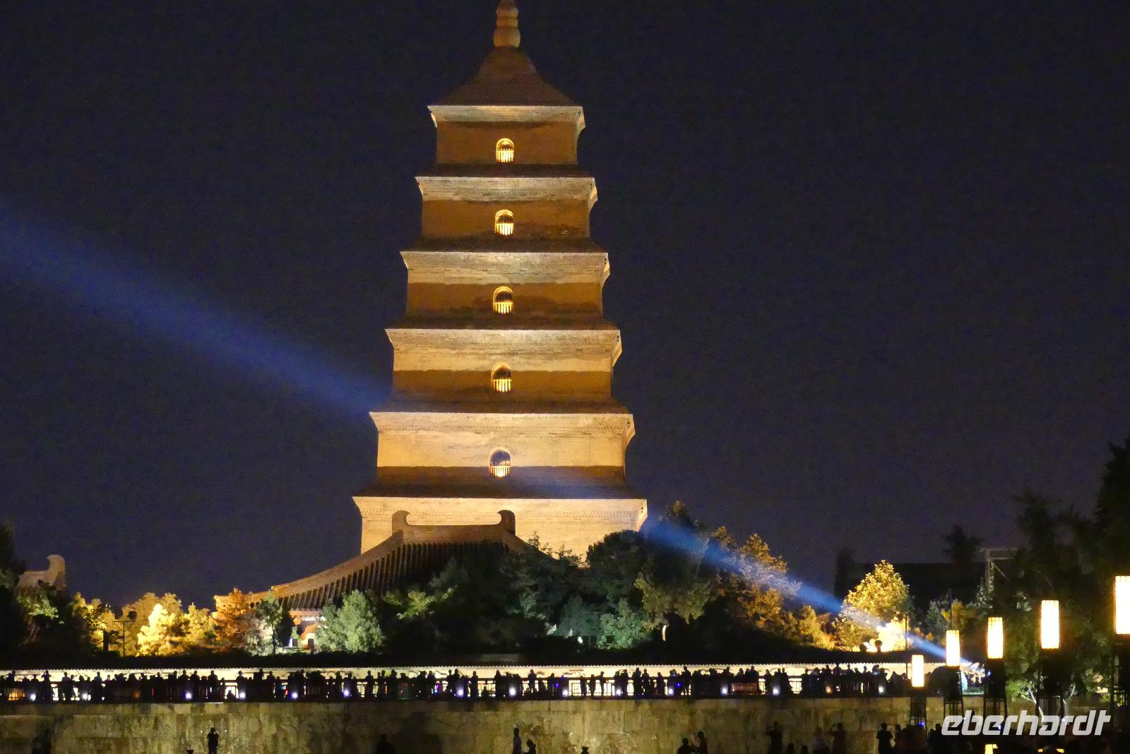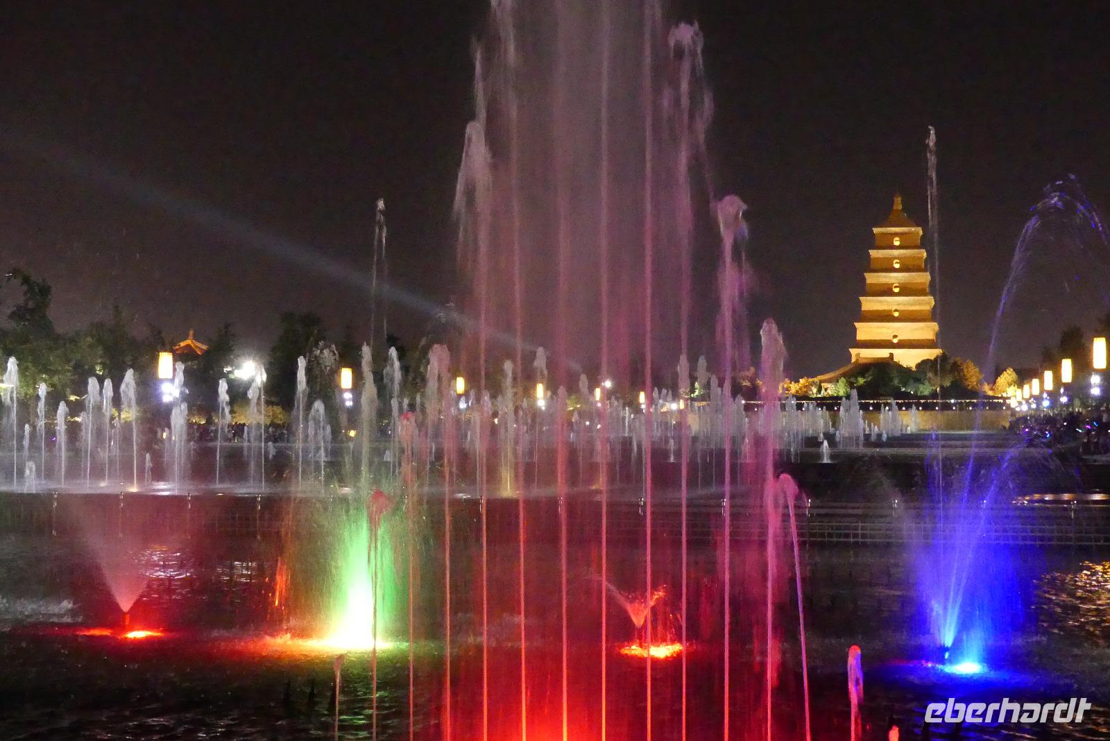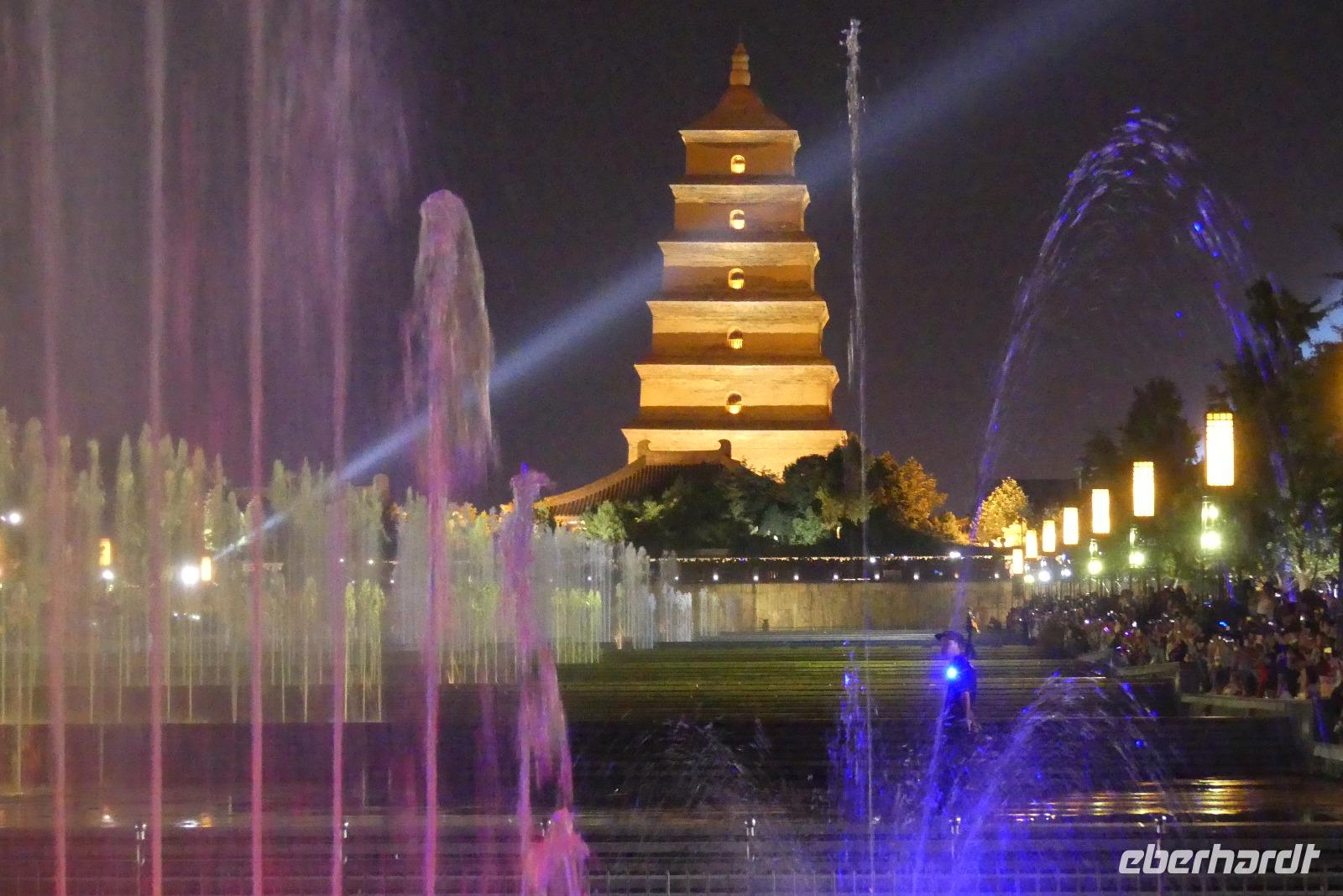 Unser Hotel liegt zentral an einer Geschäftsstraße. Nach dem Einchecken gehen wir zum „Chinesen um die Ecke" Abendessen. Anschließend fahren wir mit dem Linienbus drei Stationen zur Wildganspagode, wo 21.00 Uhr eine der größten Lichtershows Asiens stattfindet. Die vor der Pagode stattfindenden Wasserspiele sind mit Musik untermalt und natürlich auch schön bunt. Zurück zum Hotel laufen wir so 2-3 Kilometer entlang der belebten Straße mit Geschäften und kleinen mobilen Garküchen.