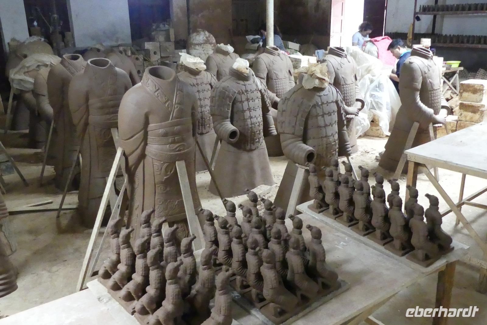 Auf der Fahrt zur Ausgrabungsstätte der Terrakottaarmee halten wir an einer Manufaktur, welche Terrakottafiguren in verschiedenen Größen und Motiven herstellt. Wir erfahren wie man anhand von Frisuren/Kopfbedeckungen Soldaten, Beamte und Generäle unterscheiden kann.