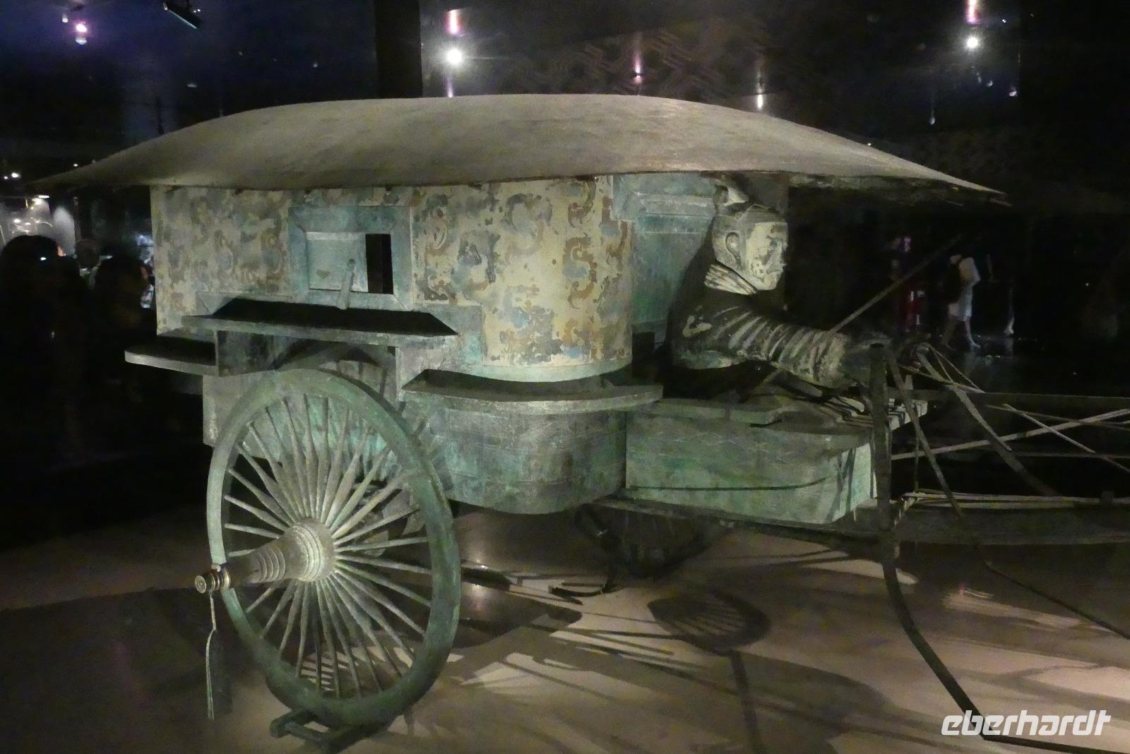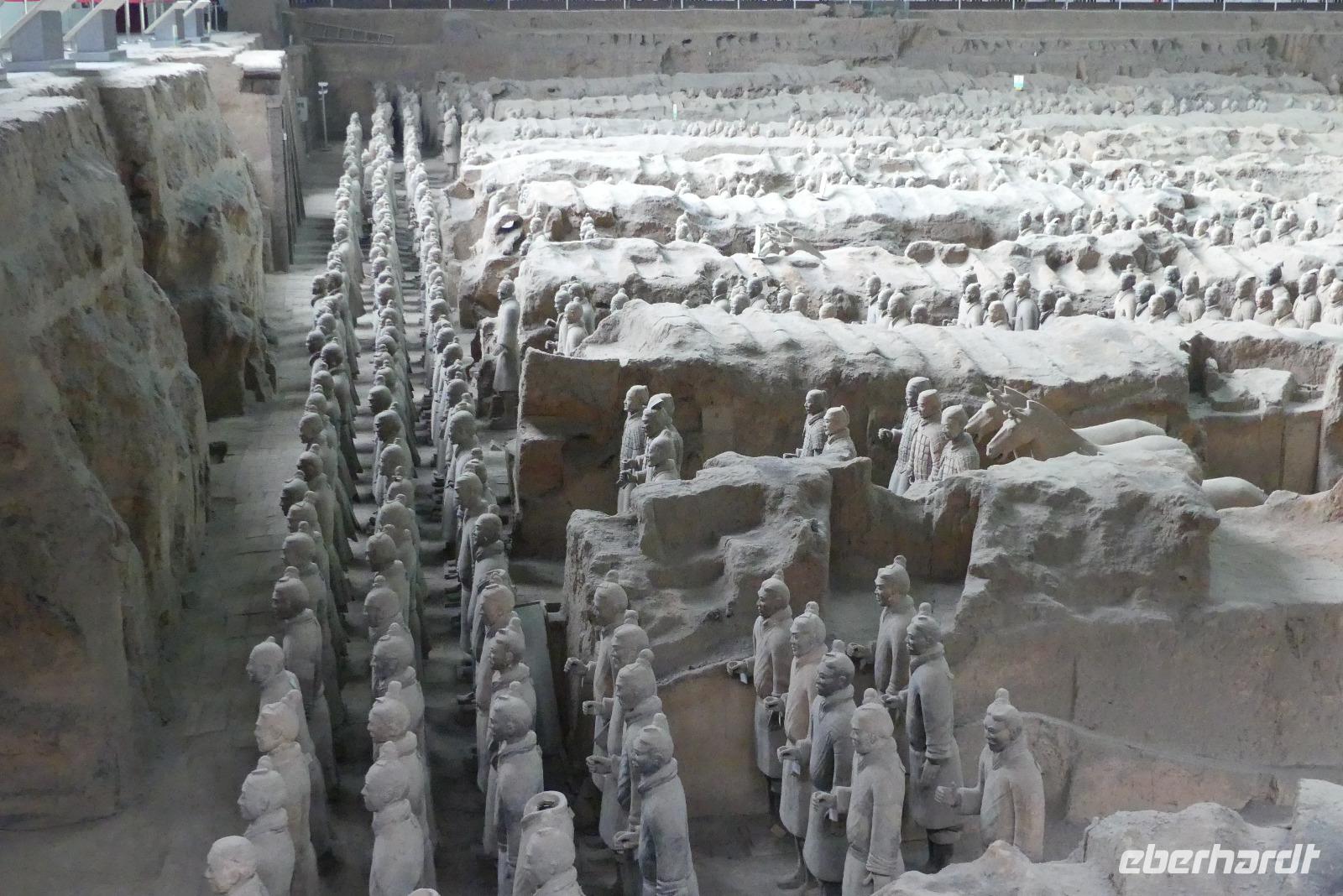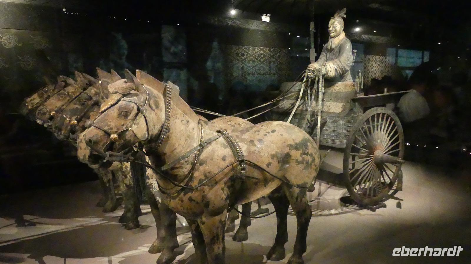 Erst 1974 wurden die ersten Terrakottasoldaten entdeckt, ganz zufällig von Bauern, die einen Brunnen graben wollten. Bis dahin wußte niemand von der Existenz dieser Armee. Drei Ausgrabungsstätten sind heute mit riesigen Hallen überbaut. In der Halle 1 sehen wir die meisten Terrakottafiguren und wir können uns ein Bild machen, wie die Figuren unter der Erde angeordnet wurden. Auf Archäologen wartet hier noch viel Arbeit, denn große Bereiche sind noch gar nicht ausgegraben und das Zusammenpuzzeln zerbrochener Funde ist auch sehr aufwendig. Nach der Besichtigung der weiteren Hallen gibt es abschließend noch ein archäologisches Highlight im Museum: ein restaurierter bronzener Vierspänner gefolgt von einem zweiten Gespann. Diese Grabbeigabe des Kaisers wurde erst 1980 entdeckt.