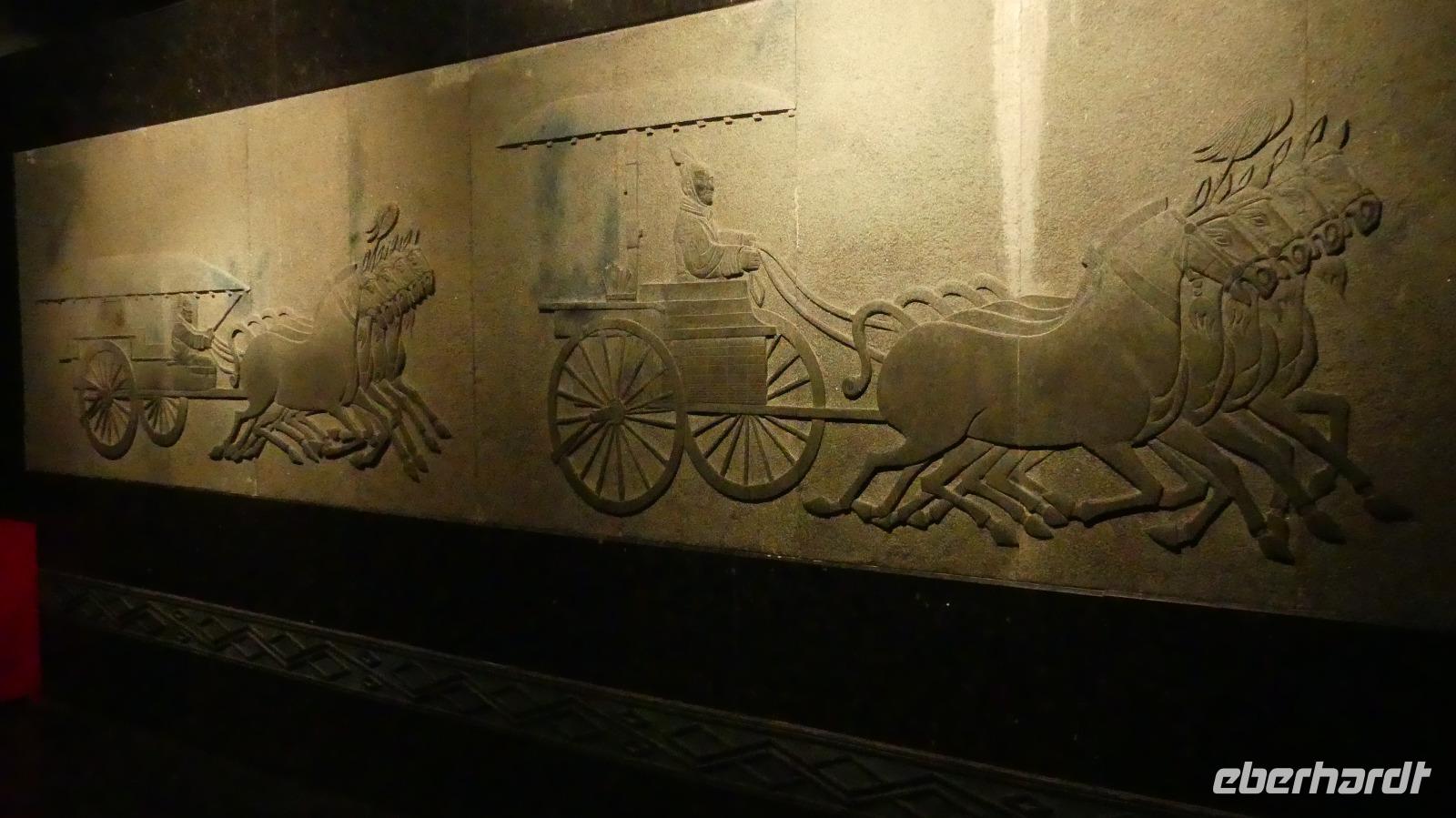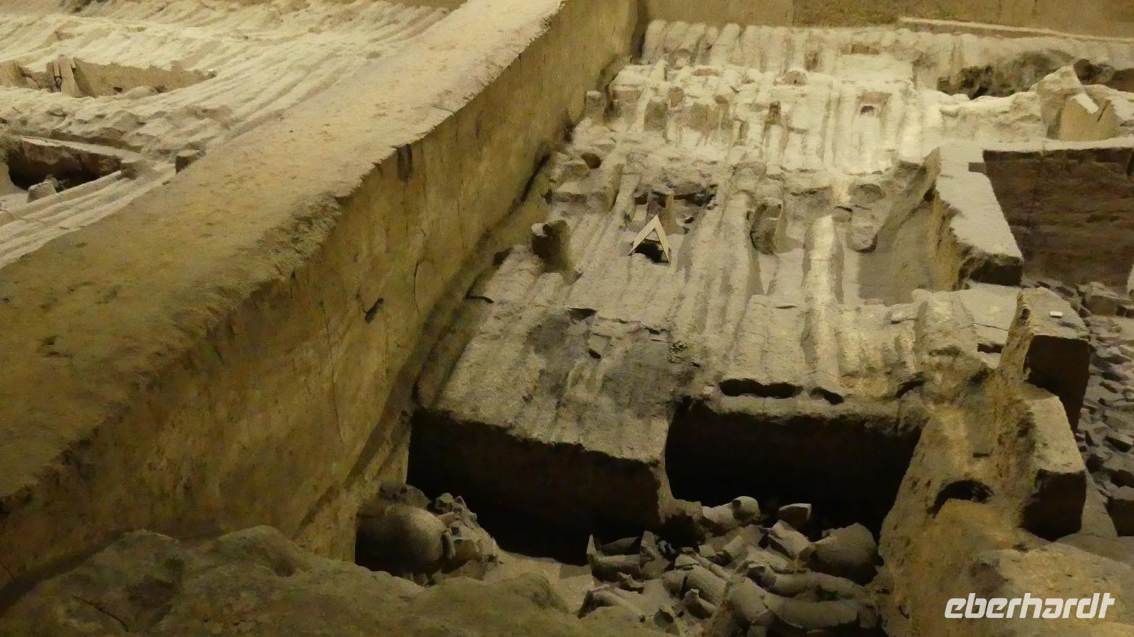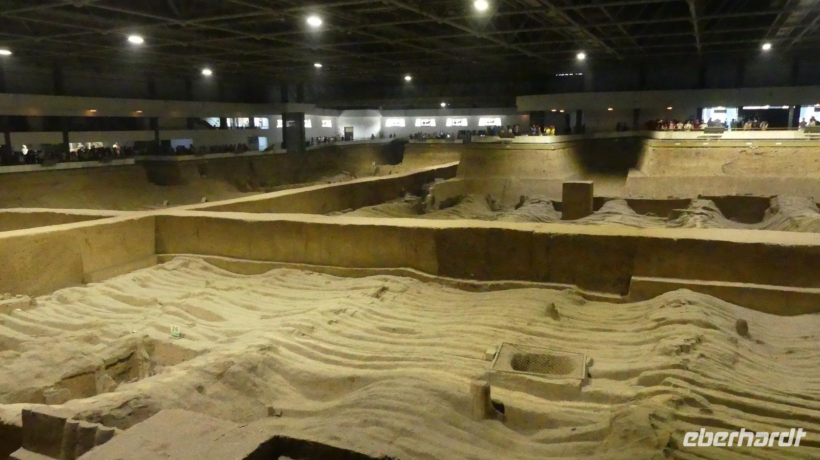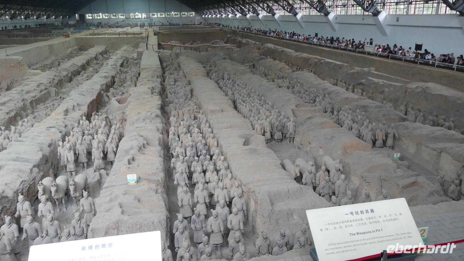 Erst 1974 wurden die ersten Terrakottasoldaten entdeckt, ganz zufällig von Bauern, die einen Brunnen graben wollten. Bis dahin wußte niemand von der Existenz dieser Armee. Drei Ausgrabungsstätten sind heute mit riesigen Hallen überbaut. In der Halle 1 sehen wir die meisten Terrakottafiguren und wir können uns ein Bild machen, wie die Figuren unter der Erde angeordnet wurden. Auf Archäologen wartet hier noch viel Arbeit, denn große Bereiche sind noch gar nicht ausgegraben und das Zusammenpuzzeln zerbrochener Funde ist auch sehr aufwendig. Nach der Besichtigung der weiteren Hallen gibt es abschließend noch ein archäologisches Highlight im Museum: ein restaurierter bronzener Vierspänner gefolgt von einem zweiten Gespann. Diese Grabbeigabe des Kaisers wurde erst 1980 entdeckt.