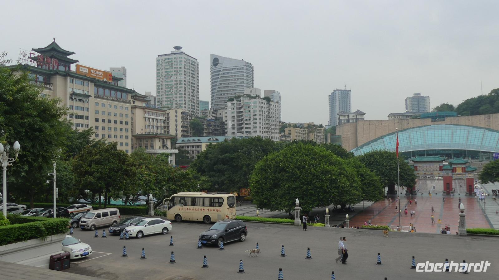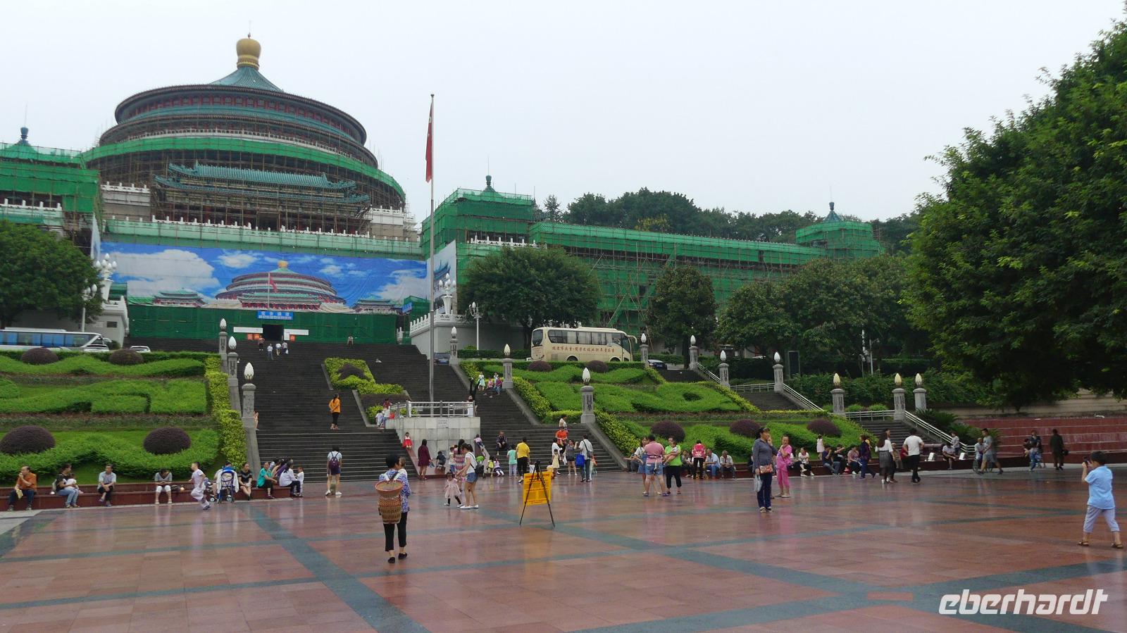 Vormittags können wir ausschlafen. Bis 11.00 haben wir Freizeit. Mit einem Airbus A 320 der Tianjin Airlines fliegen wir von Xi´an Yang nach Chongqing. Äußerst kreativ gestaltet ist der Film zu den Sicherheitshinweisen an Bord. Diese sind geschickt in einen Stadtrundgang zweier Stewardessen eingebaut. Nach einer und angenehmen Flugstunde landen wir Nachmittag am ganz neuen Terminal 3 in Chongqing. Die Stadt gilt als größte Chinas und je nach Sichtweise mit 32 Millionen Einwohnern als größte der Welt. Da aber das gesamte Verwaltungsgebiet von der Fläche Österreichs mit ländlichen Gebieten und kleineren Orten betrachtet wird, kann ich mich dieser Darstellung nicht anschließen. Die Zeit bis zur Einschiffung nutzen wir für eine Fahrt ins Zentrum und zum dortigen zentralen Platz mit der Volkskongresshalle. Lin organisiert noch schnell einen Tisch für uns für das Abendessen. Hier spüren wir, dass die regionale Küche wieder andere Besonderheiten hat, vor allem wird das Essen schärfer, weil zum Chili jetzt noch ordentlich Pfefferkörner dazukommen.