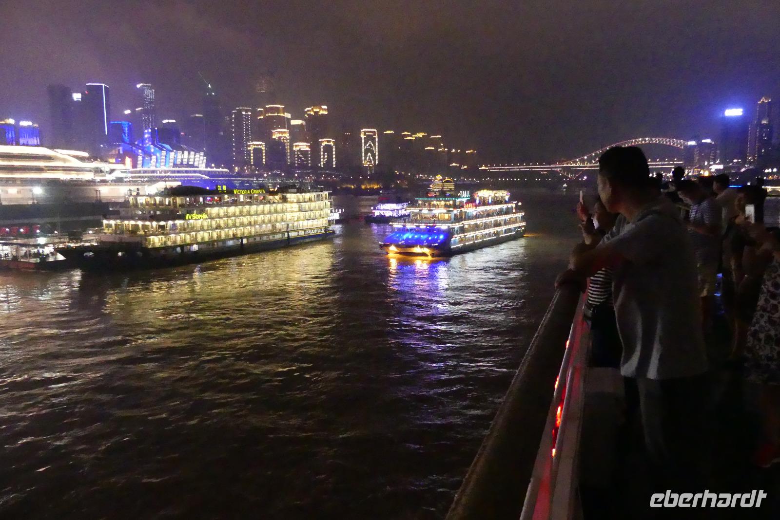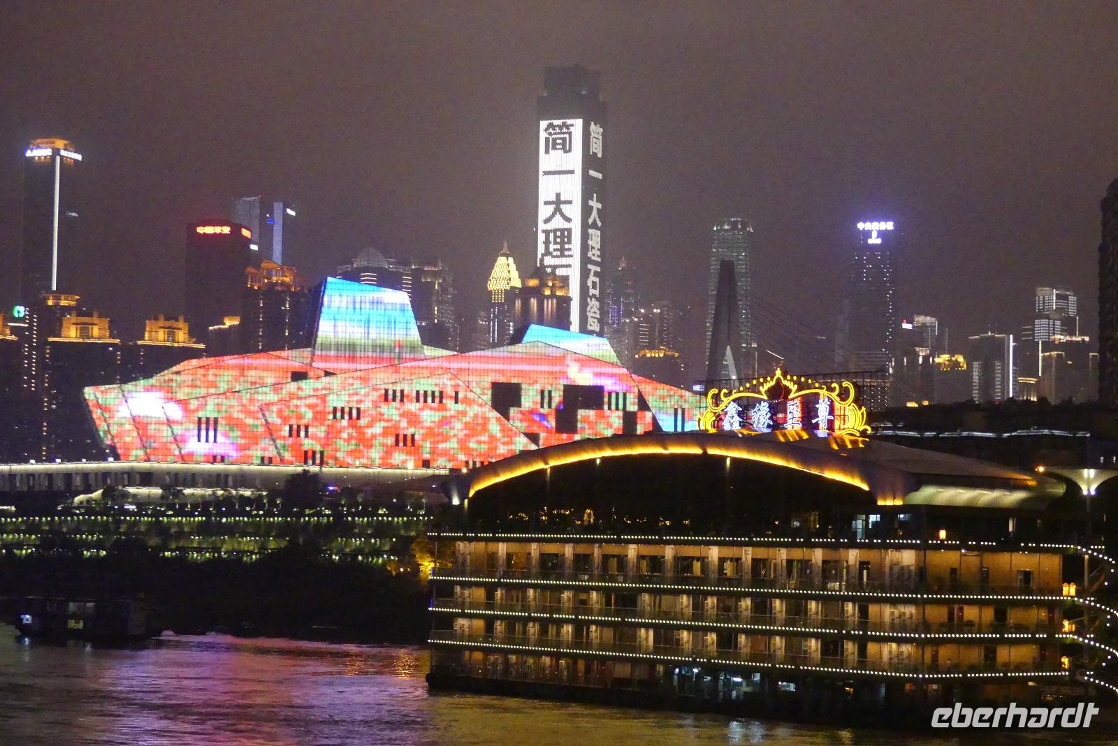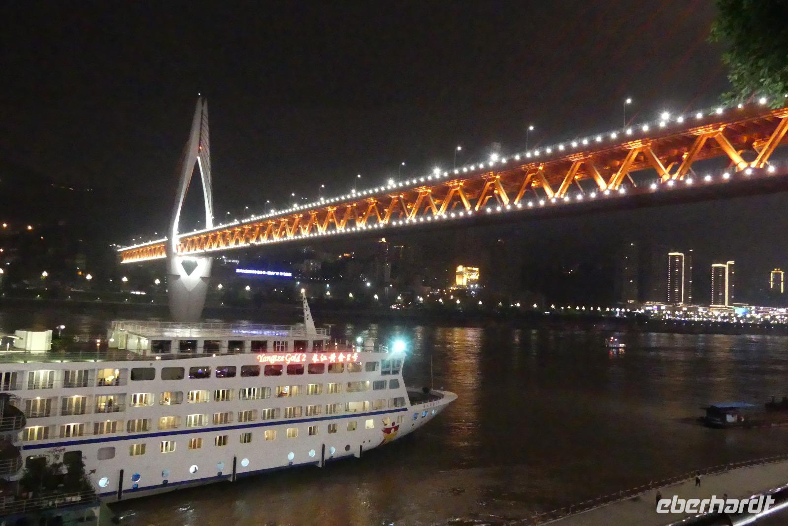 Schließlich kommen wir am Abend pünktlich auf unser Kreuzfahrtschiff, die „Yangtze Gold 2". Das Einchecken verläuft etwas umständlich und anfangs müssen wir uns natürlich erstmal orientieren. Bier für die nächsten Abende bestellen wir gleich, weil es das heute zum halben Preis gibt (nachdem wir herausgefunden haben, wie man das bestellt...). Dann können wir unsere schönen Balkonkabinen auf Deck 3 beziehen. Da unser Schiff, warum auch immer, zeitiger ablegt als geplant, geht es gleich weiter auf das Oberdeck. Die Ausfahrt aus Chongqing bei Nacht ist ein Erlebnis: die gewaltige Skyline und das futuristische Operngebäude werden in wechselnden Farben hell in Szene gesetzt. Nur merkwürdig, dass man in Deutschland den Namen dieser Stadt kaum kennt, so wie wir ja selbst vorher auch nicht.