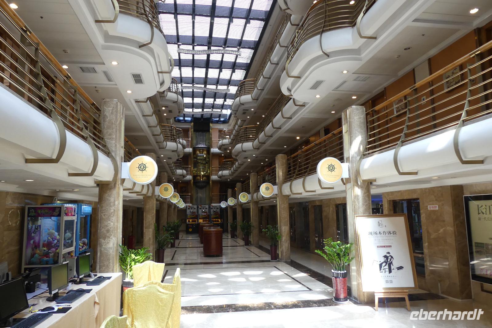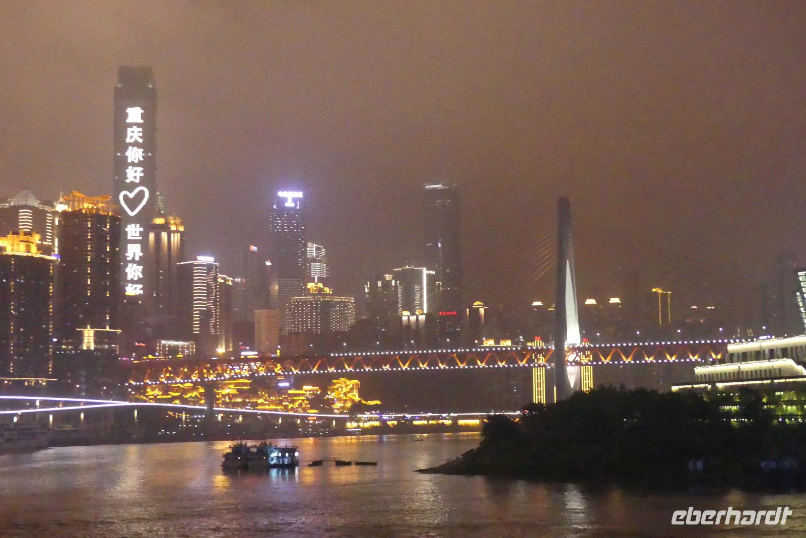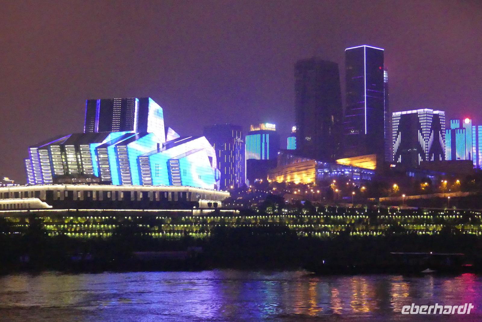 Schließlich kommen wir am Abend pünktlich auf unser Kreuzfahrtschiff, die „Yangtze Gold 2". Das Einchecken verläuft etwas umständlich und anfangs müssen wir uns natürlich erstmal orientieren. Bier für die nächsten Abende bestellen wir gleich, weil es das heute zum halben Preis gibt (nachdem wir herausgefunden haben, wie man das bestellt...). Dann können wir unsere schönen Balkonkabinen auf Deck 3 beziehen. Da unser Schiff, warum auch immer, zeitiger ablegt als geplant, geht es gleich weiter auf das Oberdeck. Die Ausfahrt aus Chongqing bei Nacht ist ein Erlebnis: die gewaltige Skyline und das futuristische Operngebäude werden in wechselnden Farben hell in Szene gesetzt. Nur merkwürdig, dass man in Deutschland den Namen dieser Stadt kaum kennt, so wie wir ja selbst vorher auch nicht.