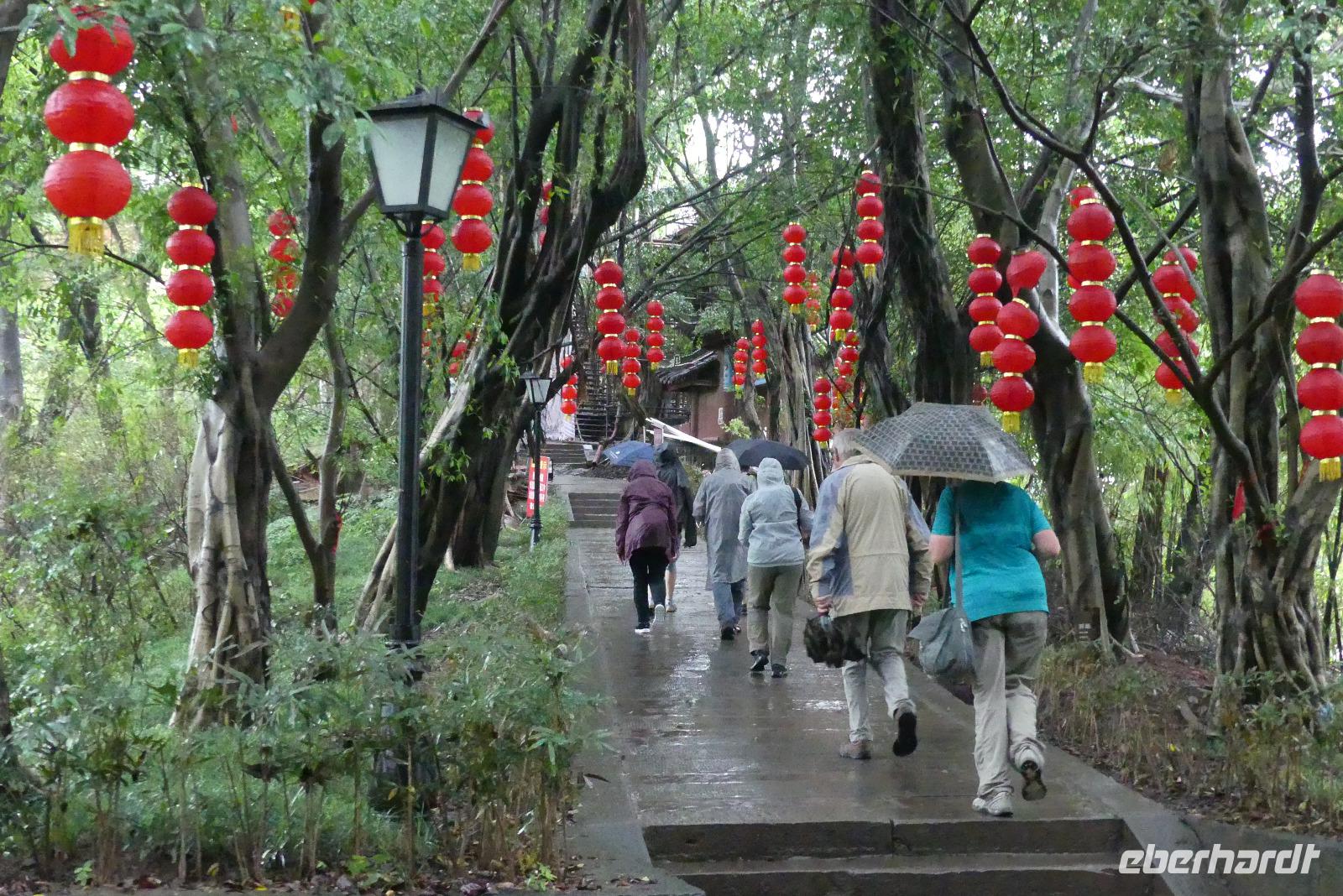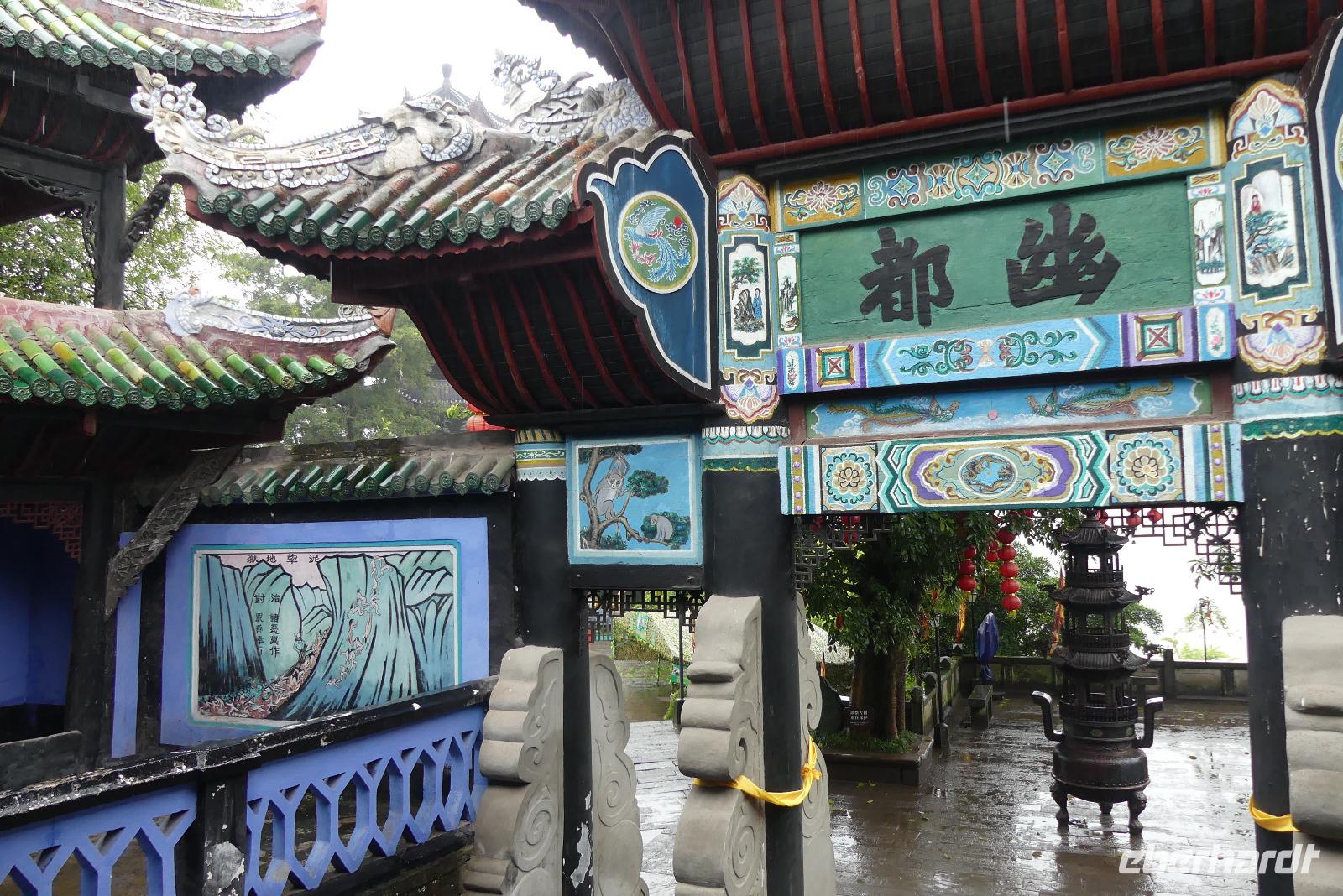 Nach dem Frühstück gehen wir an Land, um die sogenannte Geisterstadt von Fengdu zu besichtigen. Der warme Regen während des Ausfluges stört nicht sonderlich, wir können das Wetter nicht ändern und morgen soll wieder die Sonne scheinen. In der Geisterstadt steigen wir ca. 400 Stufen hoch, kommen unterwegs immer wieder an kleinen daoistischen Tempeln vorbei bis wir den Haupttempel des Höllenkönigs erreichen. Hier sehen wir überdimensionale Geisterfiguren und martialische Darstellungen dazu, welche Höllenqualen die sündigen Menschen erleiden.