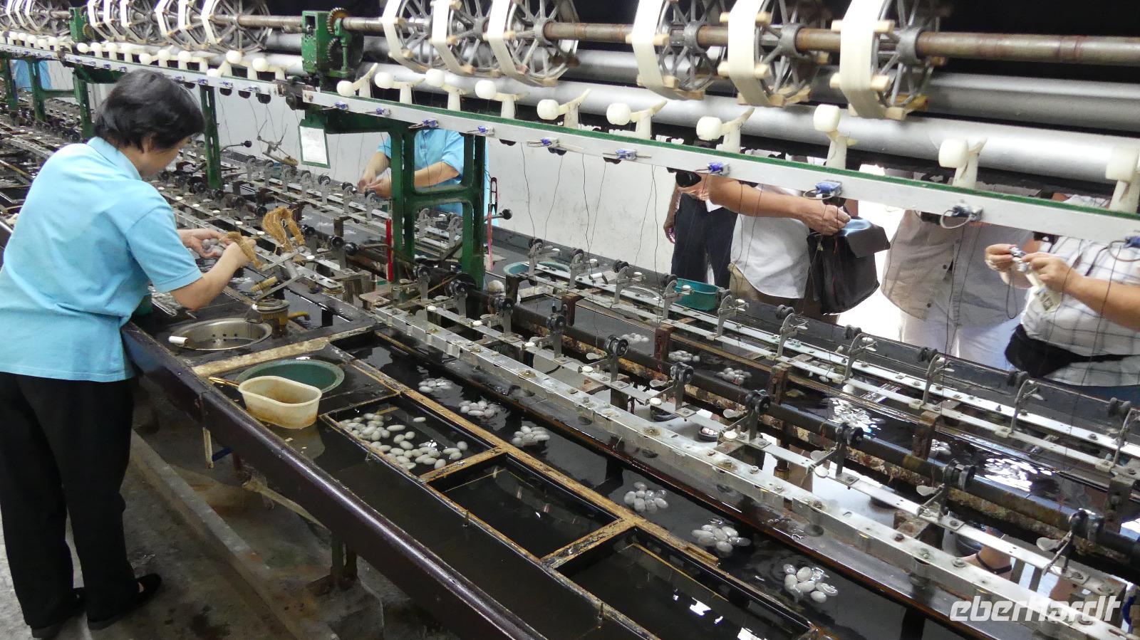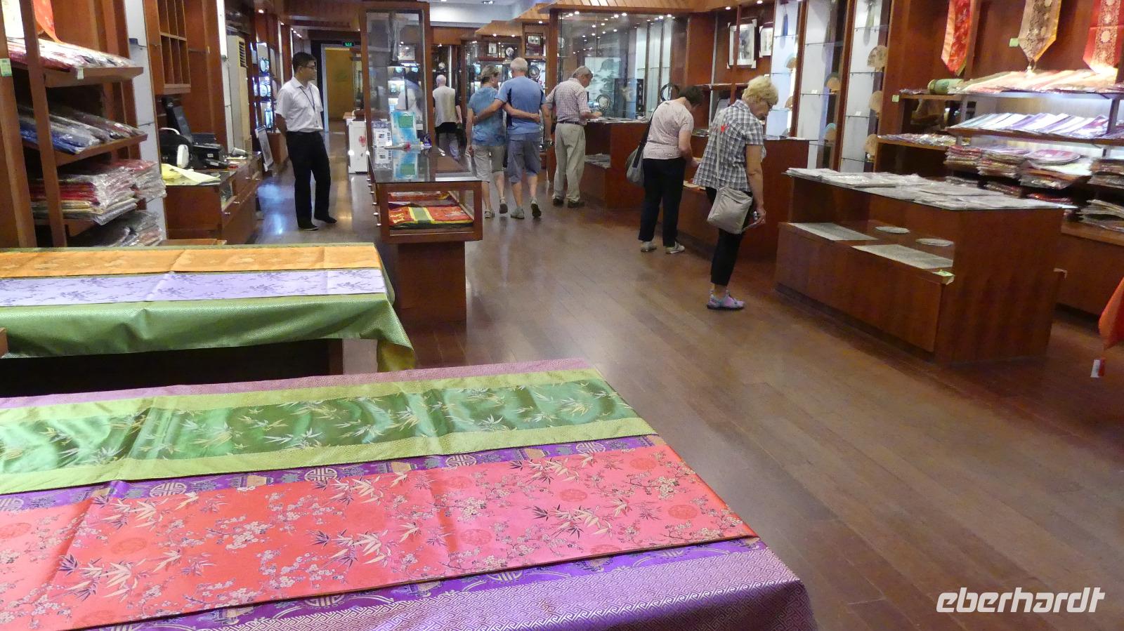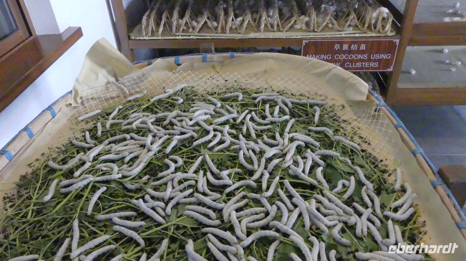In der Stadt der Kanäle steigen wir in ein Boot um, welches uns ein Stück entlang des Kaiserkanals fährt. Der Kaiserkanal hat eine Länge von über 1.800 Kilometer und führt von Peking bis nach Hangzhou. In der Seidenmanufaktur „Nummer 1" von Suzhou werden wir über die Seidenproduktion von der Raupe bis zum fertigen Produkt, zum Beispiel Bettdecken informiert. Eine Seidenraupe verzehrt in ihrem zweimonatigen Leben etwa 700 Gramm Maulbeerblätter. Ihre für die Menschen so interessanten Kokons bestehen aus einem 1.000 bis 1.300 Meter langen Seidenfaden.