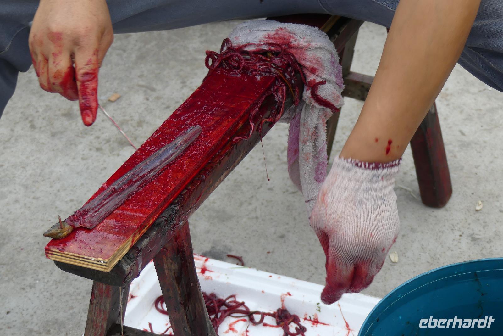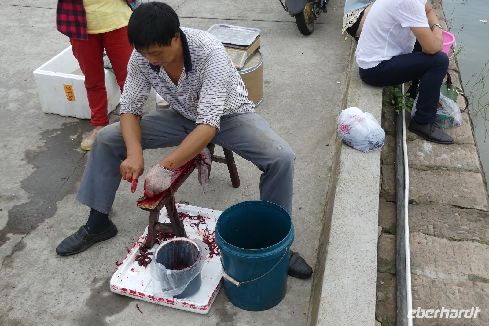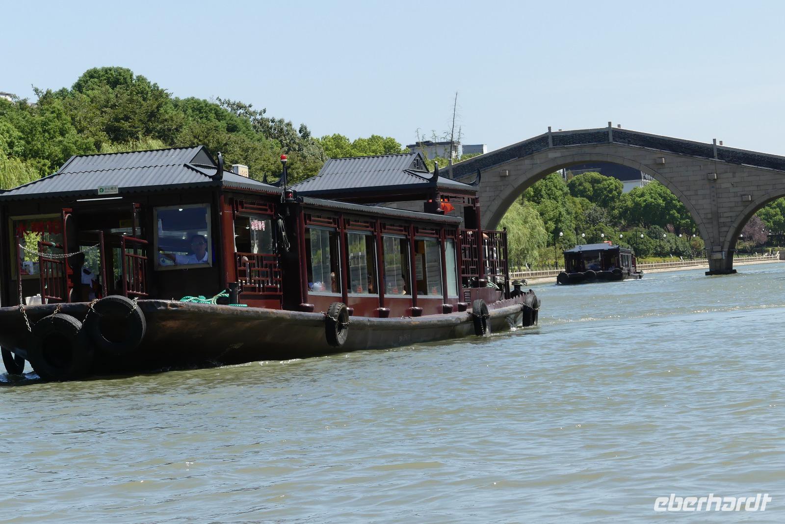 In der Stadt der Kanäle steigen wir in ein Boot um, welches uns ein Stück entlang des Kaiserkanals fährt. Der Kaiserkanal hat eine Länge von über 1.800 Kilometer und führt von Peking bis nach Hangzhou. In der Seidenmanufaktur „Nummer 1" von Suzhou werden wir über die Seidenproduktion von der Raupe bis zum fertigen Produkt, zum Beispiel Bettdecken informiert. Eine Seidenraupe verzehrt in ihrem zweimonatigen Leben etwa 700 Gramm Maulbeerblätter. Ihre für die Menschen so interessanten Kokons bestehen aus einem 1.000 bis 1.300 Meter langen Seidenfaden.