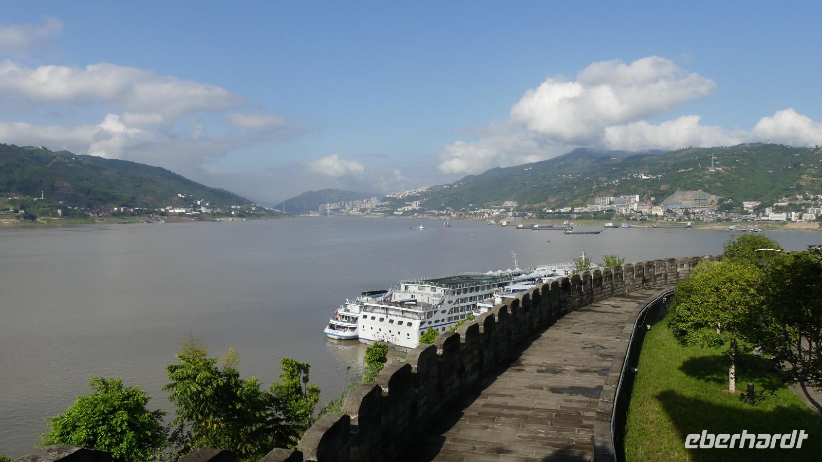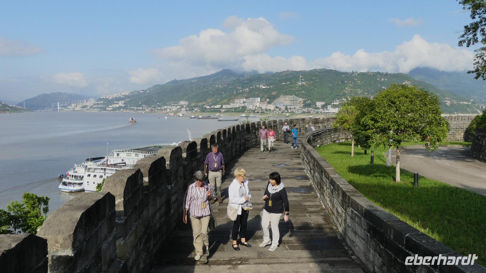 Am Morgen halten wir an dem Ort Baidicheng am nördlichen Yangtze-Ufer. Während die chinesischen Touristen einen organisierten Ausflug unternehmen, gehen wir so von Bord und schauen uns den Ort selbst an. Von der Ufermauer im Stile einer begehbaren Stadtmauer haben wir herrliche Aussichten auf den Yangtze und die umliegenden Berge.