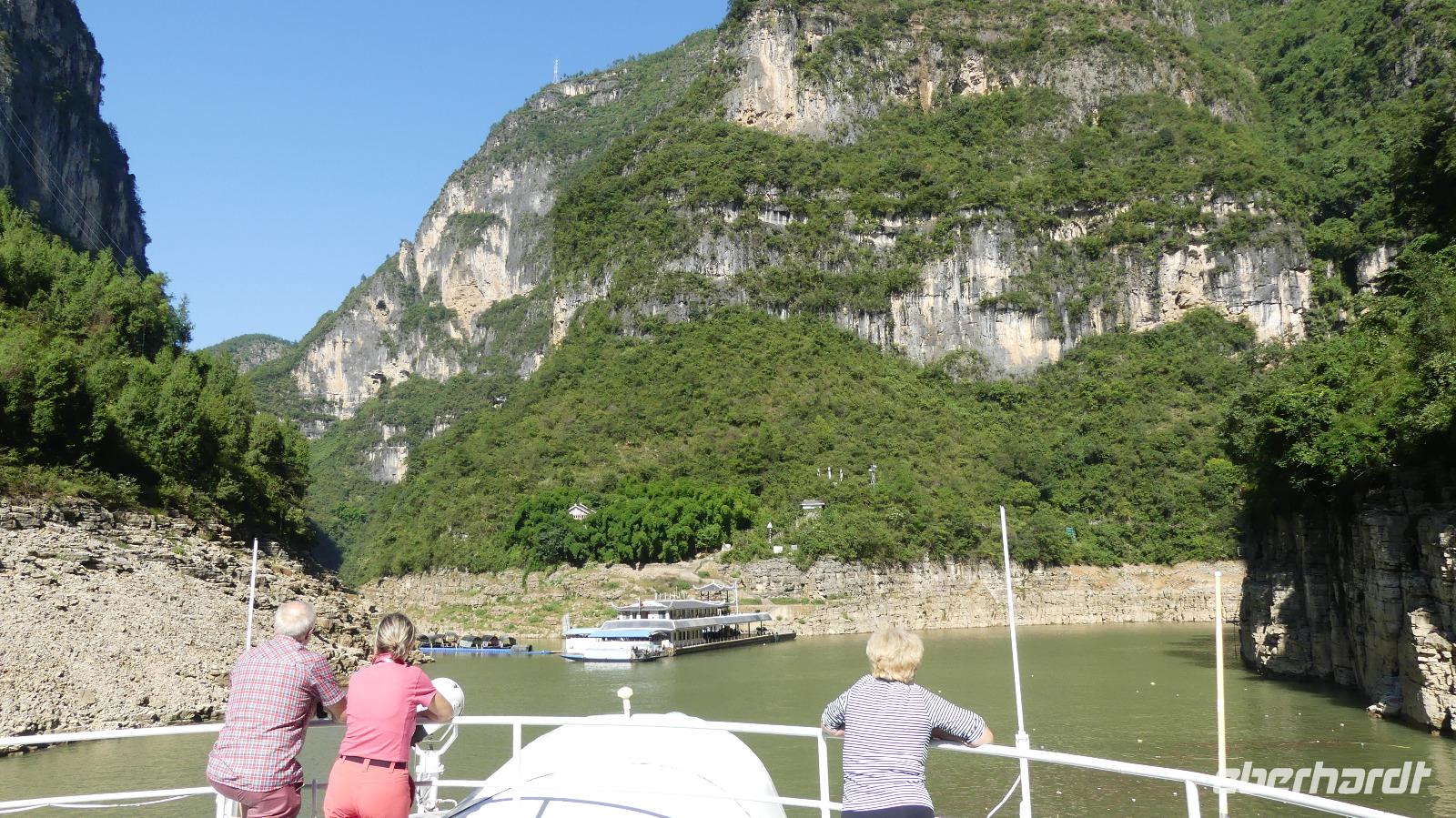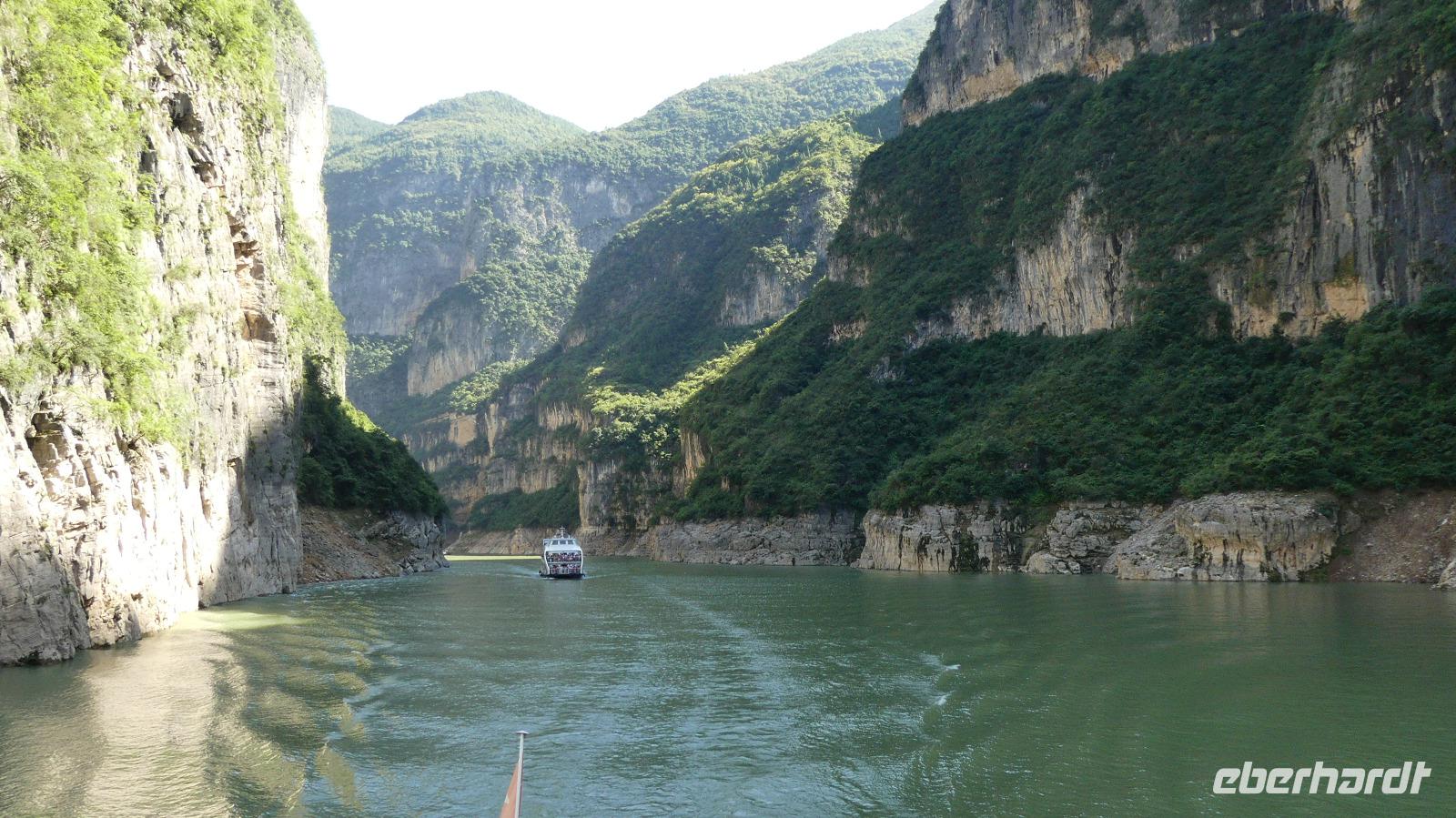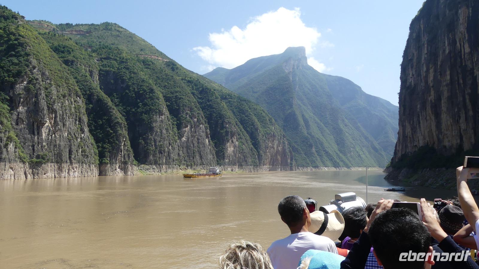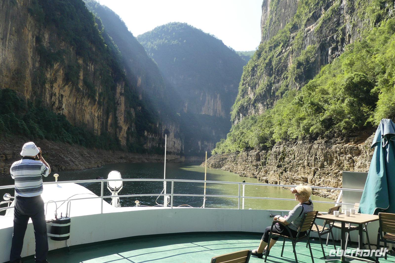 Mittags durchfahren wir bei strahlendem Sonnenschein die erste Yangtze-Schlucht mit dem Namen Qutang-Schlucht. Dieser acht Kilometer lange Abschnitt des Yangtze wird aufgrund seiner Form auch als „Blasebalgschlucht" bezeichnet und ist auf dem 10 Yuan-Geldschein abgebildet.