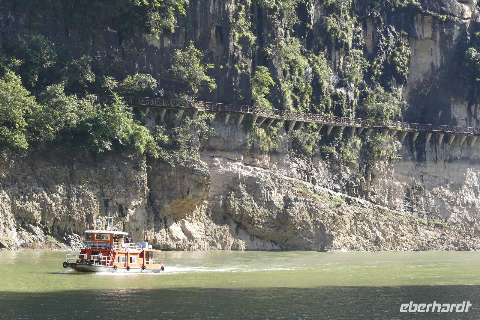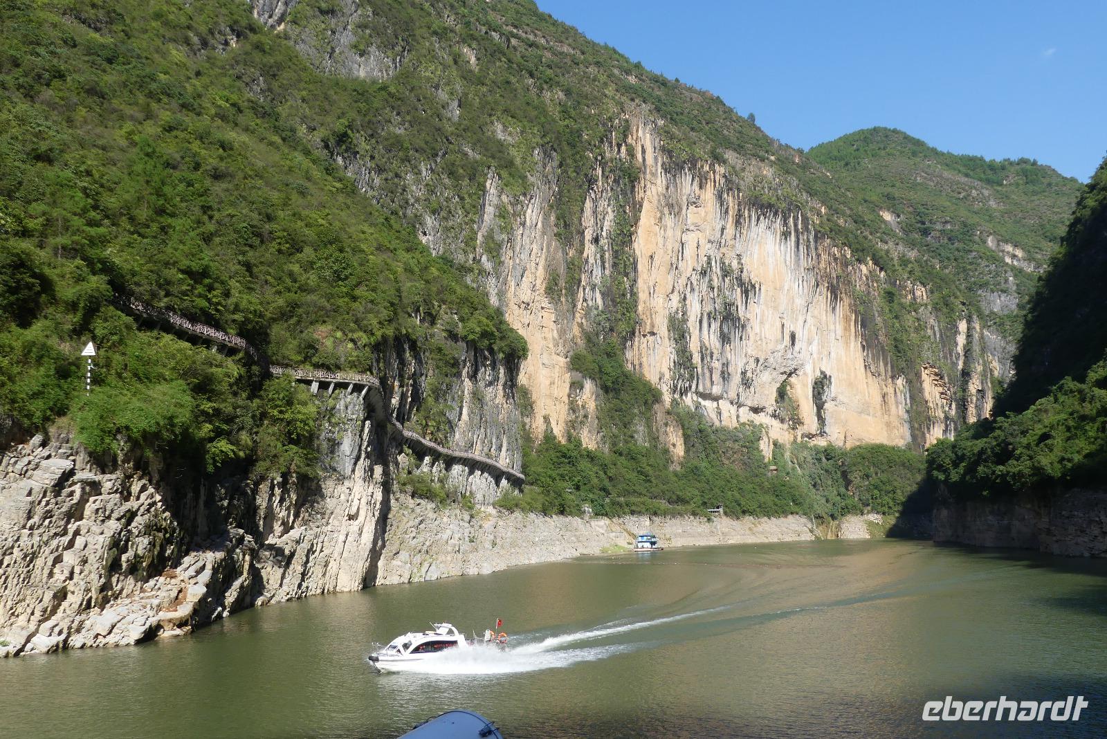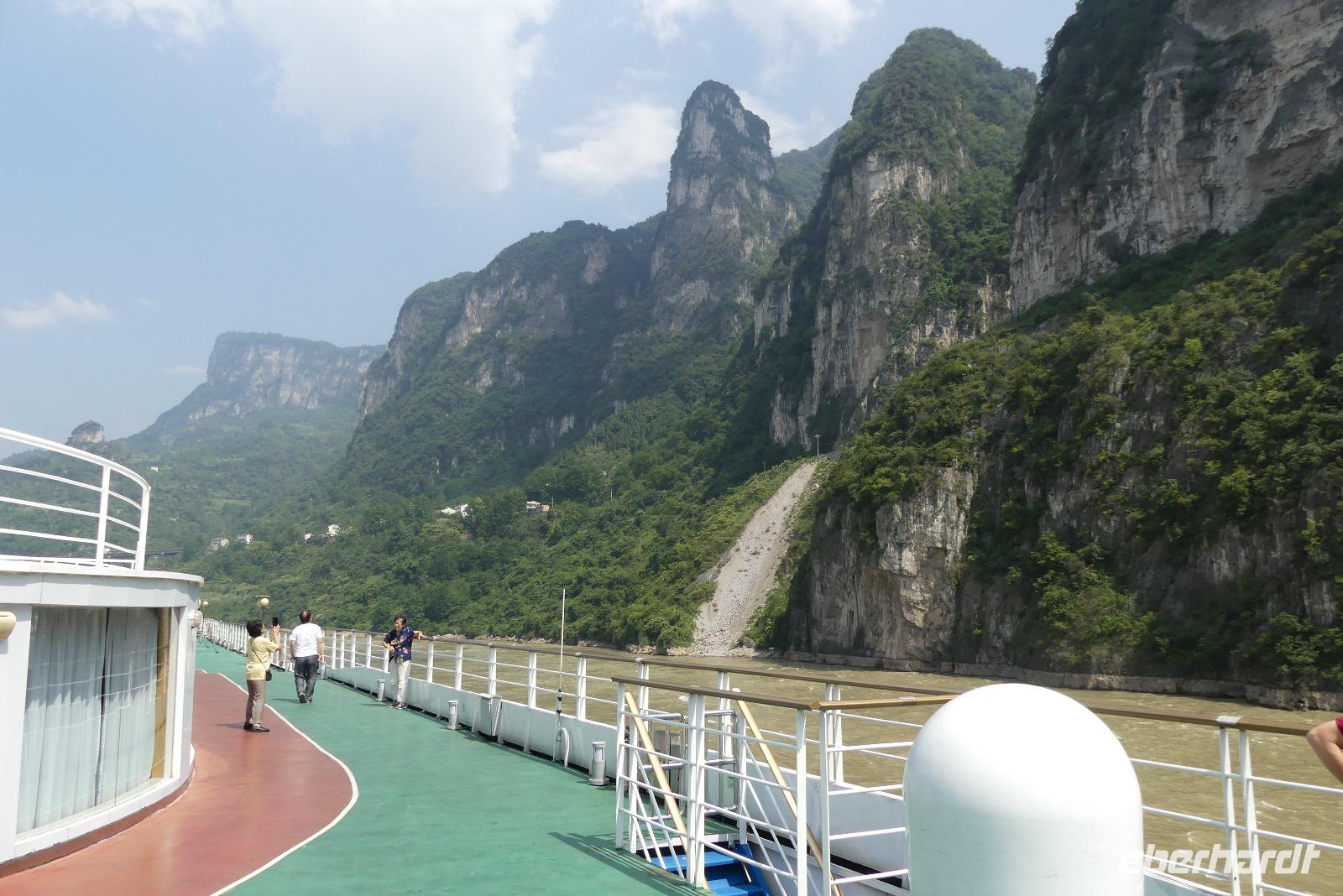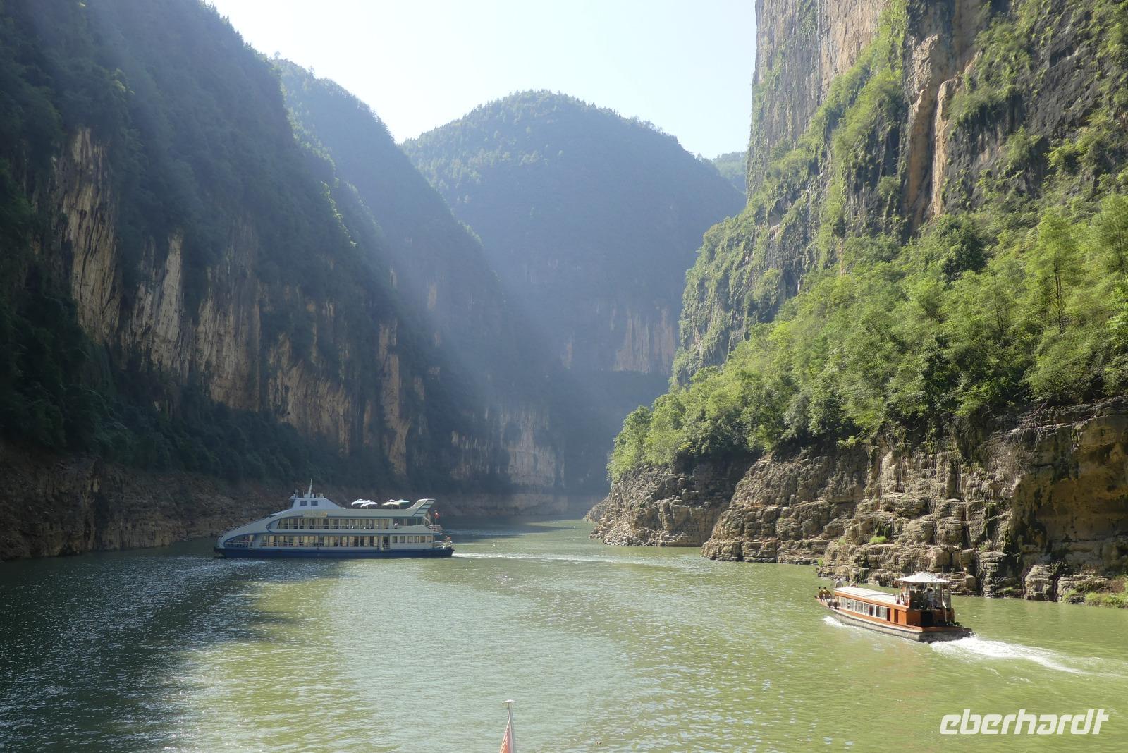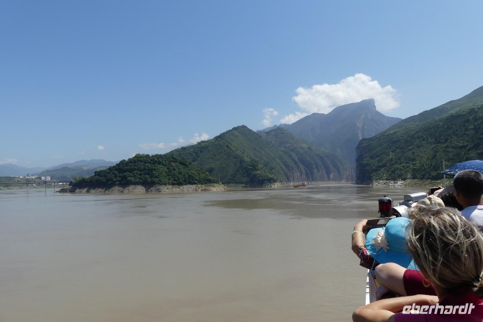 Mittags durchfahren wir bei strahlendem Sonnenschein die erste Yangtze-Schlucht mit dem Namen Qutang-Schlucht. Dieser acht Kilometer lange Abschnitt des Yangtze wird aufgrund seiner Form auch als „Blasebalgschlucht" bezeichnet und ist auf dem 10 Yuan-Geldschein abgebildet.