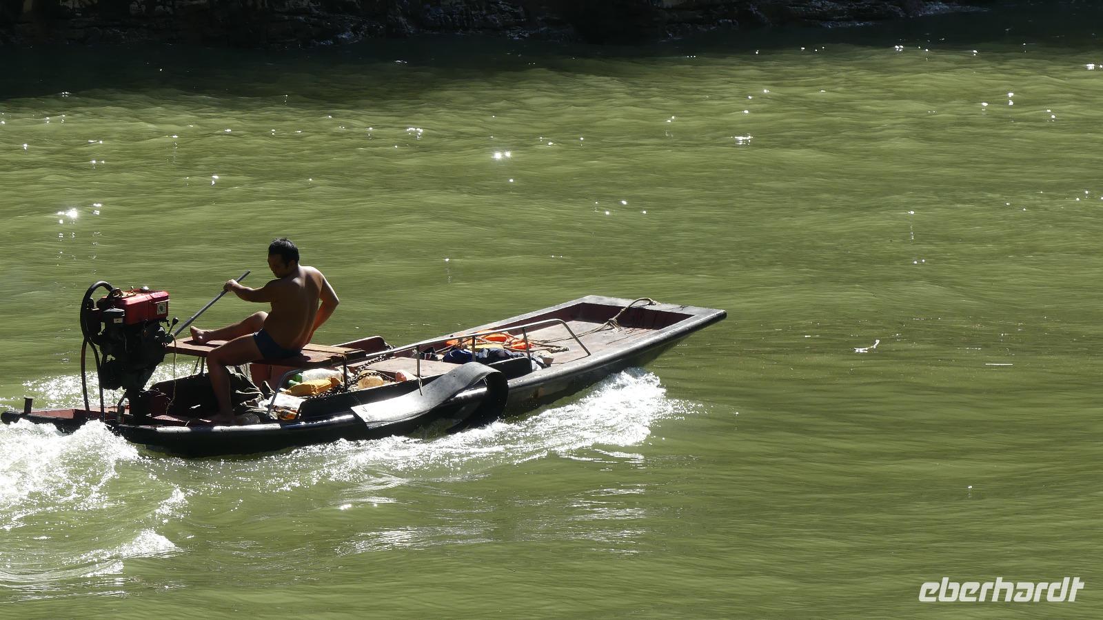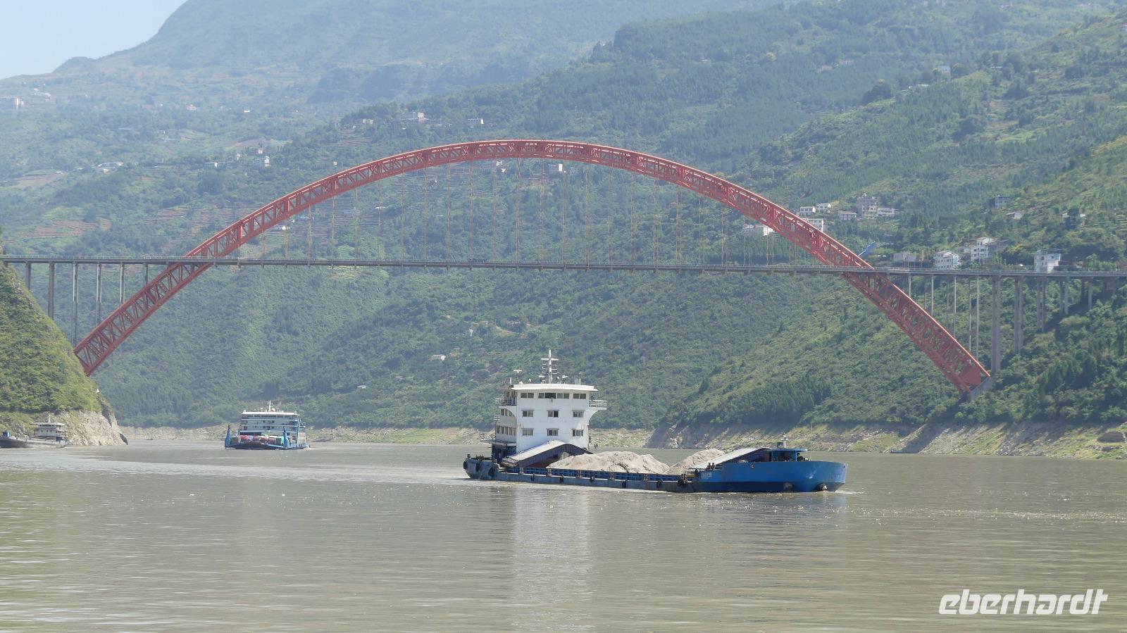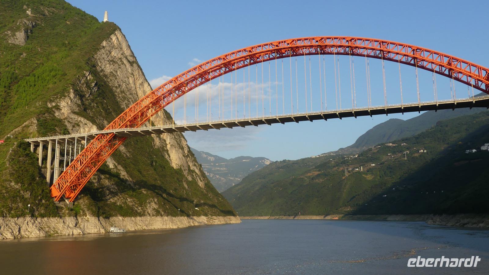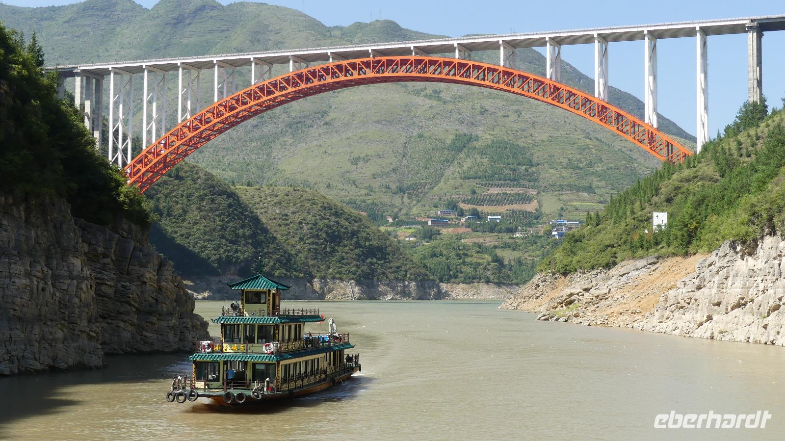 Mittags durchfahren wir bei strahlendem Sonnenschein die erste Yangtze-Schlucht mit dem Namen Qutang-Schlucht. Dieser acht Kilometer lange Abschnitt des Yangtze wird aufgrund seiner Form auch als „Blasebalgschlucht" bezeichnet und ist auf dem 10 Yuan-Geldschein abgebildet.