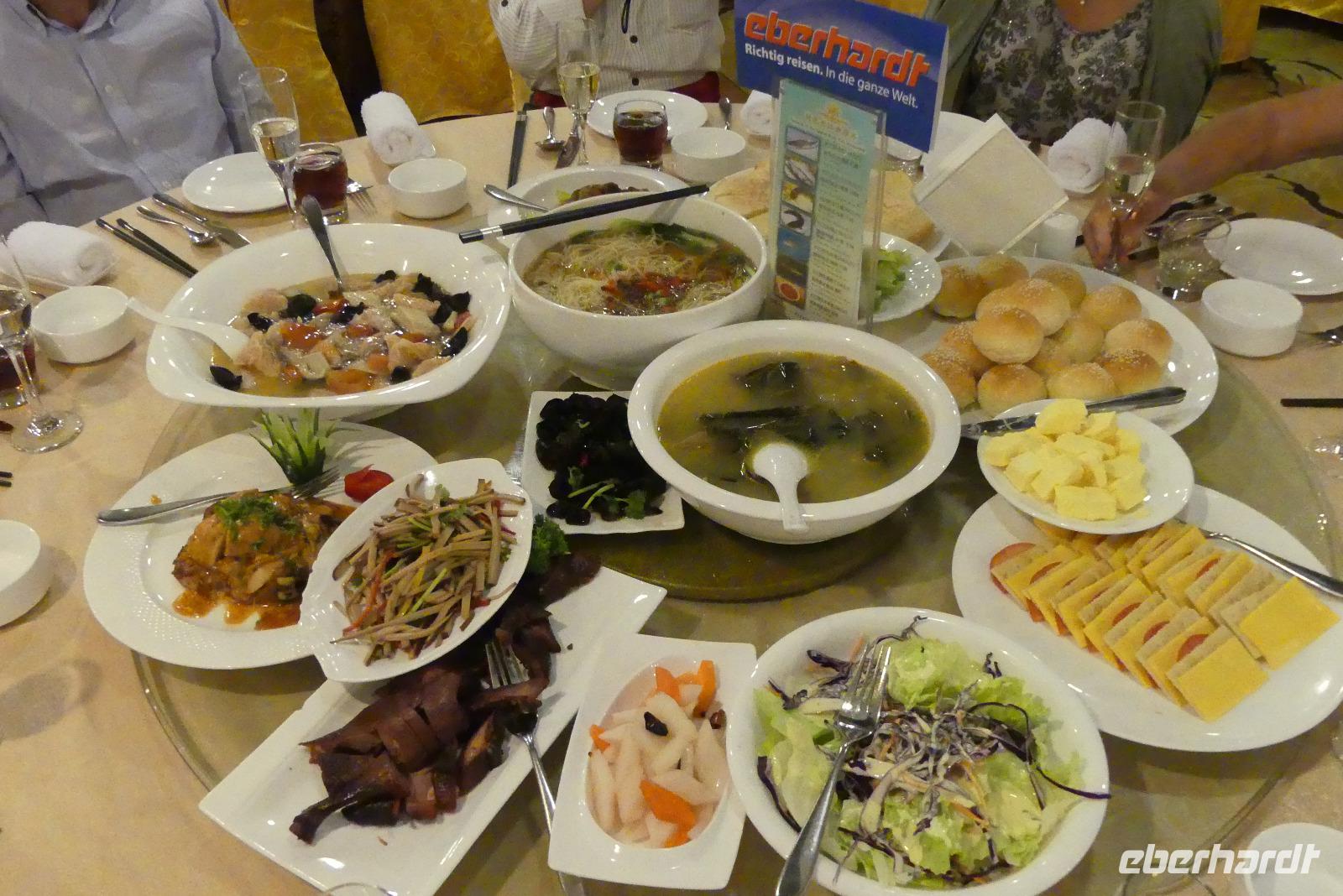 Abends bekommen wir im Restaurant 10 Gänge aufgetischt. Lin hat „wenig scharf" bestellt, besser wäre wohl „gar nicht scharf" gewesen...