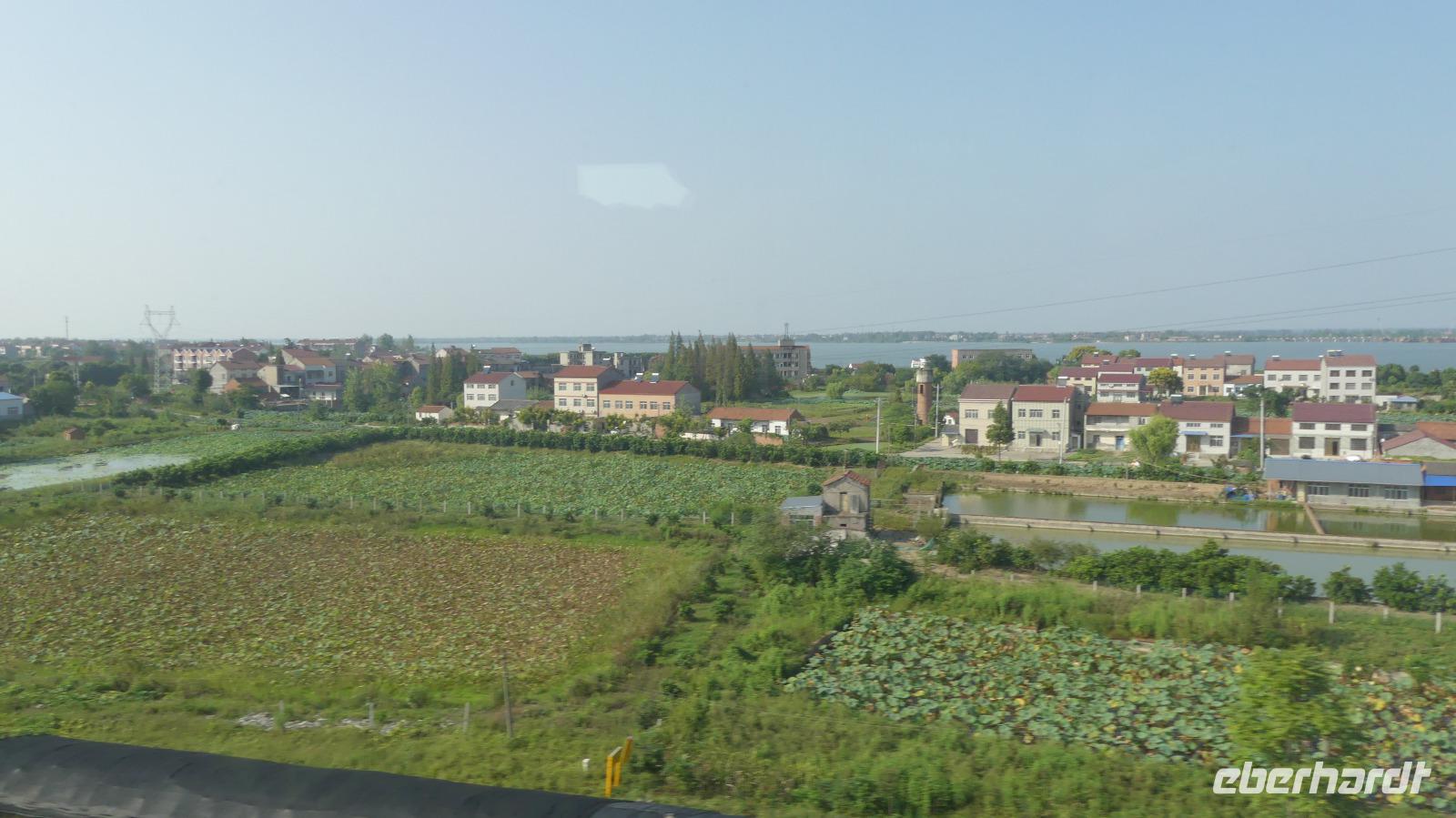 Nun rauschen wir also mit dem Zug mit ca. 200 km/h an Lotusfeldern vorbei. Der Lotus steht wie der Reis im Wasser. Seine Wurzeln sind eine begehrte Speise, wir selbst haben sie schon als löchrige Scheiben probiert. Auch die Samen der Blütenstängel werden (medizinisch) genutzt. Insgesamt reisen wir heute rund 6 Stunden mit dem Schnellzug und legen dabei etwa 850 Kilometer zurück. In Nanjing kommen wir gegen 21.00 Uhr an und fahren gleich zum Hotel