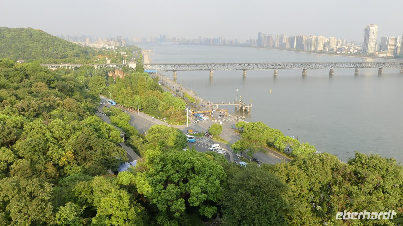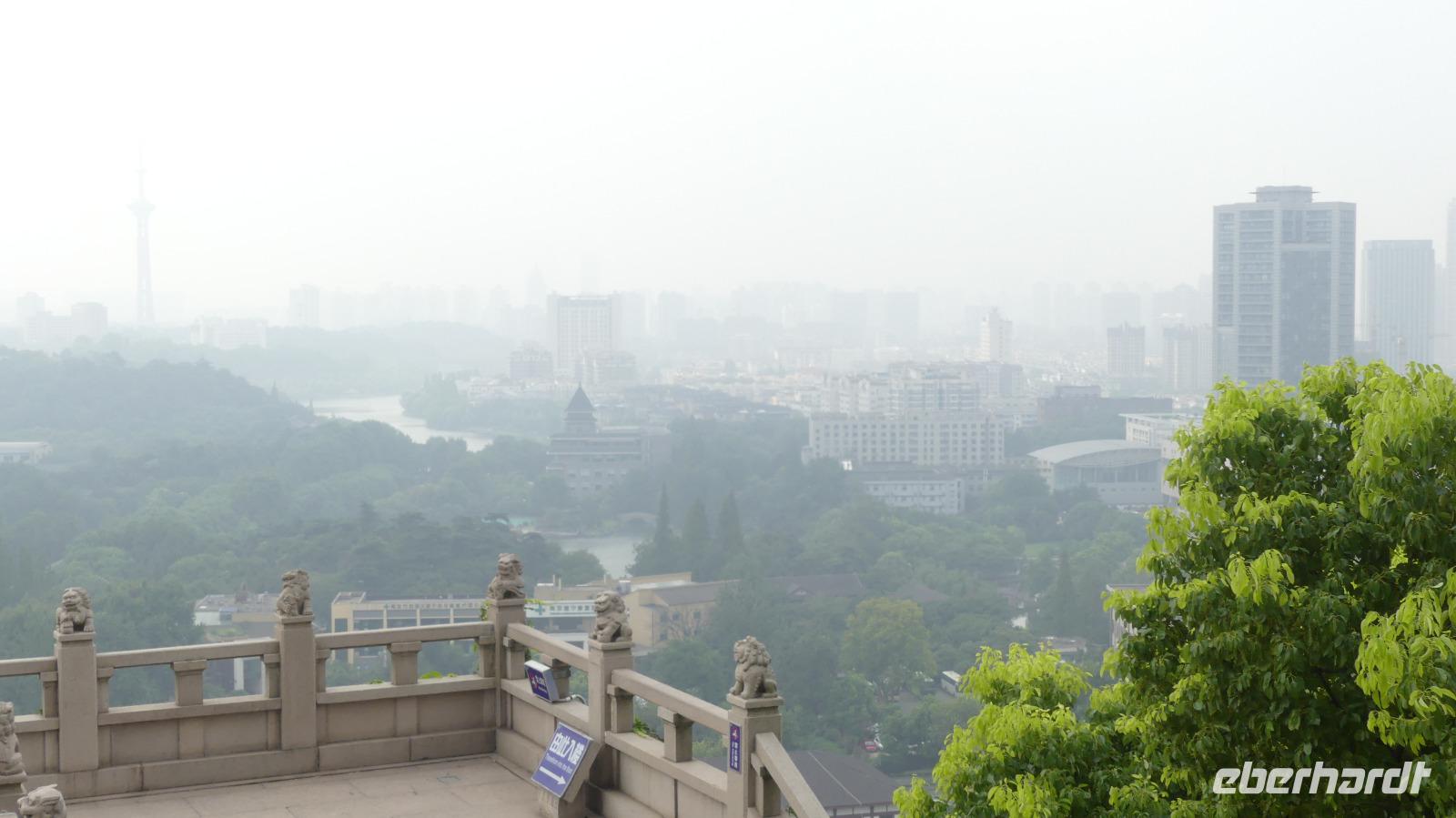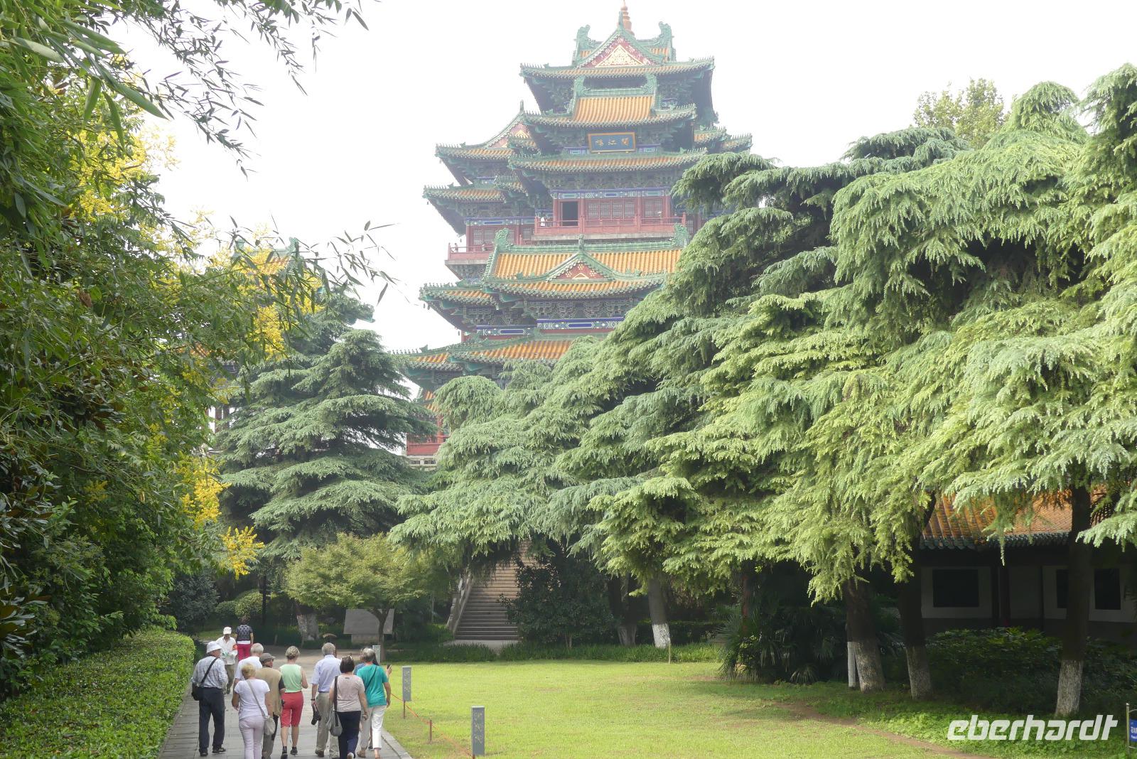 In Nanjing wollen wir heute Morgen die PKW- und Eisenbahnbrücke besichtigen, welche den über 4 Kilometer breiten Yangtze überspannt. Allerdings bekommen wir wegen Bauarbeiten keinen Zugang zum Besichtigungspunkt. Deshalb fahren wir zu einem Aussichtshügel, Löwenberg bzw. Yuejing Tower genannt. Auf dem Löwenberg befindet sich eine sehr schöne Pagode, von der man die Stadt, den Yangtze und schemenhaft auch die Brücke sieht. Das feuchtwarme Klima lässt allerdings keine wirklich gute Sicht zu. Wir sind dennoch froh, dass wir diesen Ausflug mitgenommen. Beim nächsten Halt wollen wir den Trommelturm der Stadt besuchen, jedoch wird hier auch gerade gebaut, so dass wir nur von draußen ein Foto machen können. Interessanter ist da der Zifeng Tower. Dieser steht hier in unmittelbarer Nähe. Dieser Wolkenkratzer ist mit 450 Meter Höhe derzeit der sechsthöchste in China. Unsere Fahrt durch Nanjing setzen wir fort durch schattenspendende Platanenalleen und Ausblicke auf moderne Gebäude wie zum Beispiel den Fernsehturm der Stadt. Nanjing hat in seiner jüngeren Geschichte ein schreckliches Massaker durch japanische Besatzer erlebt. Zum Gedenken an das Nanjing-Massaker von 1937 wurde eine gewaltige Erinnerungsstätte errichtet, welche wir besuchen. Hier erfahren wir von Deutschen wie John Rabe und Karl Günther, die sich für den Schutz der Bevölkerung eingesetzt haben.