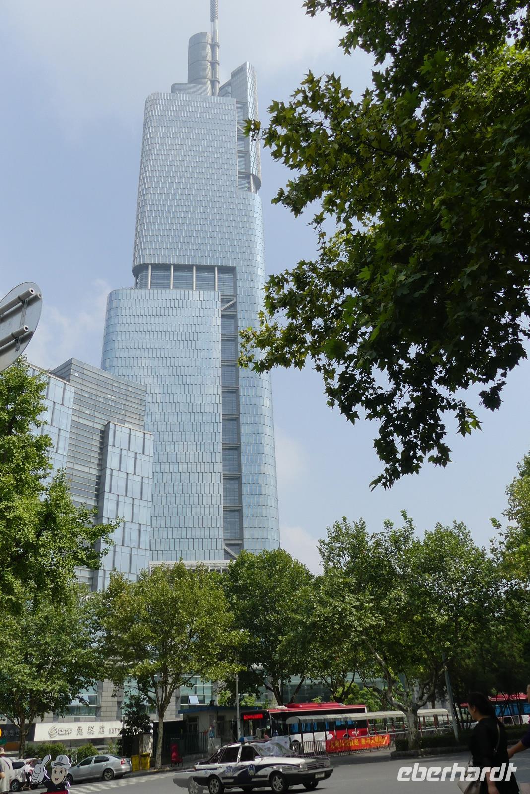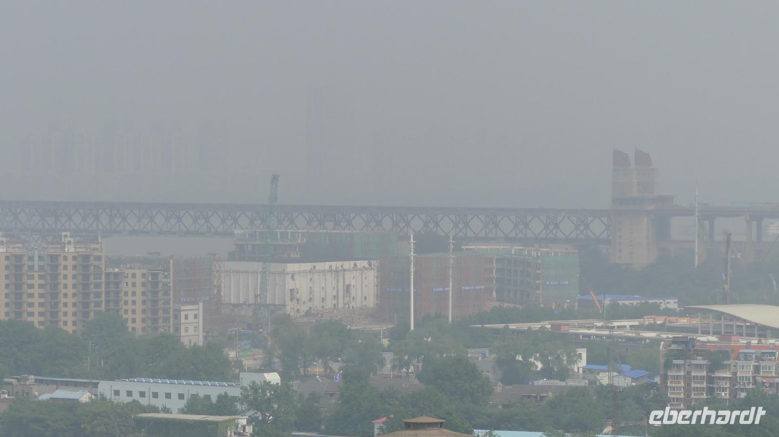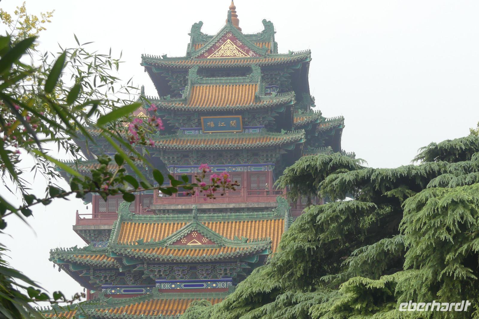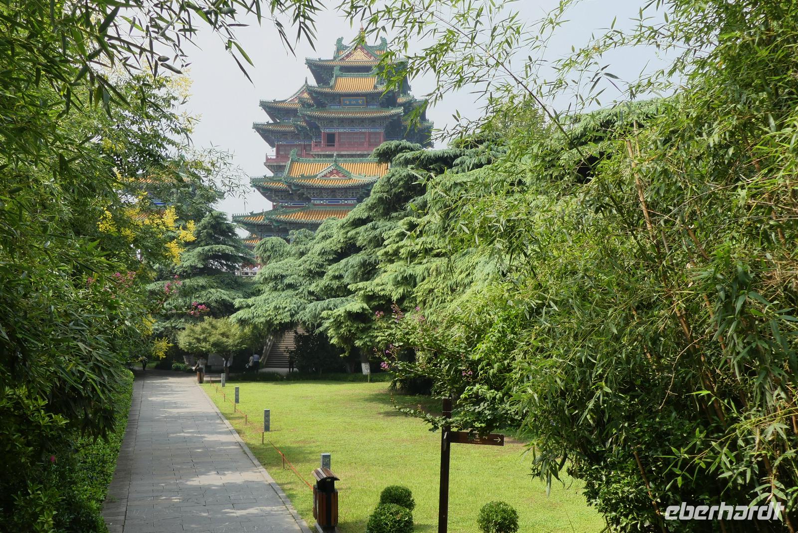 In Nanjing wollen wir heute Morgen die PKW- und Eisenbahnbrücke besichtigen, welche den über 4 Kilometer breiten Yangtze überspannt. Allerdings bekommen wir wegen Bauarbeiten keinen Zugang zum Besichtigungspunkt. Deshalb fahren wir zu einem Aussichtshügel, Löwenberg bzw. Yuejing Tower genannt. Auf dem Löwenberg befindet sich eine sehr schöne Pagode, von der man die Stadt, den Yangtze und schemenhaft auch die Brücke sieht. Das feuchtwarme Klima lässt allerdings keine wirklich gute Sicht zu. Wir sind dennoch froh, dass wir diesen Ausflug mitgenommen. Beim nächsten Halt wollen wir den Trommelturm der Stadt besuchen, jedoch wird hier auch gerade gebaut, so dass wir nur von draußen ein Foto machen können. Interessanter ist da der Zifeng Tower. Dieser steht hier in unmittelbarer Nähe. Dieser Wolkenkratzer ist mit 450 Meter Höhe derzeit der sechsthöchste in China. Unsere Fahrt durch Nanjing setzen wir fort durch schattenspendende Platanenalleen und Ausblicke auf moderne Gebäude wie zum Beispiel den Fernsehturm der Stadt. Nanjing hat in seiner jüngeren Geschichte ein schreckliches Massaker durch japanische Besatzer erlebt. Zum Gedenken an das Nanjing-Massaker von 1937 wurde eine gewaltige Erinnerungsstätte errichtet, welche wir besuchen. Hier erfahren wir von Deutschen wie John Rabe und Karl Günther, die sich für den Schutz der Bevölkerung eingesetzt haben.