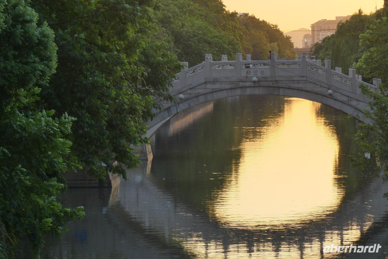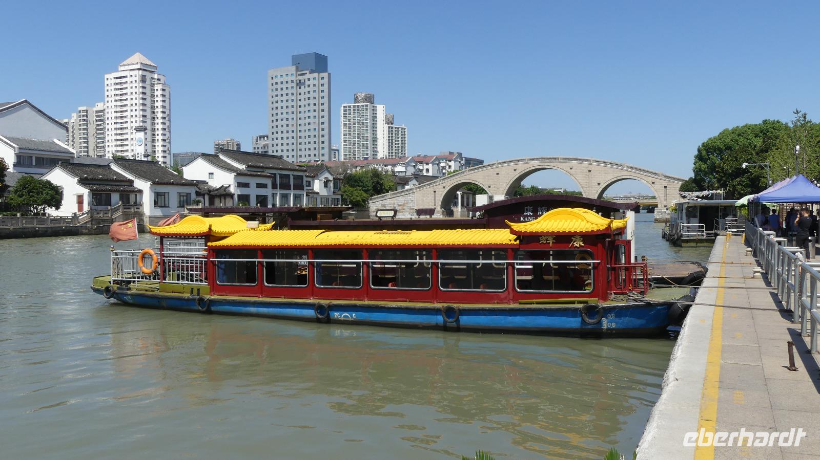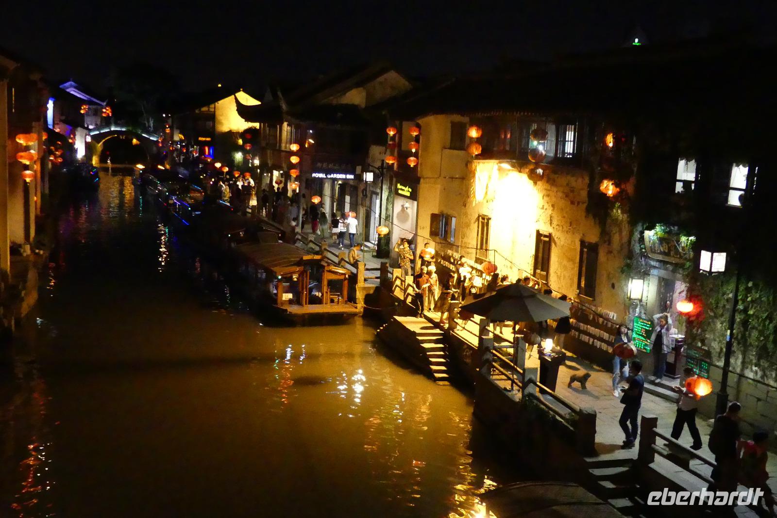 Mittags setzen wir unsere Reise fort. Mit dem Bus fahren wir über die moderne Autobahn weiter nach Suzhou. Die mit Kanälen durchzogene Altstadt, wird auch als Venedig des Ostens bezeichnet. Einen ersten Eindruck von diesem Flair an den Kanälen bekommen wir einem Spaziergang nach dem Abendessen durch die Altstadt. Da gibt es entlang des Kanals eine hübsche Altstadtgasse mit vielen kleinen Läden, Restaurants und Bars und malerische Bogenbrücken überspannen den Kanal.