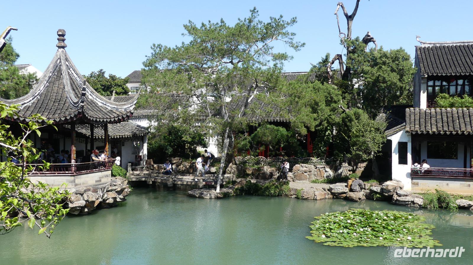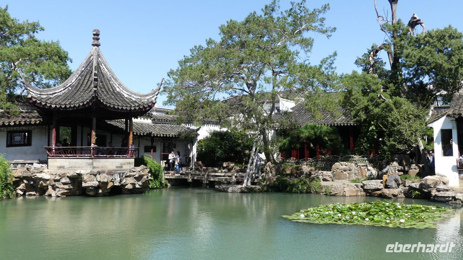 Suzhou zeigt sich heute mit strahlender Sonne und blauen Himmel, passend für unseren Besuch des „Gartens des Meisters der Fischernetze". Einst Alterssitz eines reichen chinesischen Beamten, bietet es heute den Besuchern ein idealtypisches Bild eines chinesischen Gartens mit einem Lotusteich, schmucken Holzhäuschen, Felsen und gepflegten Pflanzen.