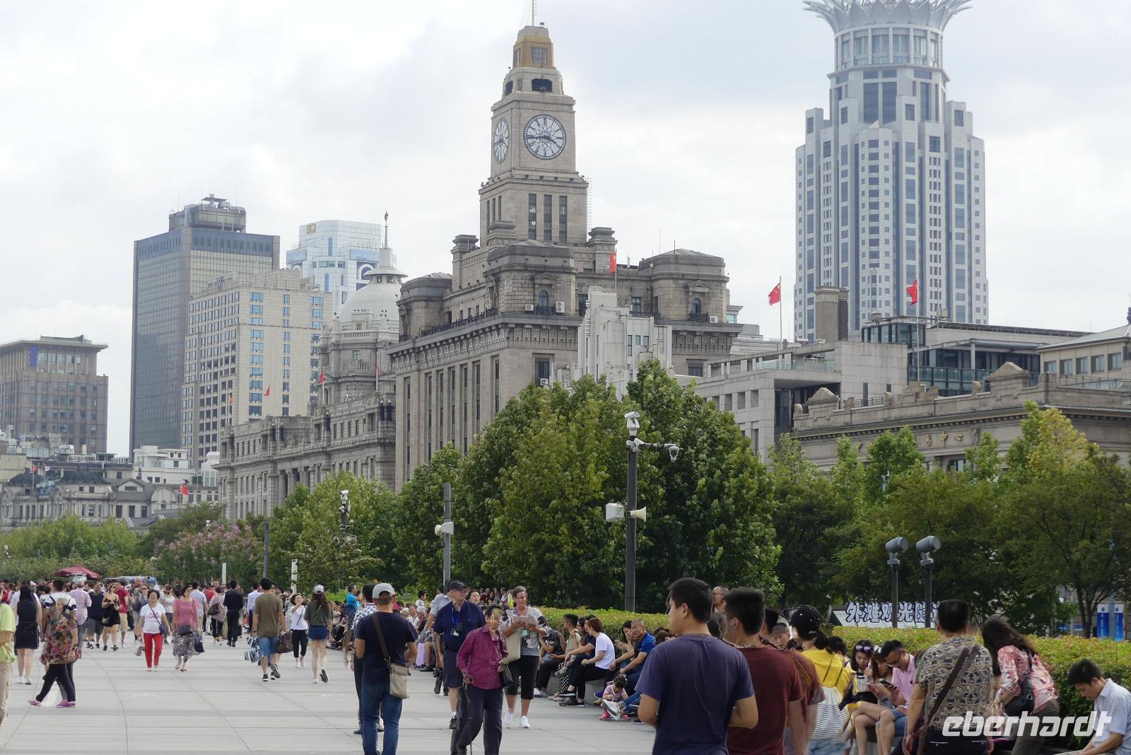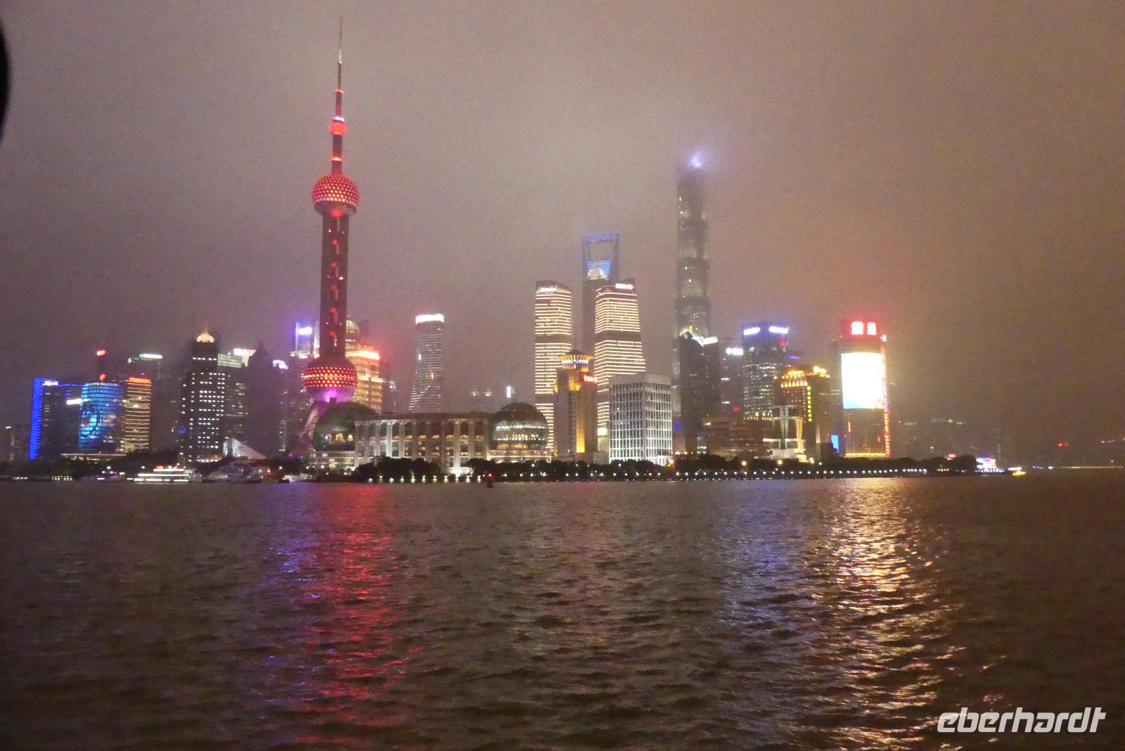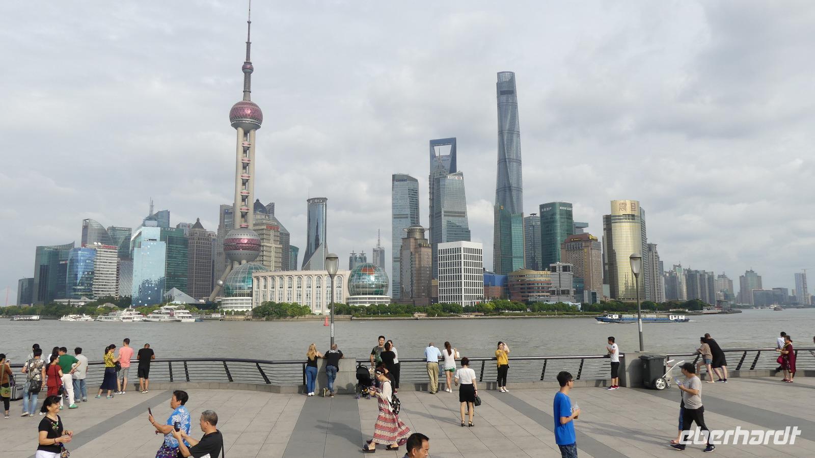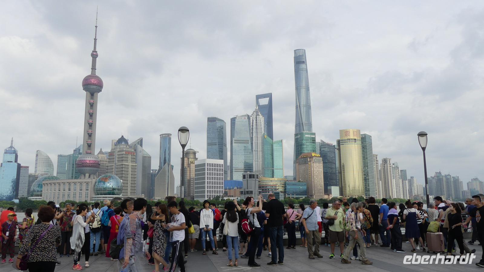 Am Nachmittag erreichen wir die 15 Millionen Einwohner Metropole Shanghai. Shanghai bedeutet die „Stadt über dem Meer". Da sich Shanghai gerade am Rande eines Taifuns befindet und das Wetter im Moment noch freundlich ist, fahren wir direkt zum Bund, der berühmten Uferpromenade am Huangpu (Nebenfluß des Yantze). Eine Hafenrundfahrt ist heute nicht mehr möglich, da eine Sturmwarnung ausgesprochen wurde, aber dafür haben wir sehr gute Sichtverhältnisse, um die Skyline von Putong zu bewundern. Die markantesten Wolkenkratzer sind allen voran der Fernsehturm „Oriental Pearl Tower" mit 458 m, das Shanghai World Financial Center 492 m (Flaschenöffner genannt), der Jin Mao Tower mit 421 sowie der alles überragende Shanghai Tower mit 632 m. Am Bund, der Uferpromenade selbst zeugen Bauten aus der Zeit um 1900 vom früheren Glanz des damaligen „Paris des Ostens". Neben vielen Bankgebäuden befindet sich hier das alte Zollhaus mit dem Glockenturm. Wir hören seinen Glockenschlag, dieser klingt genauso wie der des Big Ben, weil er einst die Engländer an heimische Gefilde erinnern sollte. Fasziniert von dieser grandiosen Kulisse, unternehmen wir am Abend mit dem Linienbus noch einmal einen Ausflug, um uns Bund und Skyline bei Nacht anzuschauen.