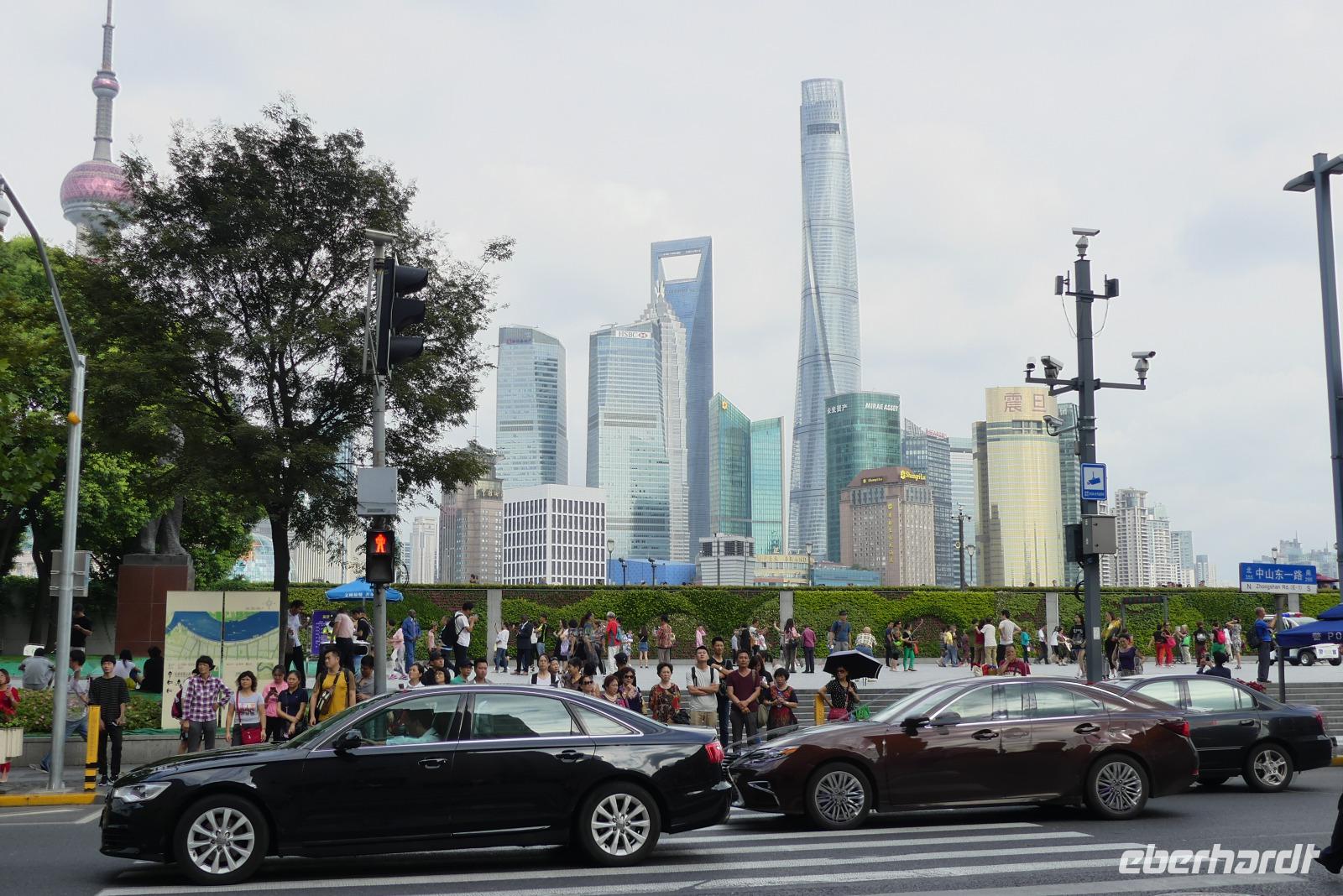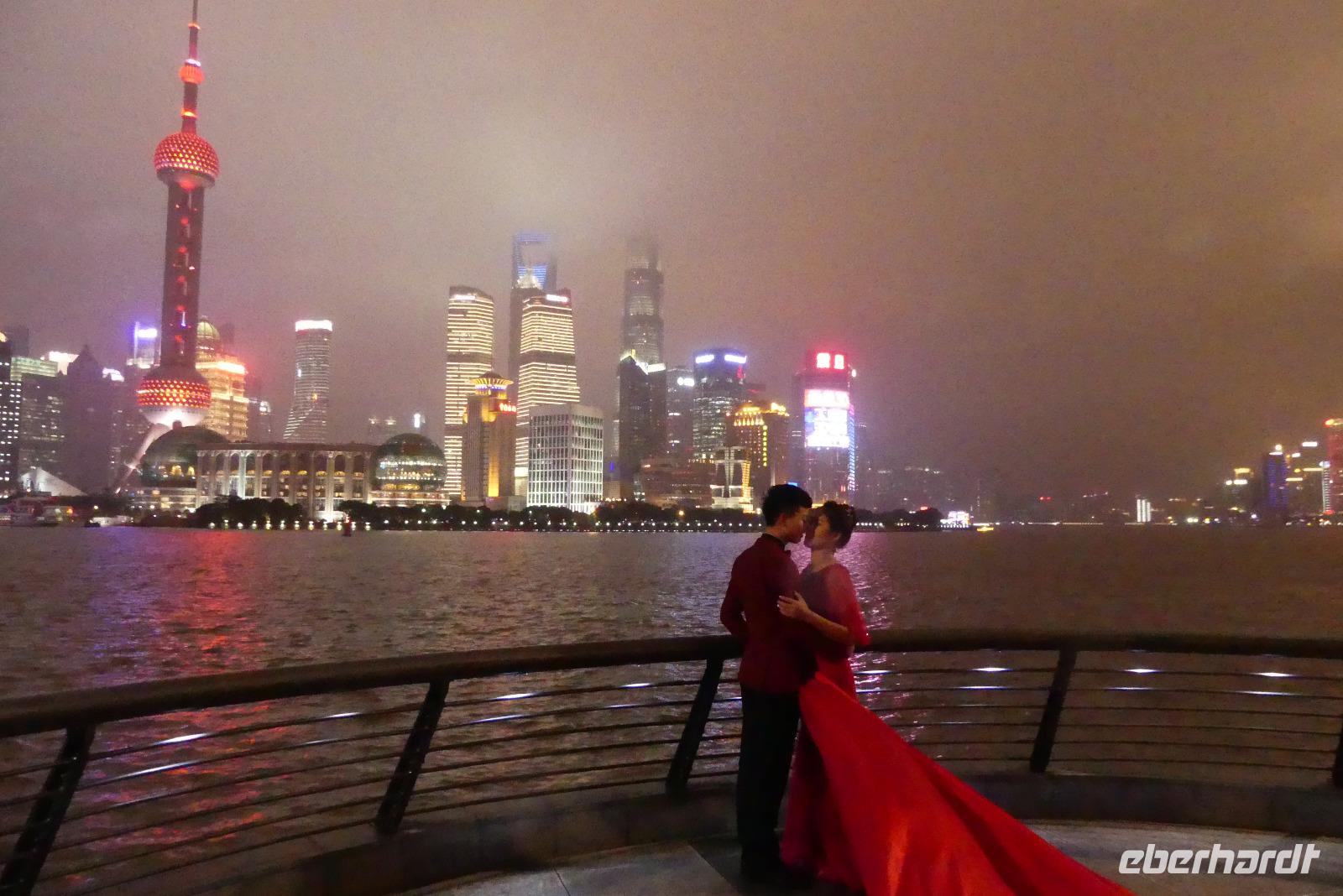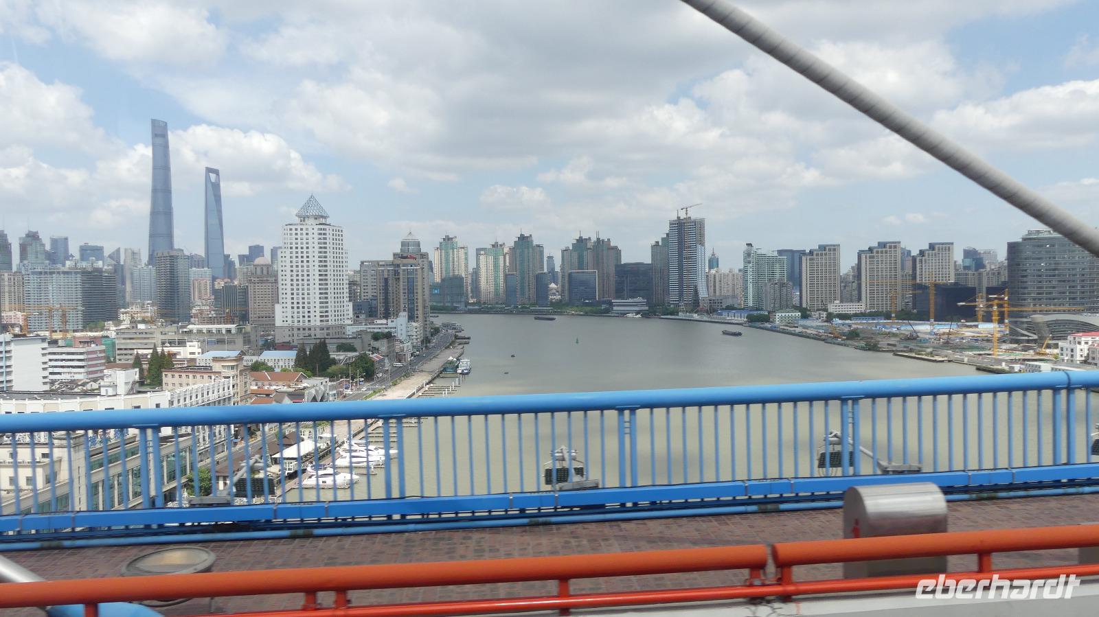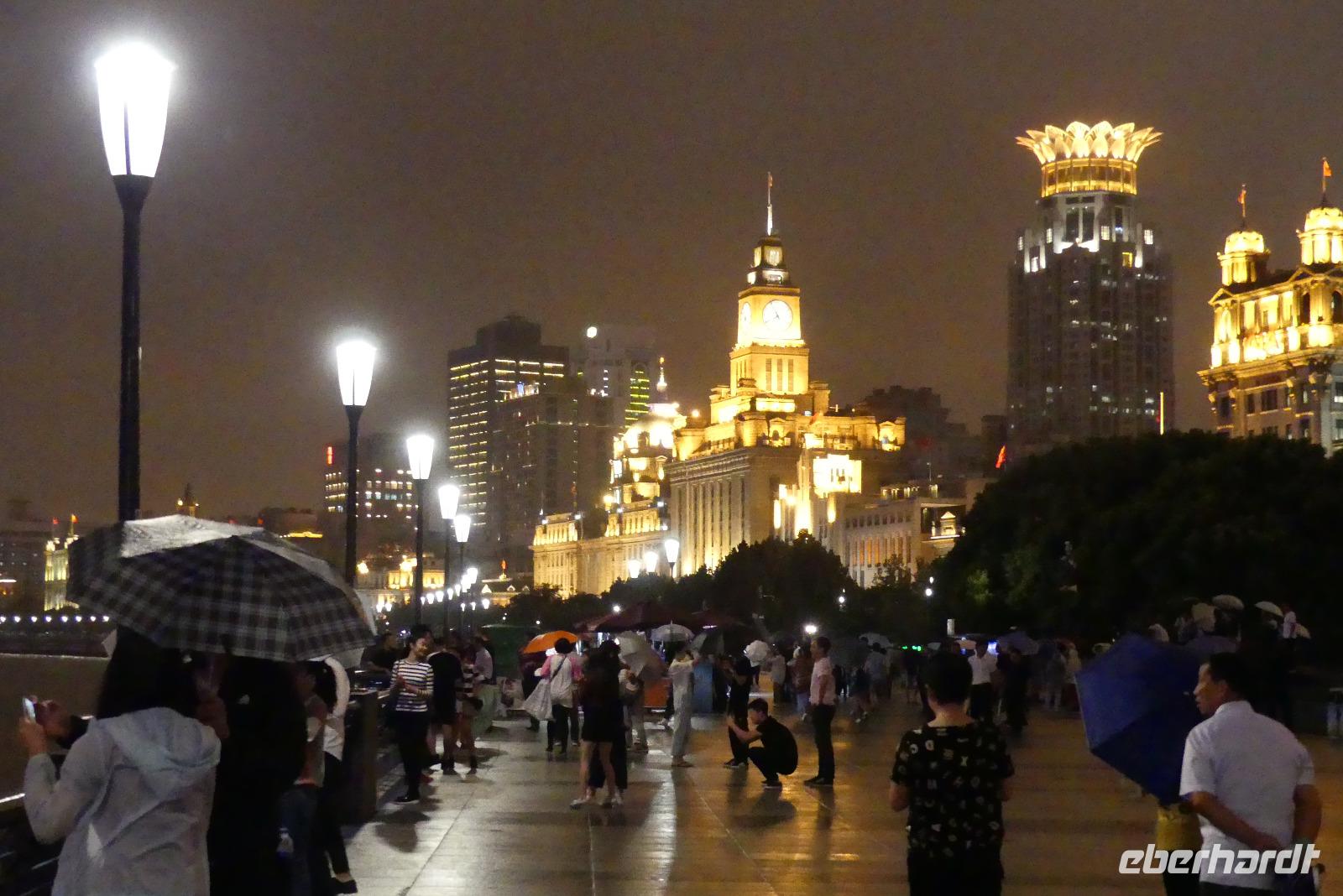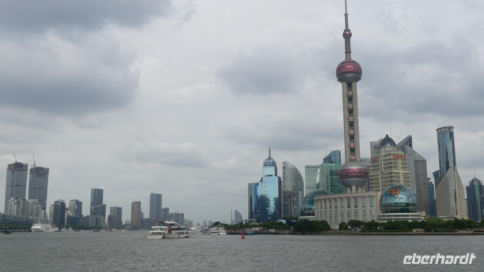 Am Nachmittag erreichen wir die 15 Millionen Einwohner Metropole Shanghai. Shanghai bedeutet die „Stadt über dem Meer". Da sich Shanghai gerade am Rande eines Taifuns befindet und das Wetter im Moment noch freundlich ist, fahren wir direkt zum Bund, der berühmten Uferpromenade am Huangpu (Nebenfluß des Yantze). Eine Hafenrundfahrt ist heute nicht mehr möglich, da eine Sturmwarnung ausgesprochen wurde, aber dafür haben wir sehr gute Sichtverhältnisse, um die Skyline von Putong zu bewundern. Die markantesten Wolkenkratzer sind allen voran der Fernsehturm „Oriental Pearl Tower" mit 458 m, das Shanghai World Financial Center 492 m (Flaschenöffner genannt), der Jin Mao Tower mit 421 sowie der alles überragende Shanghai Tower mit 632 m. Am Bund, der Uferpromenade selbst zeugen Bauten aus der Zeit um 1900 vom früheren Glanz des damaligen „Paris des Ostens". Neben vielen Bankgebäuden befindet sich hier das alte Zollhaus mit dem Glockenturm. Wir hören seinen Glockenschlag, dieser klingt genauso wie der des Big Ben, weil er einst die Engländer an heimische Gefilde erinnern sollte. Fasziniert von dieser grandiosen Kulisse, unternehmen wir am Abend mit dem Linienbus noch einmal einen Ausflug, um uns Bund und Skyline bei Nacht anzuschauen.