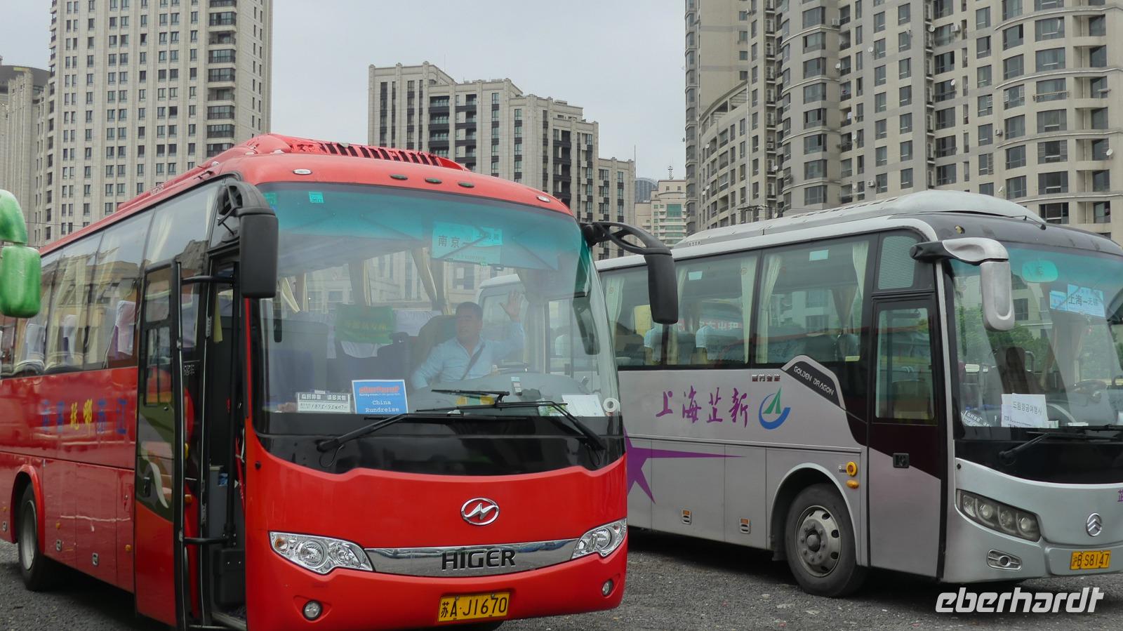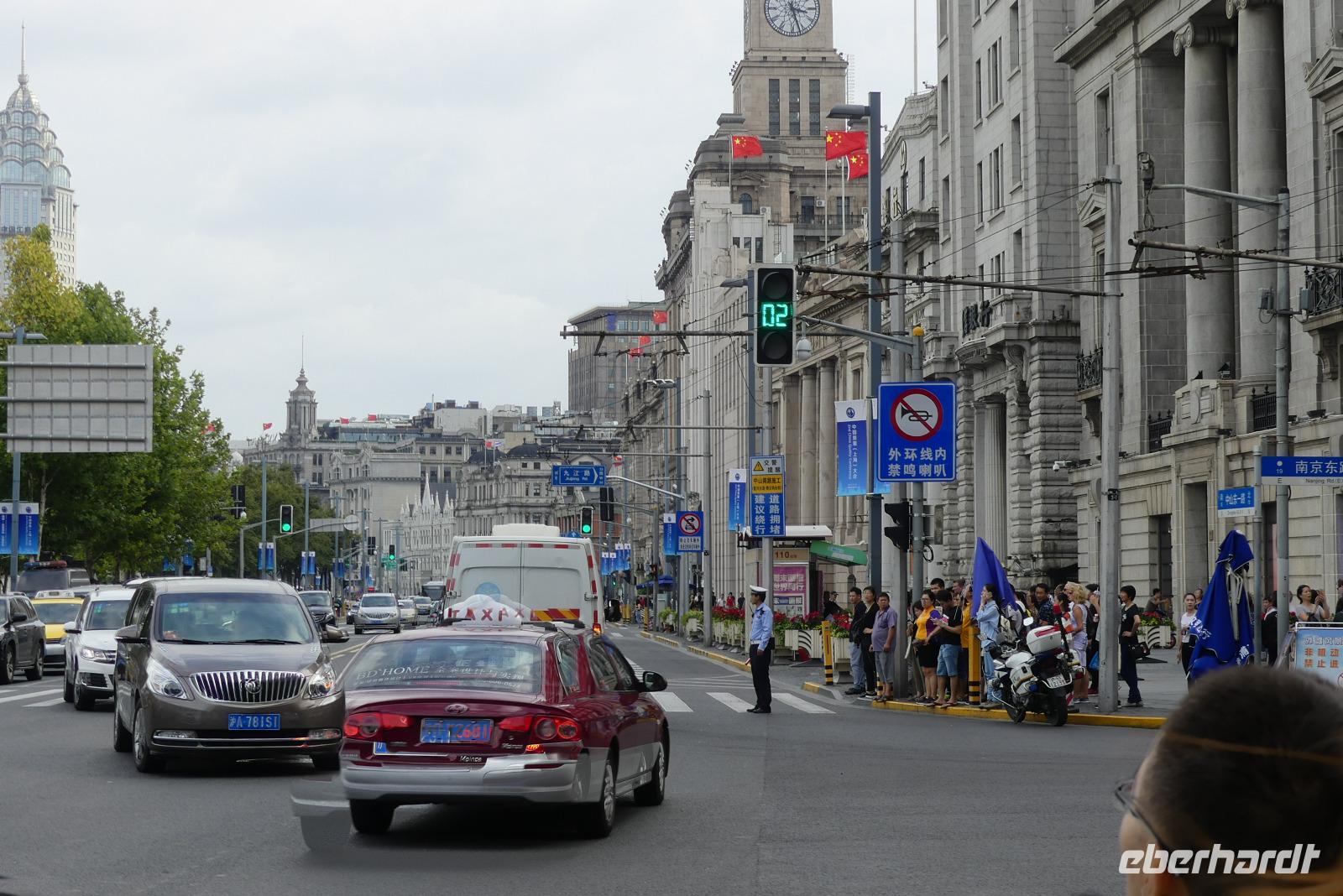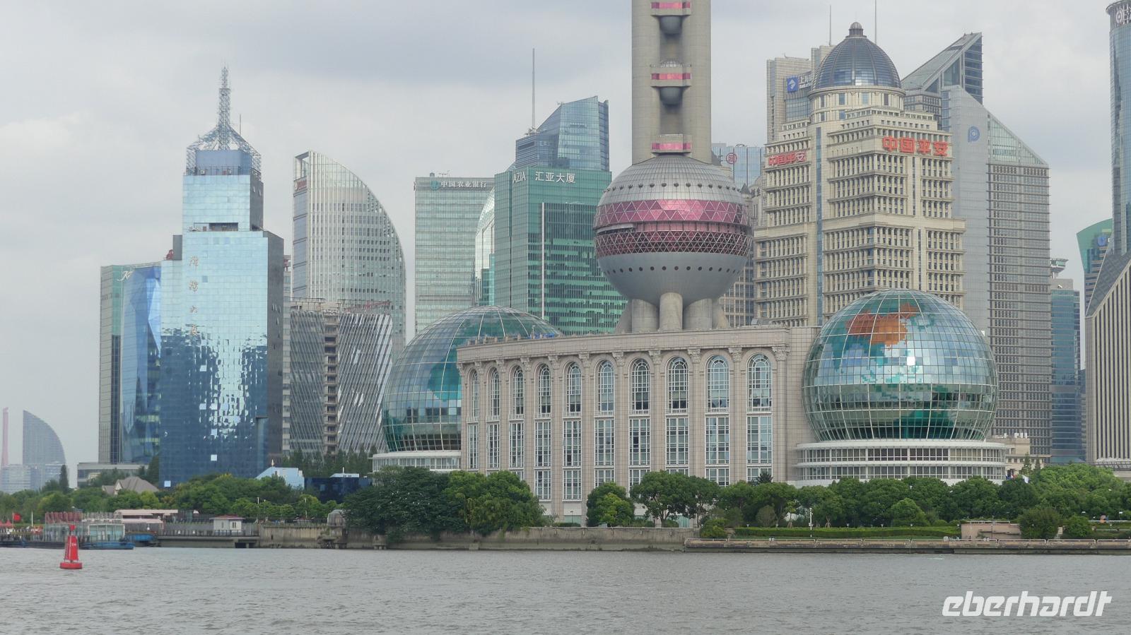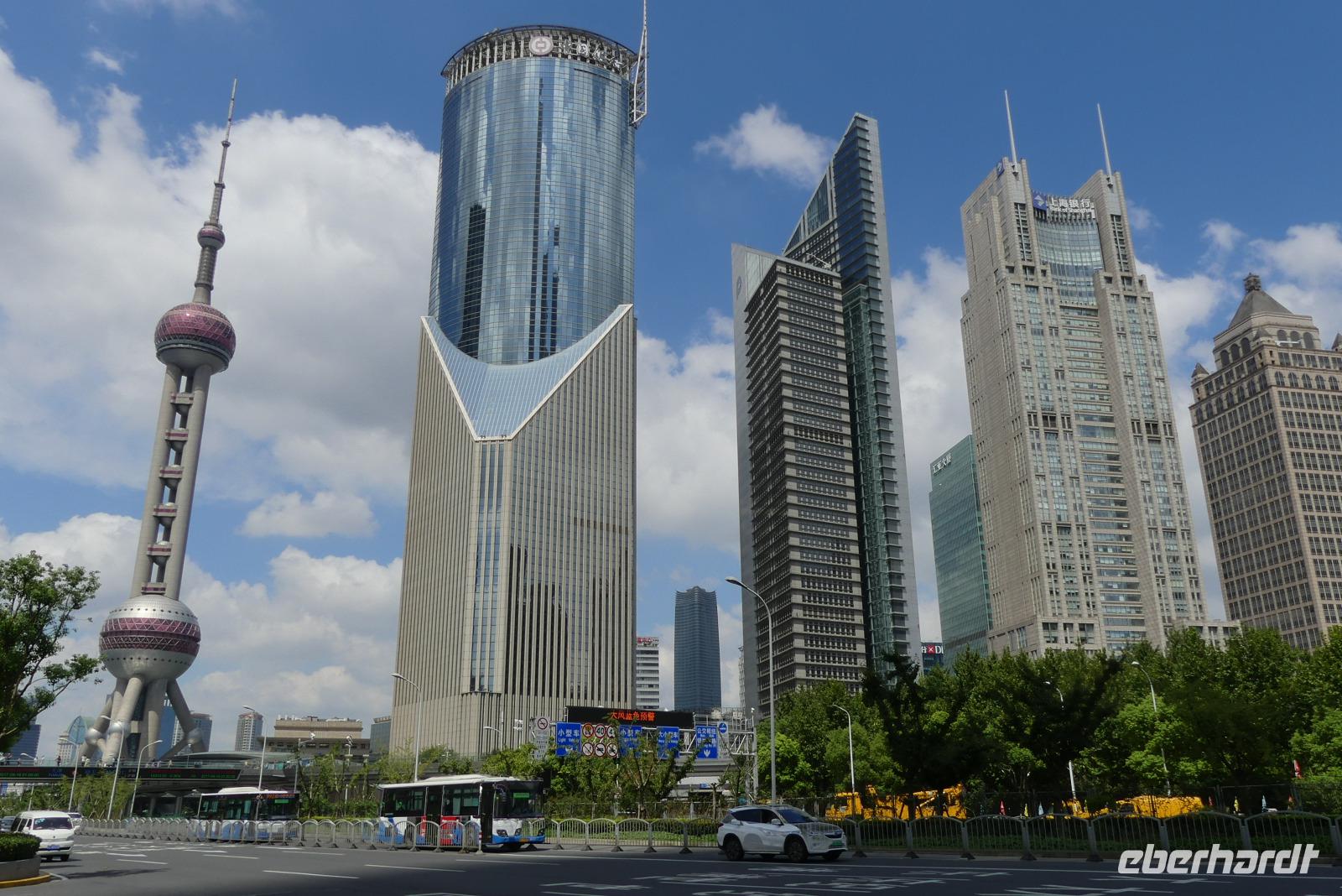 Am Nachmittag erreichen wir die 15 Millionen Einwohner Metropole Shanghai. Shanghai bedeutet die „Stadt über dem Meer". Da sich Shanghai gerade am Rande eines Taifuns befindet und das Wetter im Moment noch freundlich ist, fahren wir direkt zum Bund, der berühmten Uferpromenade am Huangpu (Nebenfluß des Yantze). Eine Hafenrundfahrt ist heute nicht mehr möglich, da eine Sturmwarnung ausgesprochen wurde, aber dafür haben wir sehr gute Sichtverhältnisse, um die Skyline von Putong zu bewundern. Die markantesten Wolkenkratzer sind allen voran der Fernsehturm „Oriental Pearl Tower" mit 458 m, das Shanghai World Financial Center 492 m (Flaschenöffner genannt), der Jin Mao Tower mit 421 sowie der alles überragende Shanghai Tower mit 632 m. Am Bund, der Uferpromenade selbst zeugen Bauten aus der Zeit um 1900 vom früheren Glanz des damaligen „Paris des Ostens". Neben vielen Bankgebäuden befindet sich hier das alte Zollhaus mit dem Glockenturm. Wir hören seinen Glockenschlag, dieser klingt genauso wie der des Big Ben, weil er einst die Engländer an heimische Gefilde erinnern sollte. Fasziniert von dieser grandiosen Kulisse, unternehmen wir am Abend mit dem Linienbus noch einmal einen Ausflug, um uns Bund und Skyline bei Nacht anzuschauen.