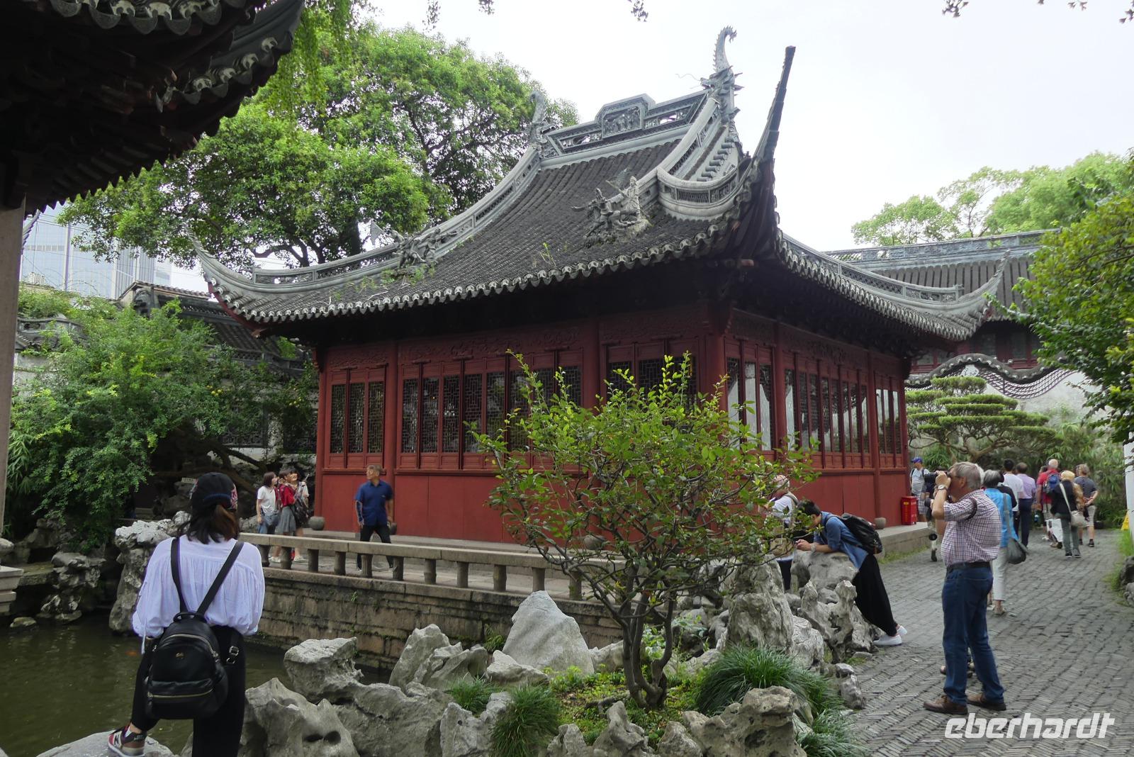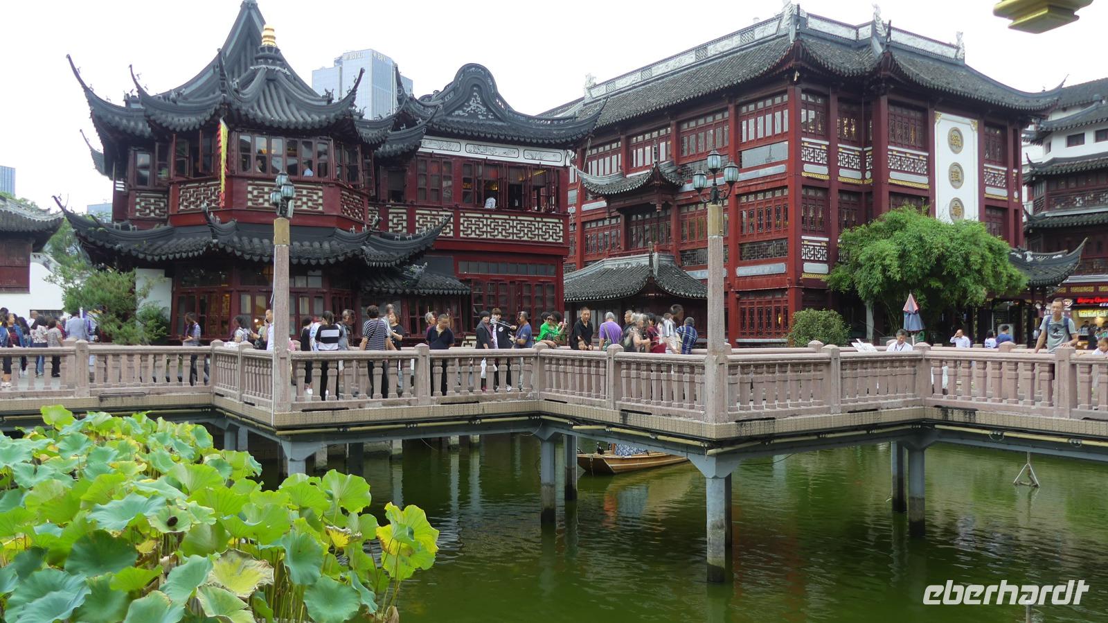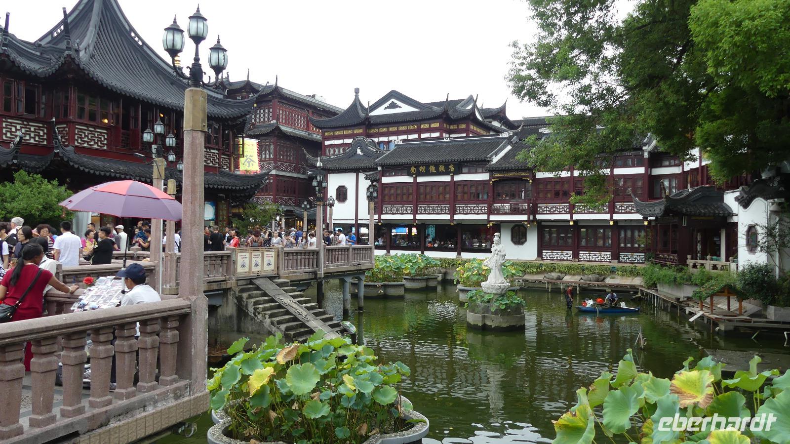 Vom Taifun vor der Küste bleiben wir weitgehend verschont, bekommen nur Wind und Wolken ab. Bei angenehmen 26 Grad Höchtsttemparatur besuchen wir am Vormittag Shanghais Altstadt. Im Wohnviertel bekommen wir einen Eindruck vom Leben hier, von Wäsche, die auf der Straße getrocknet wird, von Töpfen, die nachts gebraucht wurden...Dagegen ist der historische Tempelbereich, Tempel des Stadtgottes, gleich nebenan gelegen, mit kleinen Gassen, alter Apotheke, dem Huxingting-Teehaus oder der der Zickzackbrücke voll touristisch erschlossen. In diesem Areal befindet sich auch der von einer Mauer umschlossene Garten der Freude, der Yu-Garten, eine grüne Oase mitten in der riesigen Stadt.
