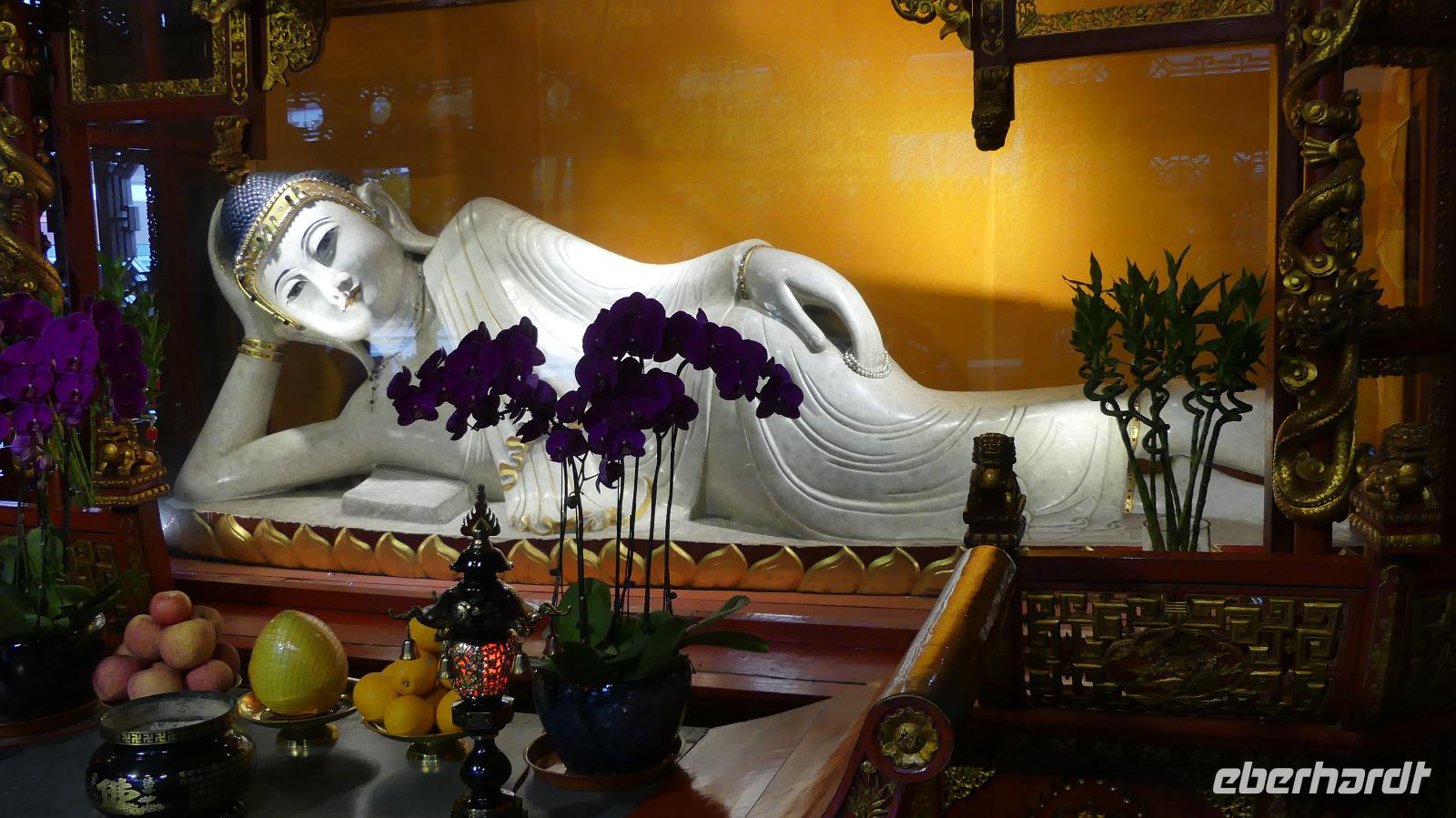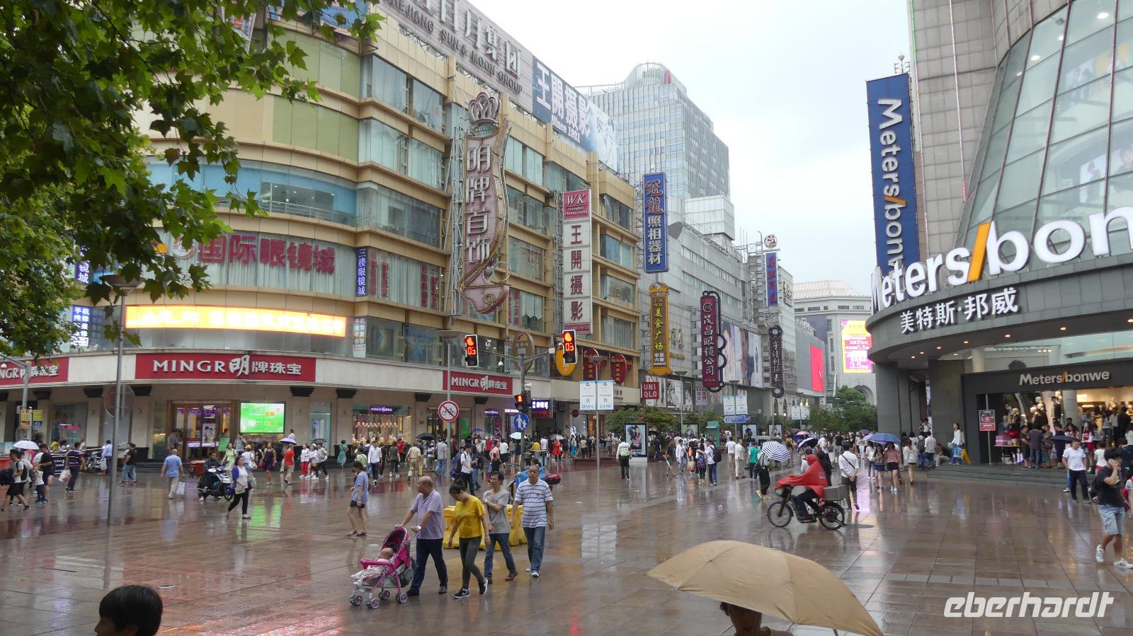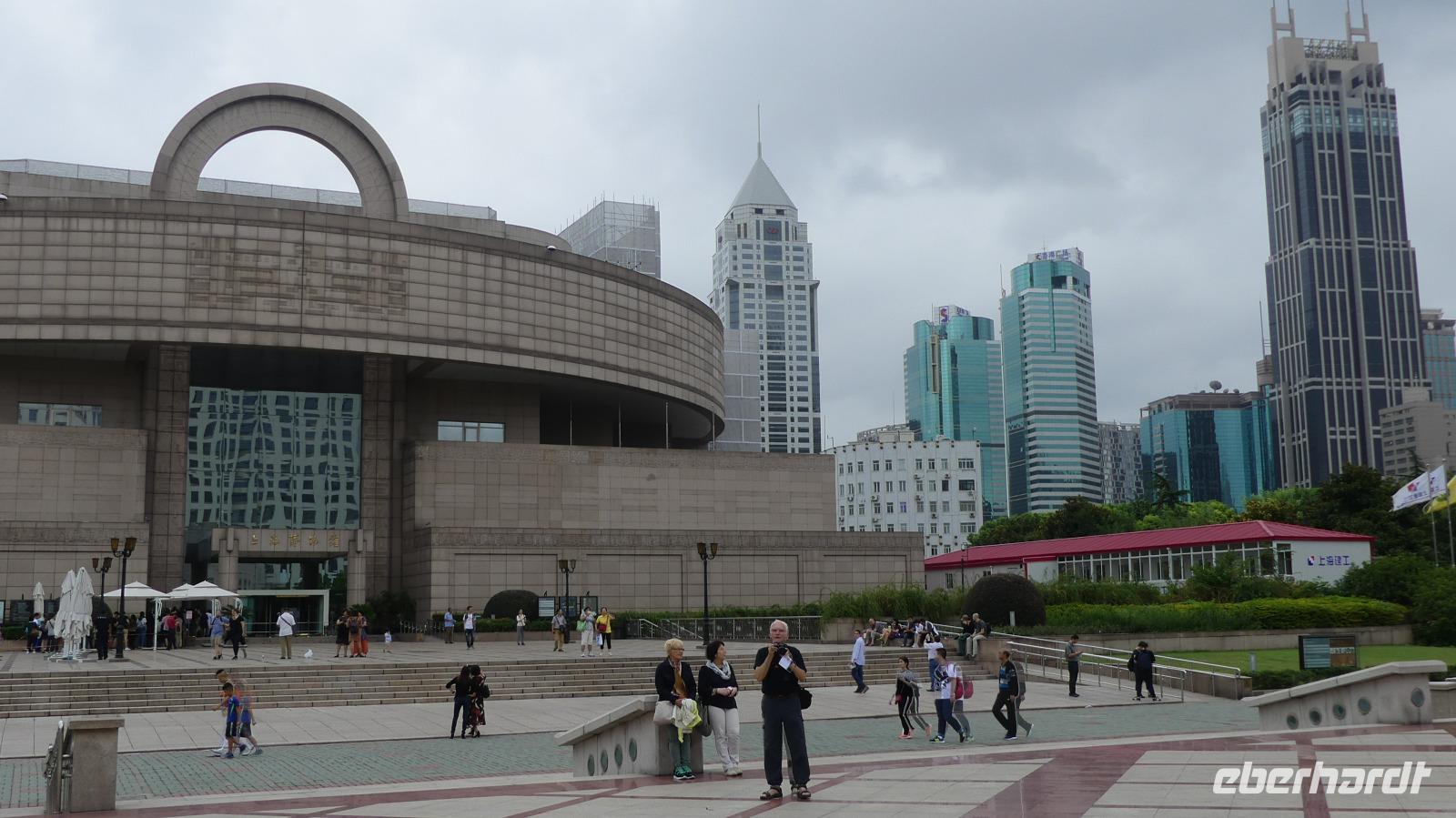 Mit unserem Bus fahren wir weiter durch das Gebiet der früheren französischen Konzession und entlang der westlichen Nanjing Road mit original Glashütte Uhrengeschäft bis zu unserem nächsten Ziel, dem Jade-Buddha-Tempel. Dieser wurde extra für die 1,95 Meter große Buddhafigur aus Burma errichtet. Wir sehen hier auch noch einen sehr schönen liegenden Jade-Buddha. Anschließend kommen wir zu einem Fotostop am großen Volksplatz mit seinen großen monumentalen Bauten wie Rathaus, Oper, Shanghai Museum. Auf der Nanjing-Road, der bekanntesten Einkaufsstraße von Shanghai unternehmen wir noch einen Bummel, allerdings schickt uns der Taifun nun doch noch seine Regenwolken vorbei.