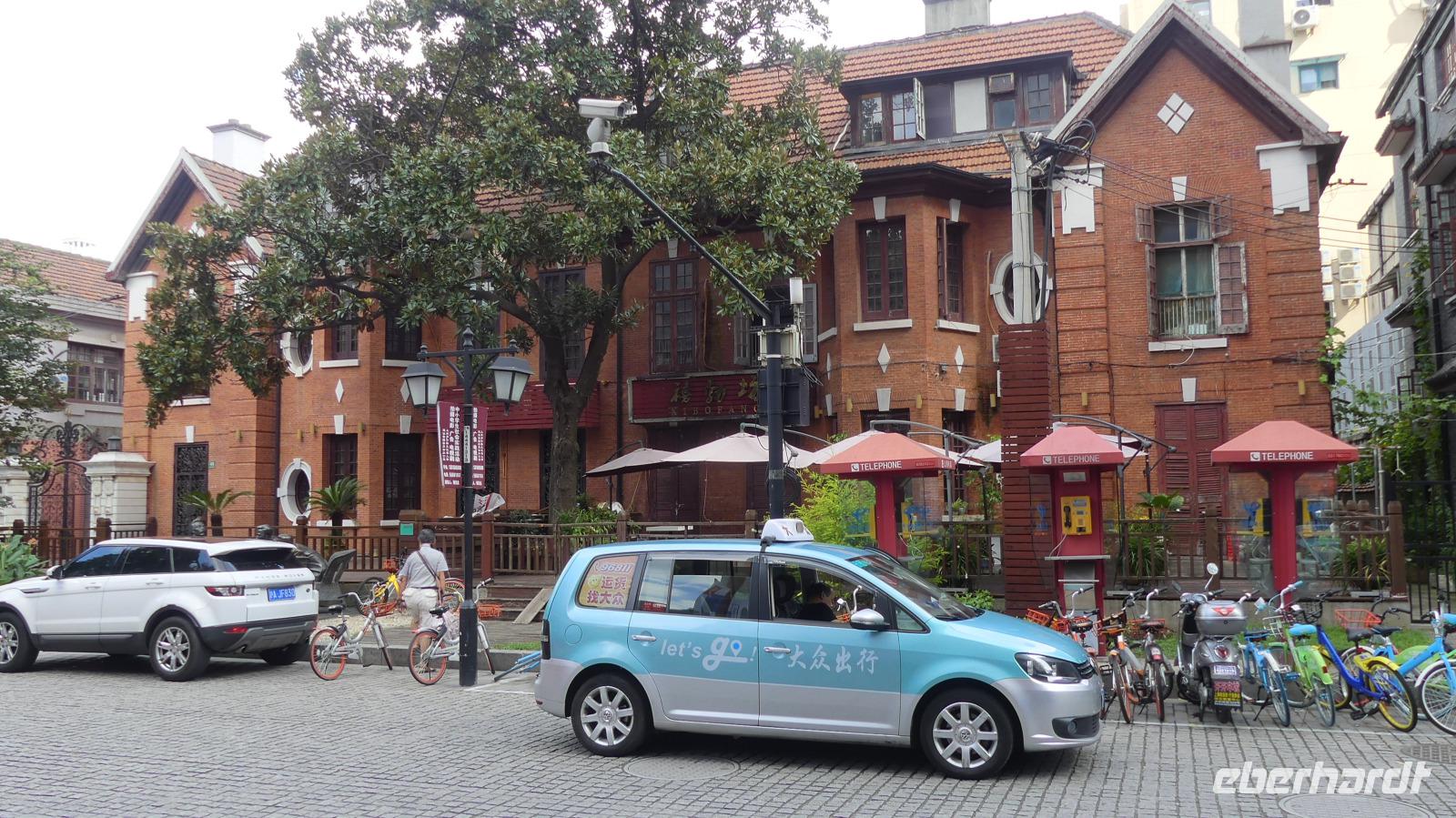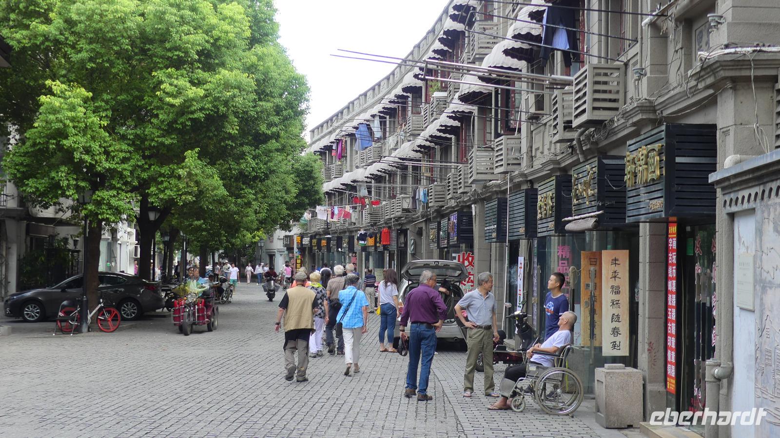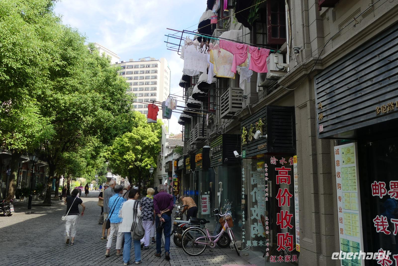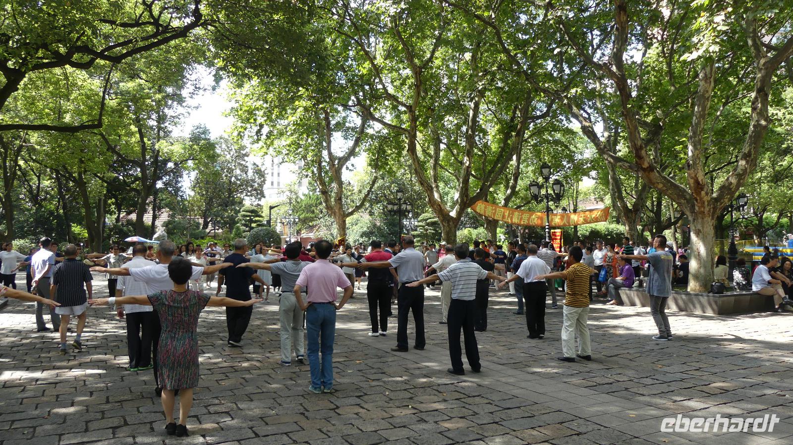 An unserem letzten Tag in Shanghai zeigt sich die Stadt von ihrer schönsten Seite, den die Sonne strahlt. Vom Hotel aus spazieren wir auf der sogenannten Kulturstraße mit historischen Gebäuden, darunter einer Kirche, durch das alte Viertel. Die Häuser mit Backsteinfassaden sind beliebte Kulissen für Brautpaarfotos. In einer Nebengasse mit aufgehängter Wäsche und Kabelsalat in der Luft bekommt man eine gewisse Vorstellung von dem Leben hier. Etwas weitere erleben wir im Park chinesischen Morgensport. Heute am Sonnabend sind besonders viele Menschen gekommen.