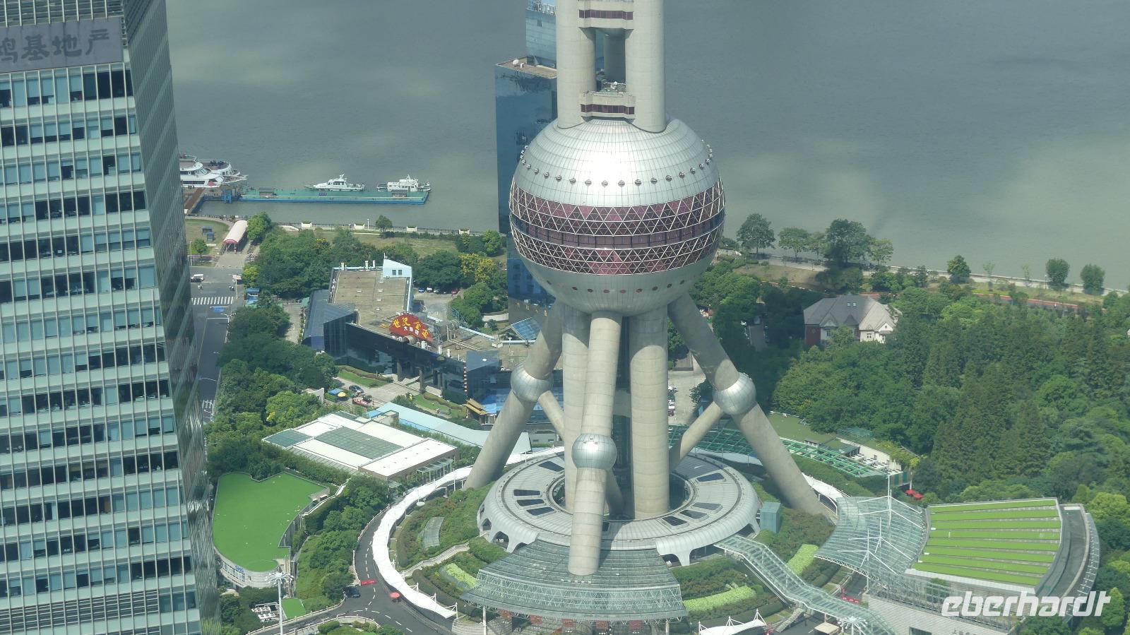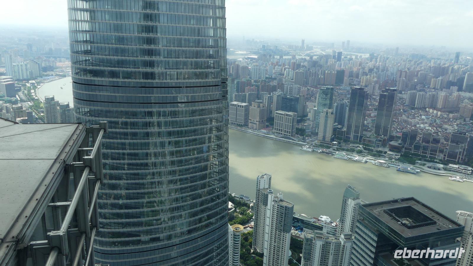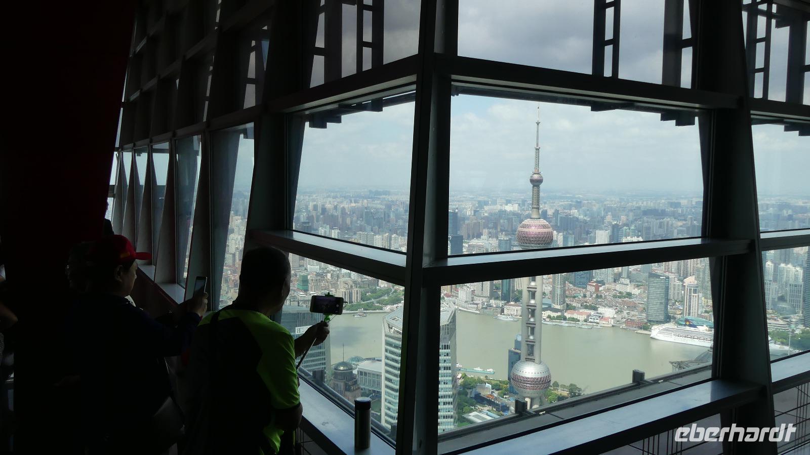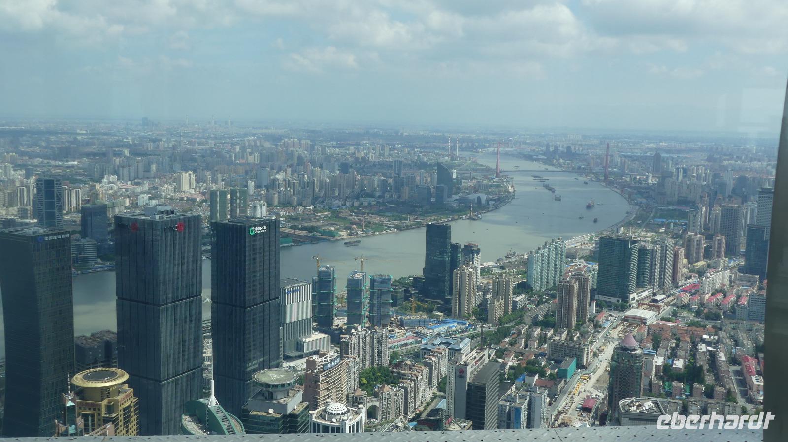 Auf unserem Programm steht noch eine Hafenrundfahrt. Da die Sturmwarnung noch nicht aufgehoben ist, dürfen nach wie vor keine Passagierschiffe auf den Hunangpu auslaufen. Wir haben uns deshalb für eine interessante Alternative entschieden: eine Auffahrt auf die Aussichtsplattform des Jin Mao Tower. Der Blick aus 340 Meter Höhe ist einfach überwältigend, als würde uns die ganze Stadt zu Füßen liegen! Der Jin Mao Tower ist voll und ganz auf die chinesische Glückszahl 8 ausgerichtet: er wurde am 28.08.2008 eröffnet, an der Spitze verjüngt er sich in 8 Stufen und wir selbst befinden uns in der 88. Etage. Die berühmte Skyline von Pudong ist erst in den letzten 15 Jahren entstanden. Weltweit waren renommierte Architekturbüros zum Wettbewerb eingeladen, Entwürfe einzureichen. Einen Auftrag hat keines dieser Büros bekommen. Es wurde einfach das Beste aus ihren Entwürfen übernommen...