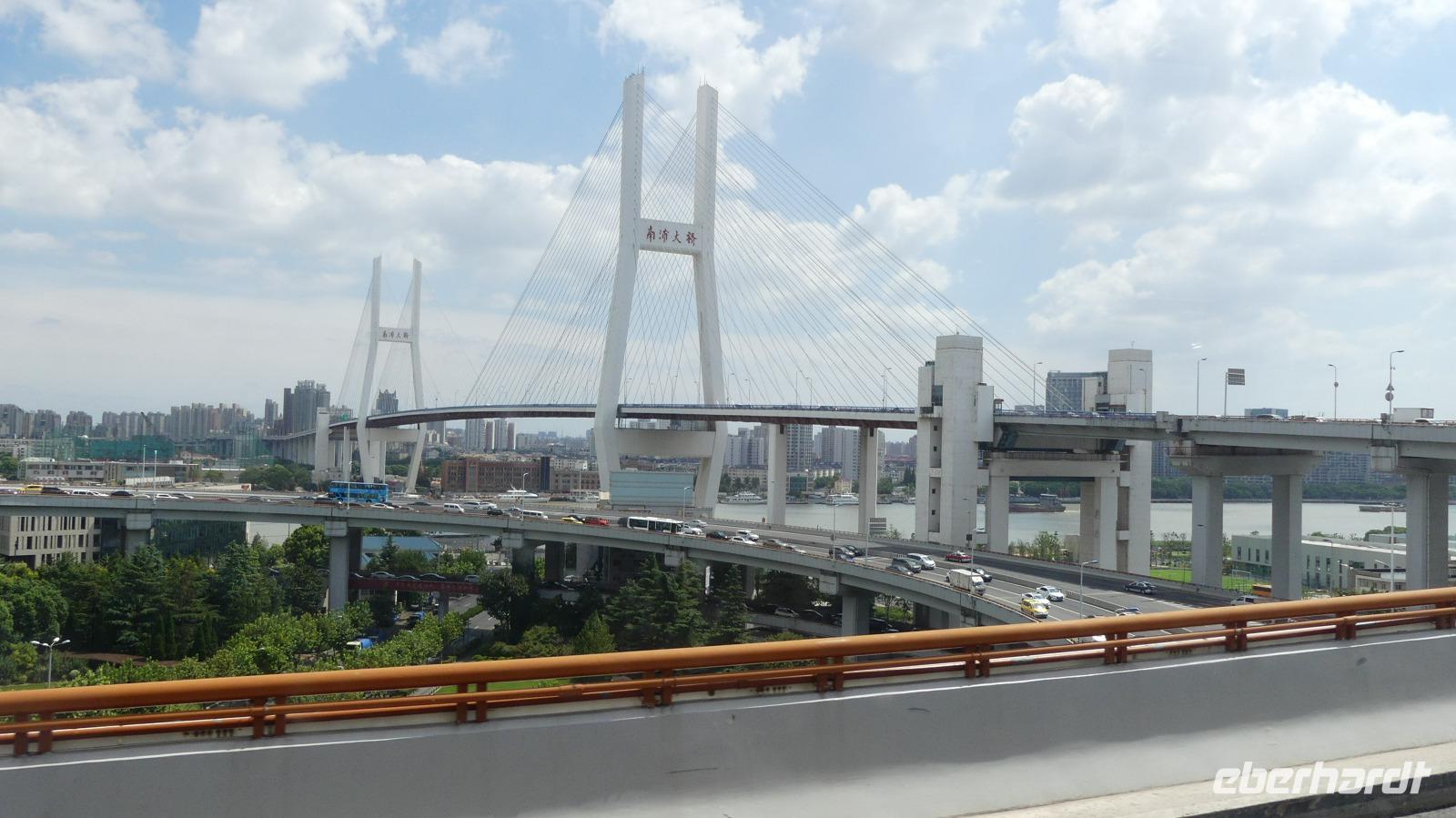 Nun verlassen wir Shanghai. Dabei überqueren wir insgesamt dreimal den Hungpu-Fluss über riesige Brücken und kommen am früheren Expo-Gelände vorbei. Nach dreistündiger Busfahrt erreichen wir am Nachmittag Hangzhou, um uns noch die 6-Harmonien-Pagode (Liuhe-Pagode) anzusehen. Sie thront schon rund 1.000 Jahre über dem mächtigen Qiantang Jiang Fluß. Für 10 Yuan extra steigen wir die 7 Etagen der Pagode hinauf, um den Ausblick zu genießen.