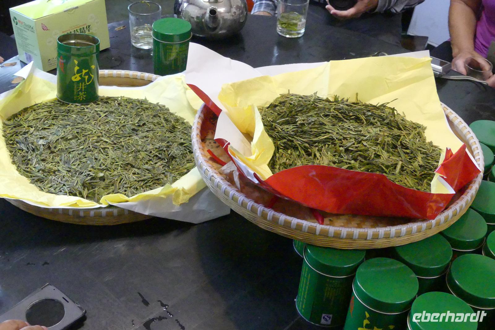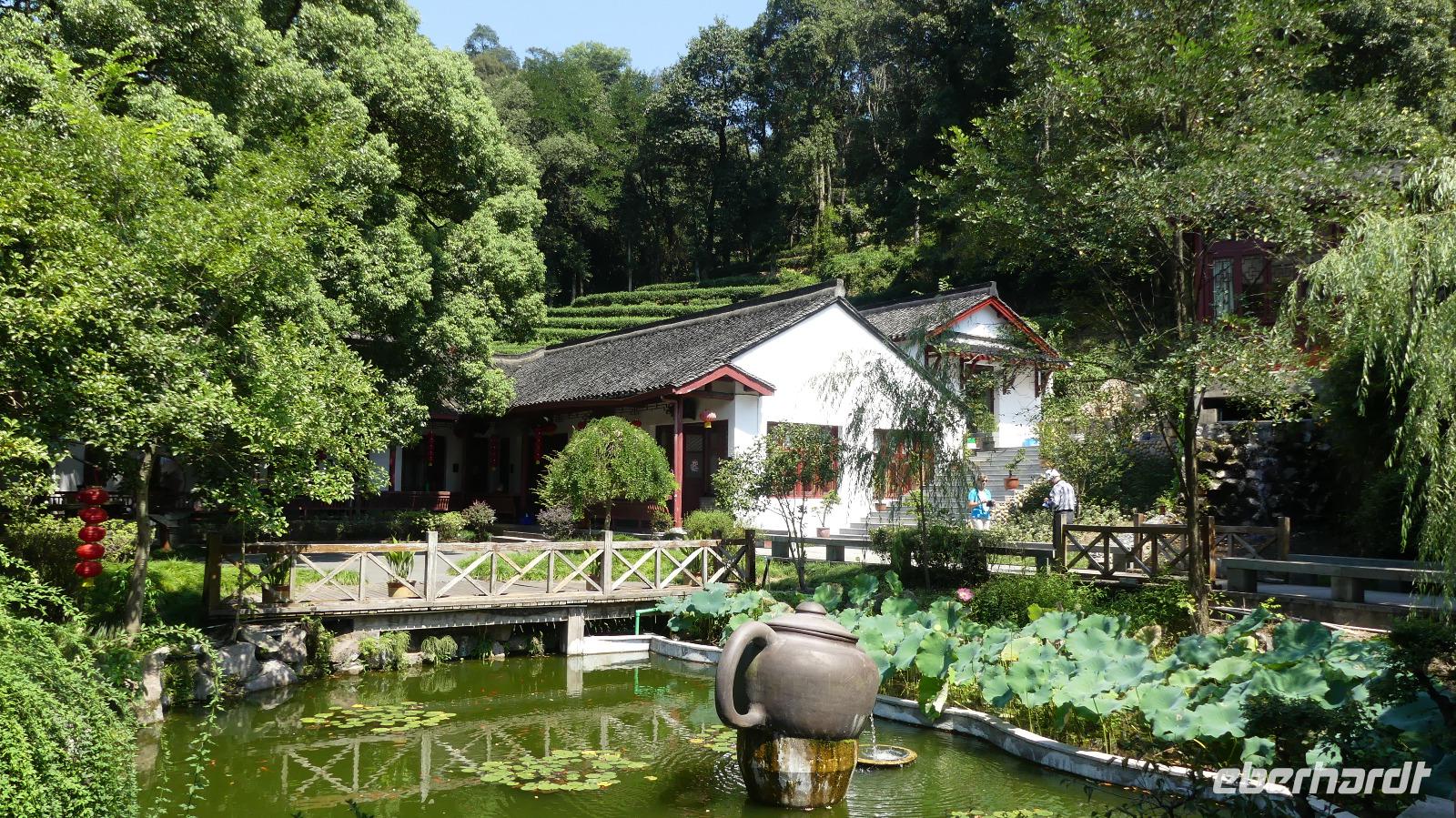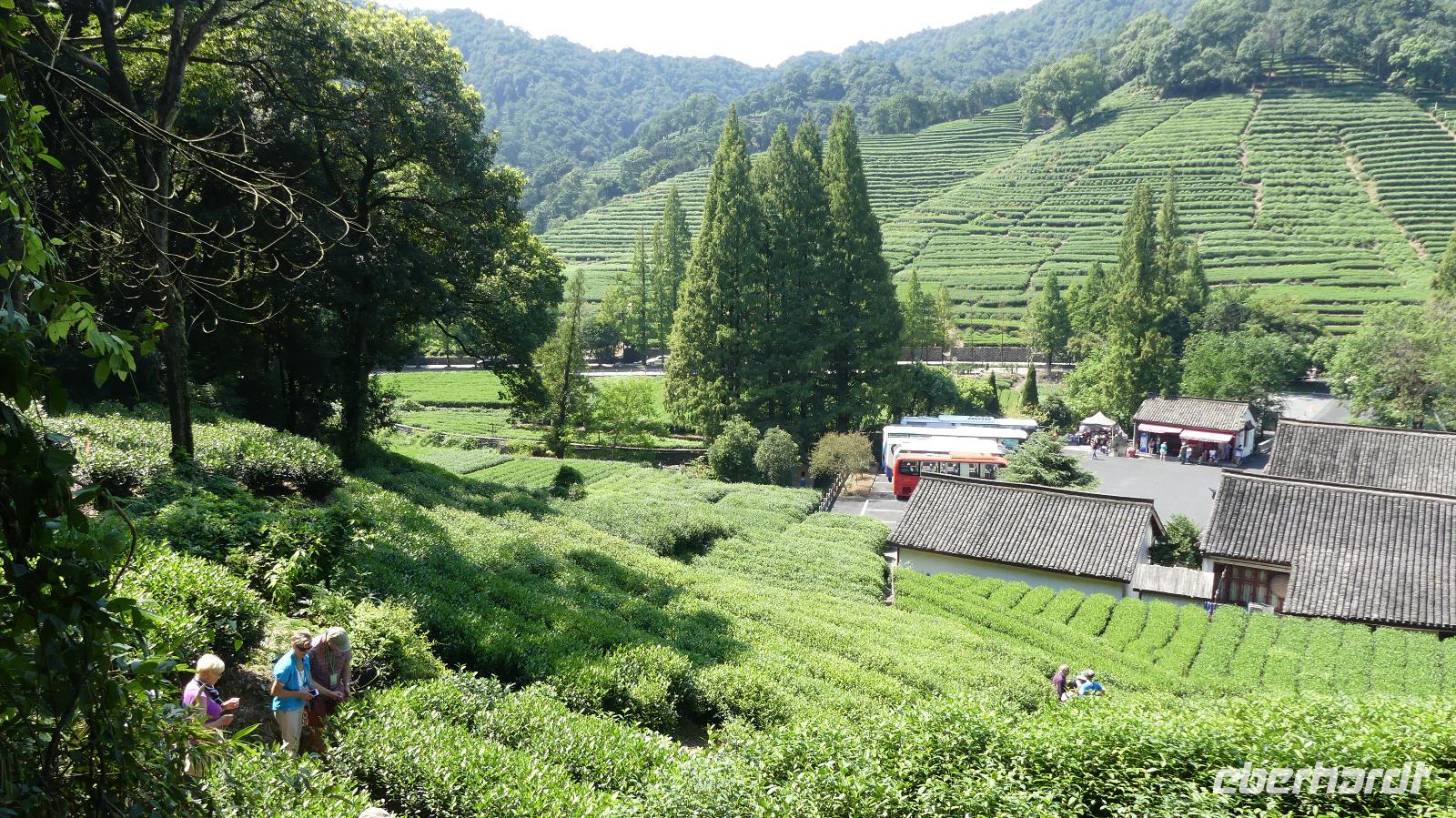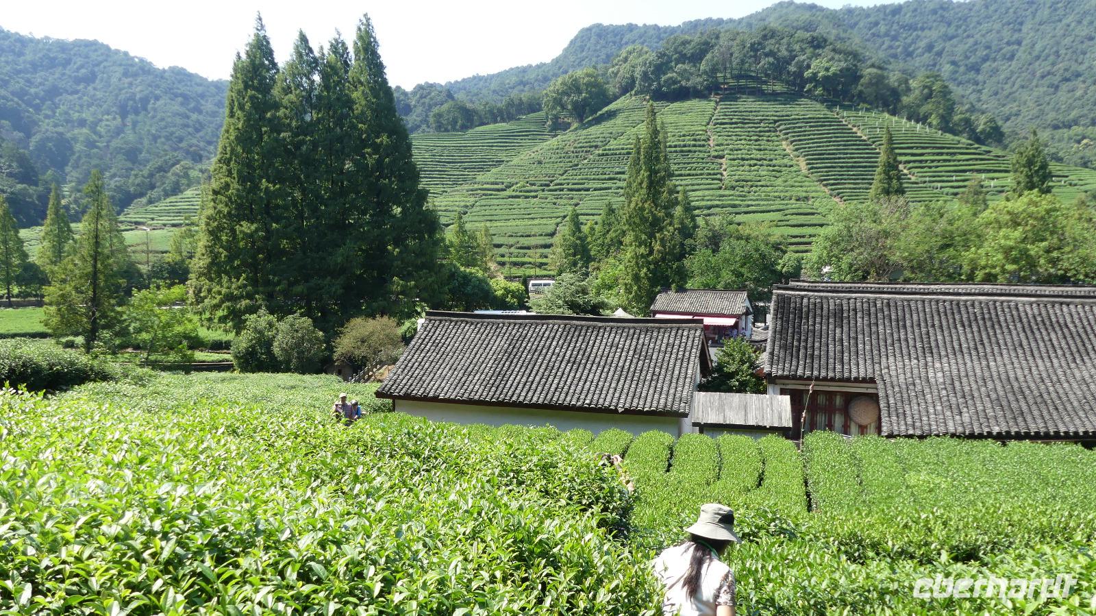 Etwas weiter im Tal erreichen wir eine Region mit saftig grünen Hängen. Es sind Teesträucher. Ein Dorf versteht es sehr gut, ihren grünen Tee als „Drachenbrunnentee" zu vermarkten. Der Name rührt einfach vom Namen des Quellwassers, mit dem der Tee aufgegossen wird. 200 bis 300 Yuan für 125 Gramm, je nach Qualität, sind uns dann auch etwas zu üppig (da gehen wir doch abends lieber in den Teeladen um die Ecke...)