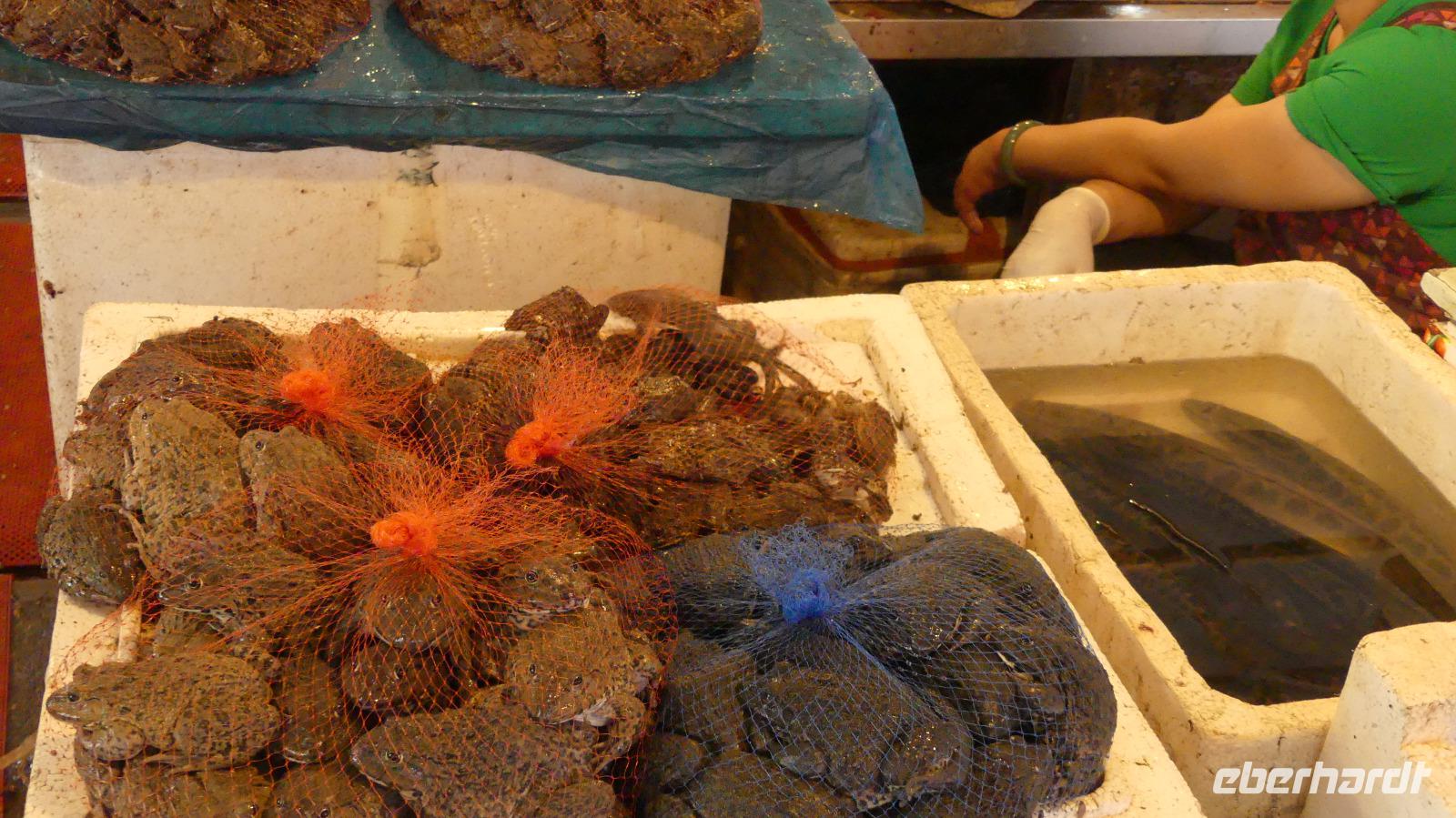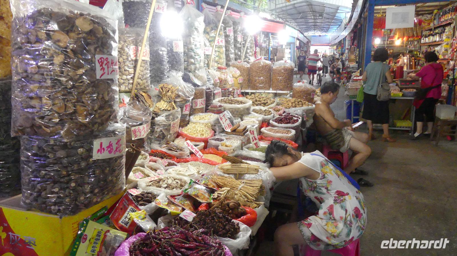 Mittags kommen wir für eine längere Pause ins Hotel, schließlich war die letzte Nacht ziemlich kurz. Mit neuen Kräften erkunden wir dann gemeinsam mit Lin die Stadt. Im überdachten Markt für Obst, Gemüse, Fisch, Frösche, Enten... probieren wir leckere Mango aus der Region. Lin zeigt uns noch einen Teil der Altstadt, einen wieder aufgebauten Altstadtbereich mit schmucken Läden (Teehaus, Geschäft mit Chili-Knoblauch-Mischung) und die Fußgängerzone.