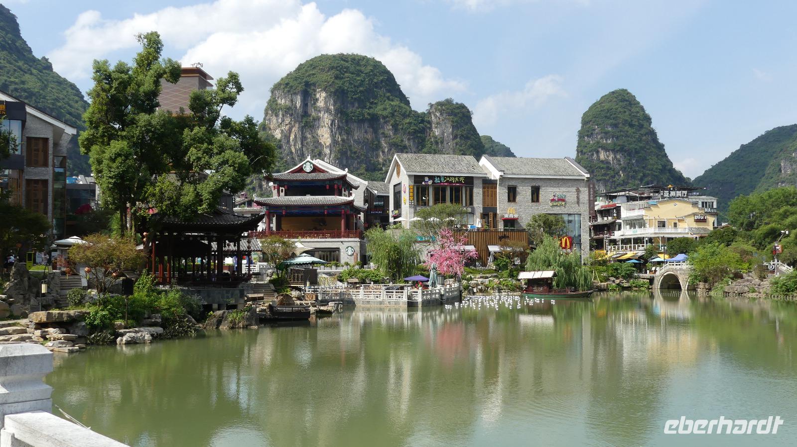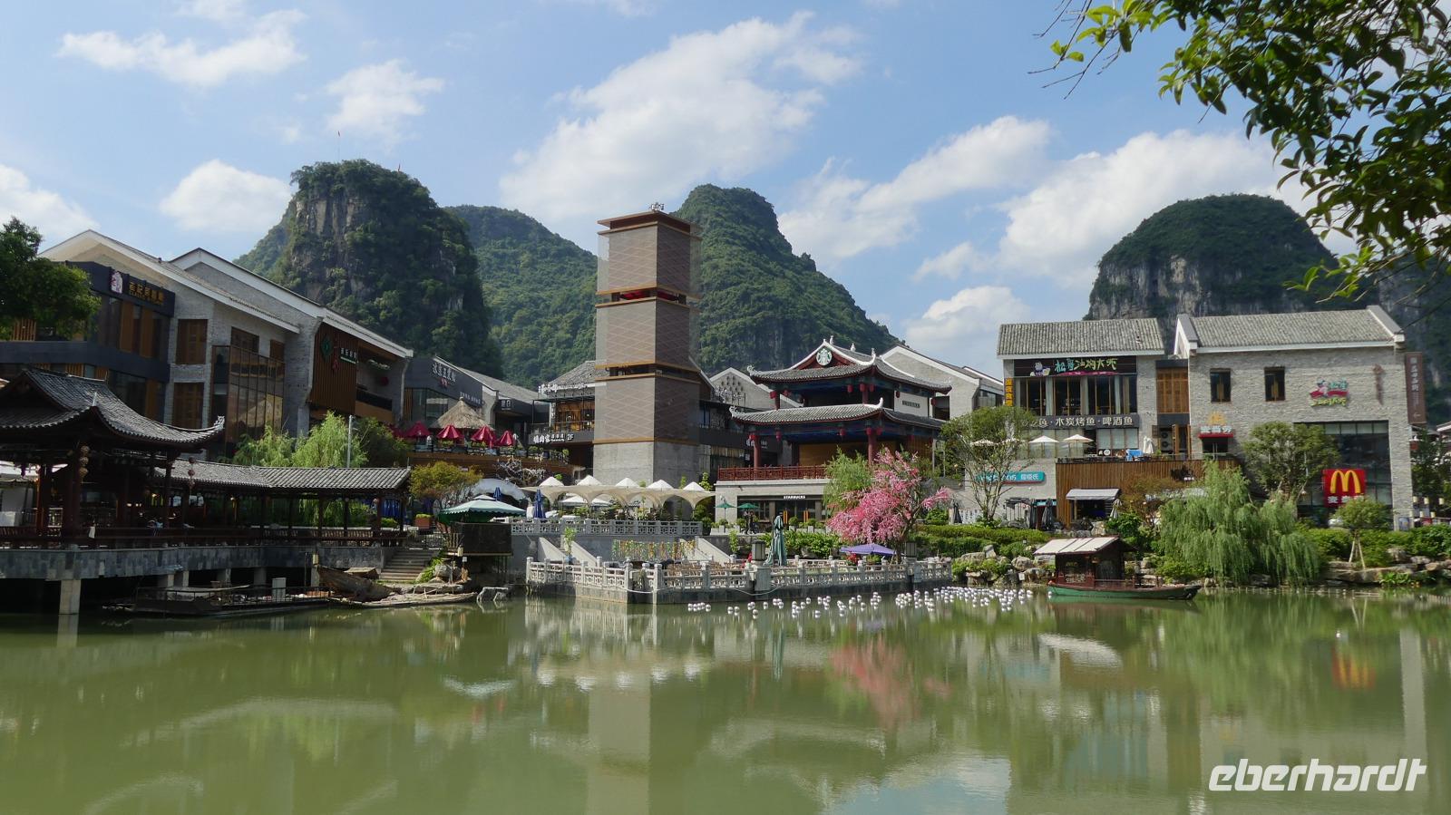Auf der 60 Kilometer langen Rückfahrt mit dem Bus nach Guilin, biegen wir zwischendurch mal ab in ein Dorf, gelegen am Drachenfluss. Wir suchen nach Motiven des Landlebens, also zum Beispiel weite Reisfelder, Wasserbüffel..., werden aber nicht fündig. Etwas später sehe ich am Straßenrand, wie ein großer Vergnügungspark vor der Kulisse dieser schönen Berge entsteht.