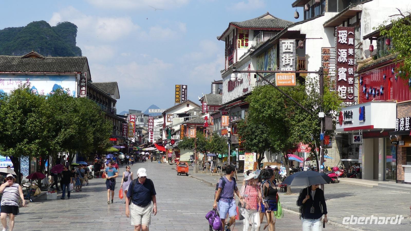 Es ist die wohl berühmteste Landschaft Chinas, märchenhafte Berge, Karstkegel, Weltnaturerbe... Wir haben heute das Glück bei schönem Wetter auf dem Li-Fluss durch diese faszinierende Landschaft zu fahren. Vier Stunden dauert diese Reise auf dem Nebenfluss des Perlenflusses. Wir sind lang genug in China unterwegs, um zu wissen, dass wir nicht die einzigen Touristen hier sein werden und fast schon erwartungsgemäß werden die chinesischen Touristen auf dem Schiff mit nie enden wollenden Lautsprecheransagen animiert...In kurzen Momenten der Ruhe kann man dann vom offenen Oberdeck die Zikaden in den Bambuswäldern zirpen hören. Unsere Schiffskarawane legt am Ende der Fahrt im Städtchen Yangshuo an. Auch hier werden wir auch schon erwartungsgemäß am Ausstieg durch eine Ladenstraße geschoben... Yangshuo liegt wunderschön am Li-Fluß und zu Füßen von Karstkegeln. Die Innenstadt ist sehr touristisch, sogar einen deutschen Biergarten gibt es hier. Lin meint, manche Chinesen glauben, dass in Deutschland das Bier aus dem Wasserhahn kommt...