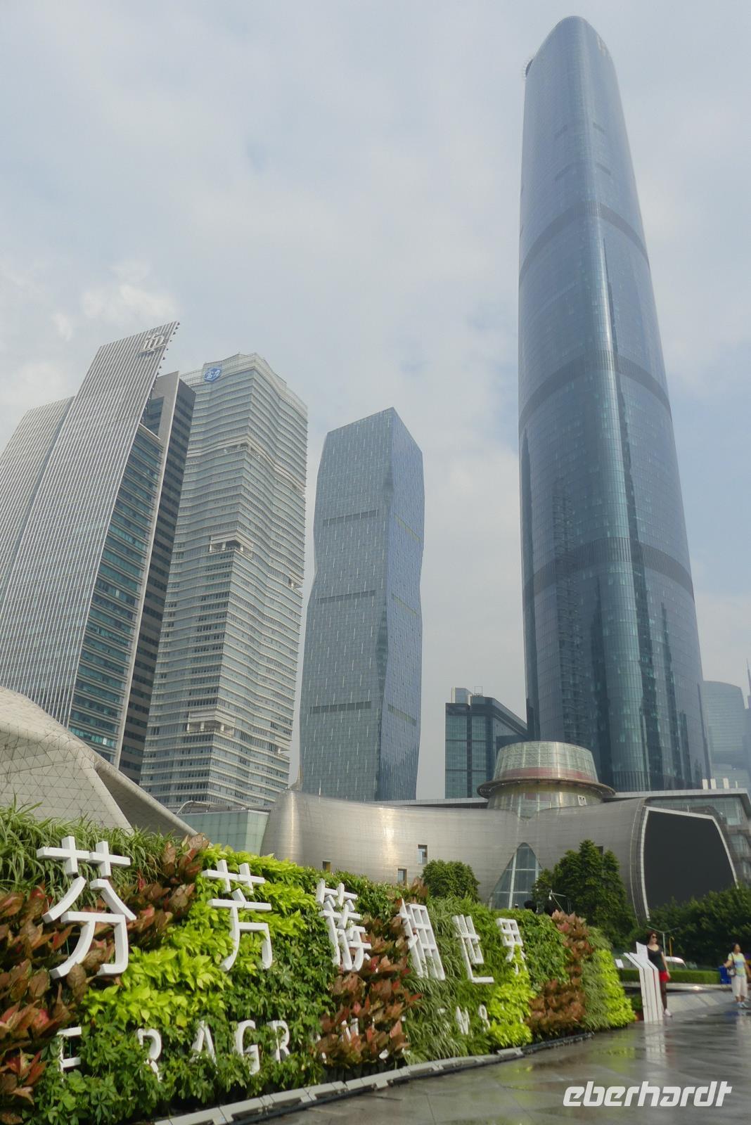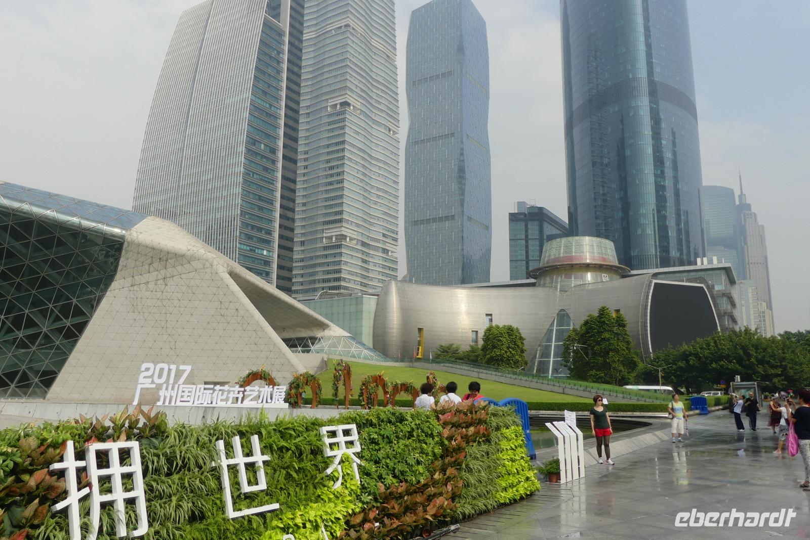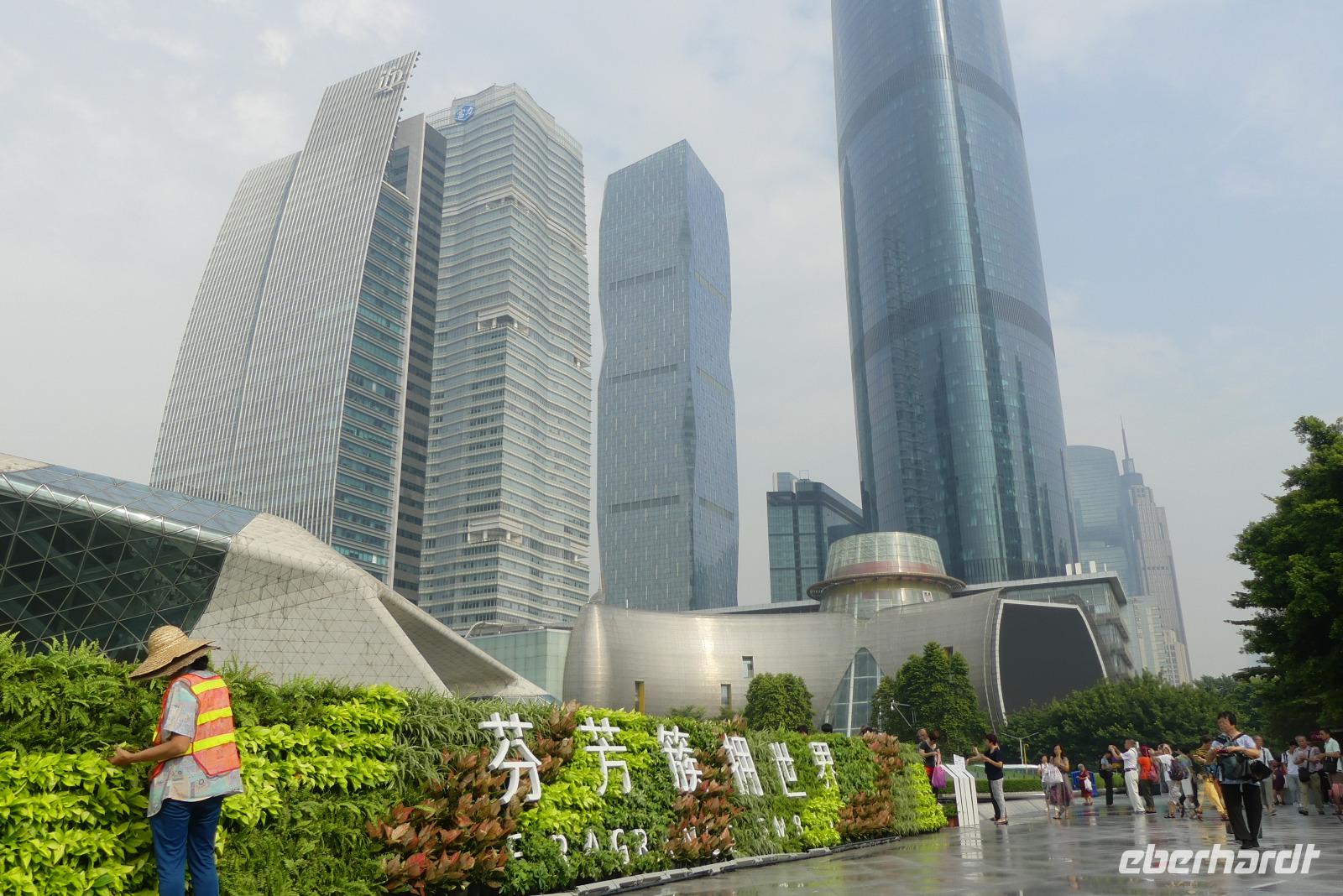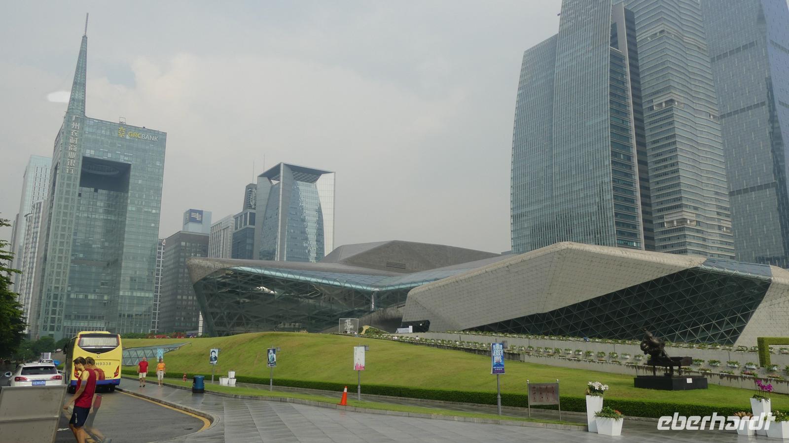 Nach einem Regenschauer strahlt am Morgen wieder die Sonne, als wir an der Oper im neuen Stadtviertel Zhujiang New Town für einen Fotostop halten (erstmal beschlagen bei diesem feuchtwarmen Klima die Fotolinsen). Das moderne Operngebäude, ein Entwurf von Zaha Hadid (aus Bagdad stammend), liegt zu Füßen von Wolkenkratzer wie den Zwillingstürmen International Finance Center (440 Meter hoch). Am anderen Ufer des Perlenflusses ragt der Kanton Tower 600 Meter in den Himmel. Lin meint, er mußte um 10 Meter gekürzt werden, um den Luftverkehr nicht zu gefährden. Nun wird es, sich von Lin zu verabschieden. Gern hätten wir sie noch nach Hongkong mitgenommen. Es war eine große Freude mit ihr zu reisen. Sie hat viel für uns organisiert, schon wenn ich allein an die gemeinsamen Abendessen in Restaurants außerhalb der Hotels denke.