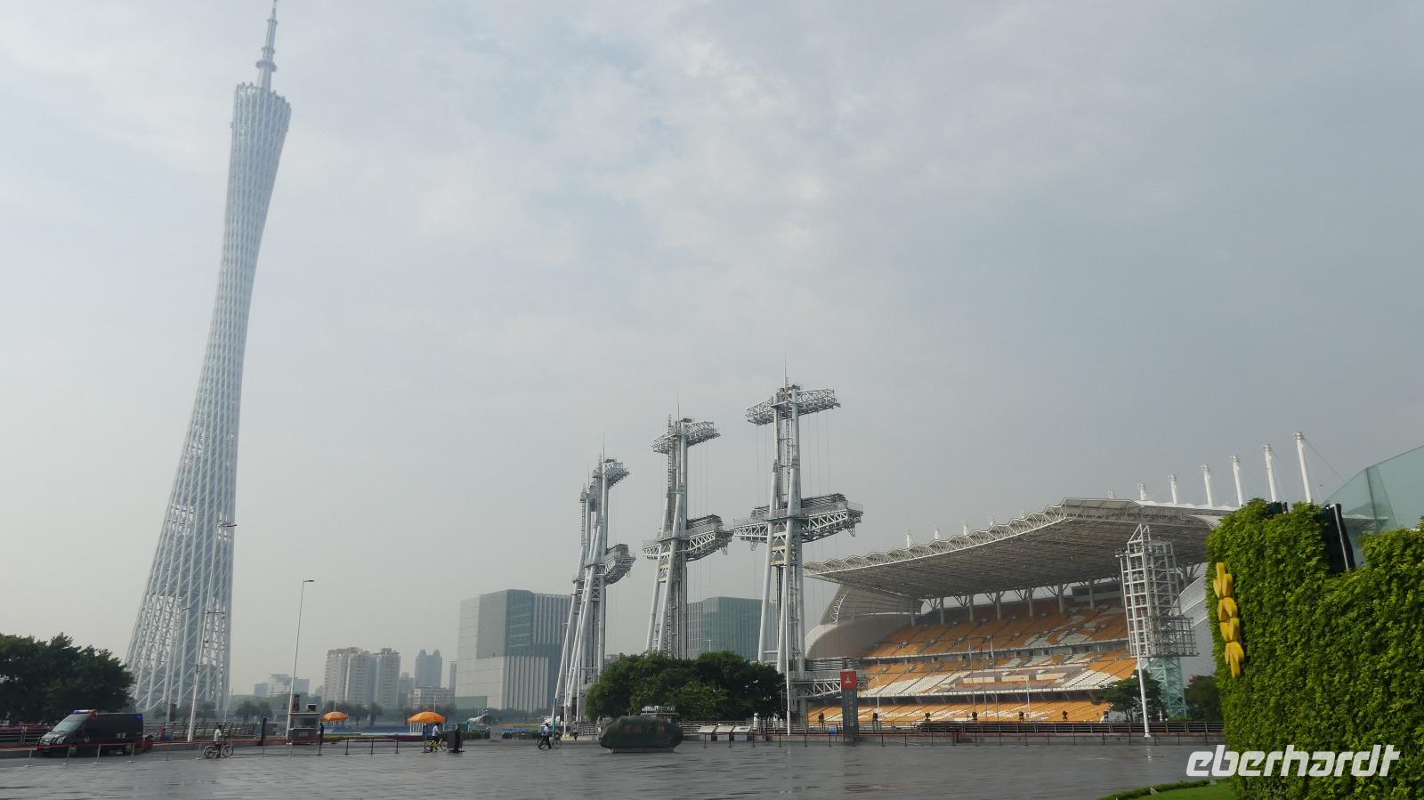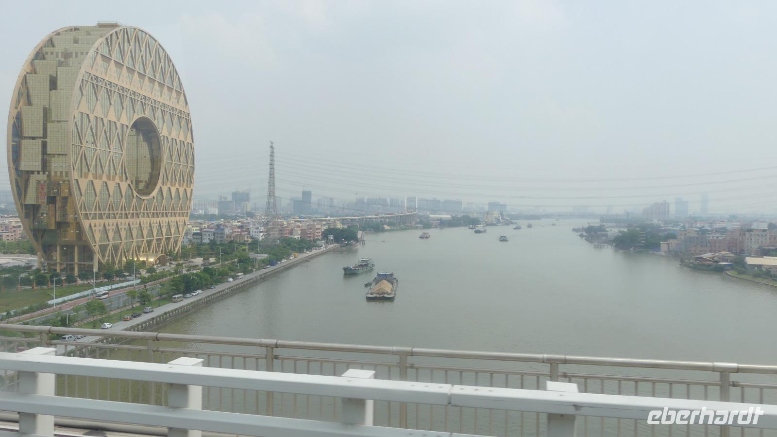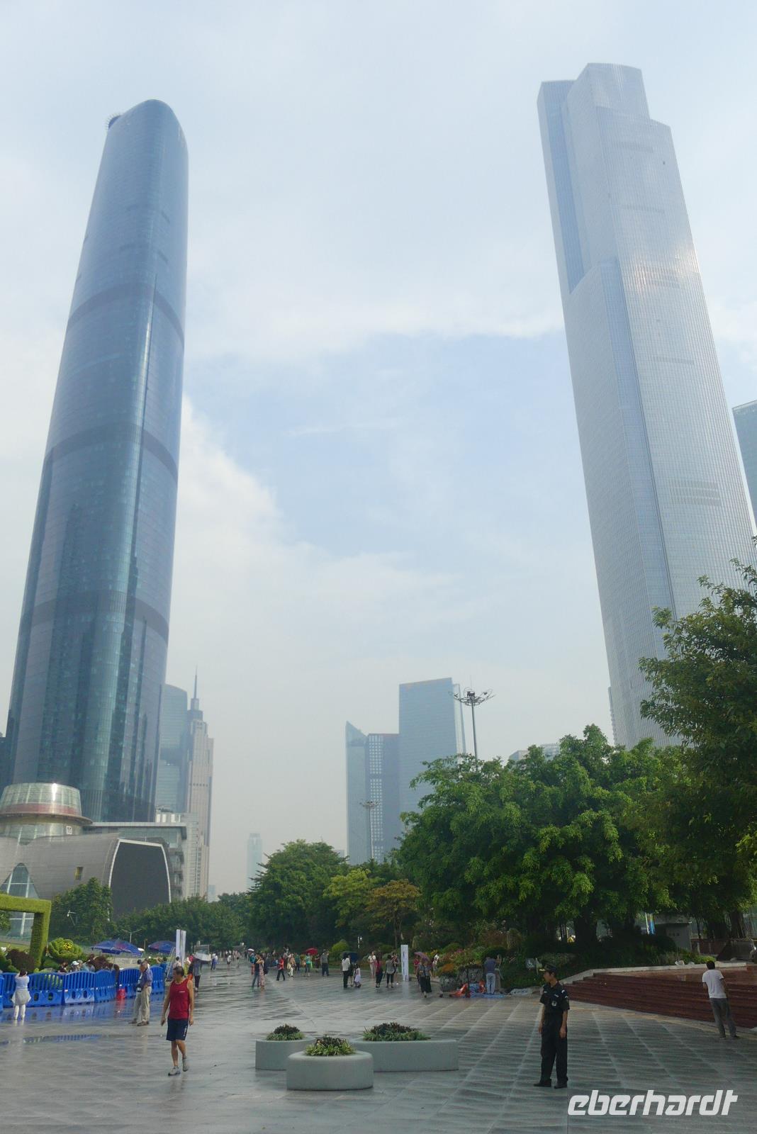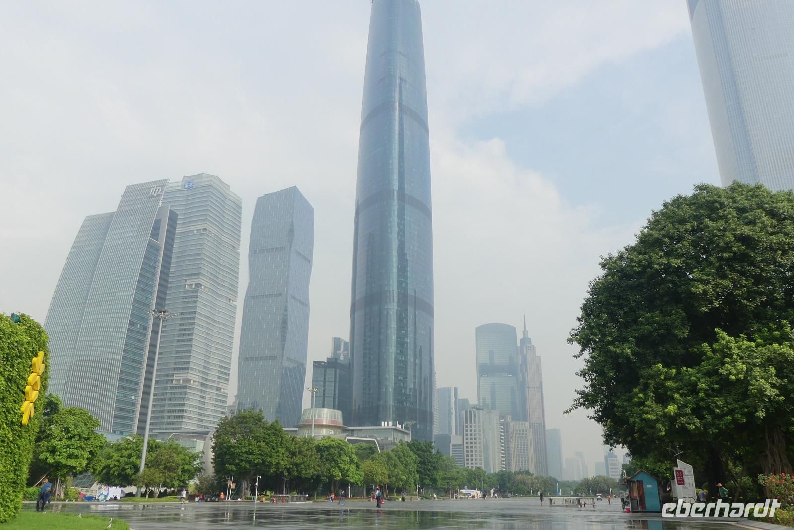 Nach einem Regenschauer strahlt am Morgen wieder die Sonne, als wir an der Oper im neuen Stadtviertel Zhujiang New Town für einen Fotostop halten (erstmal beschlagen bei diesem feuchtwarmen Klima die Fotolinsen). Das moderne Operngebäude, ein Entwurf von Zaha Hadid (aus Bagdad stammend), liegt zu Füßen von Wolkenkratzer wie den Zwillingstürmen International Finance Center (440 Meter hoch). Am anderen Ufer des Perlenflusses ragt der Kanton Tower 600 Meter in den Himmel. Lin meint, er mußte um 10 Meter gekürzt werden, um den Luftverkehr nicht zu gefährden. Nun wird es, sich von Lin zu verabschieden. Gern hätten wir sie noch nach Hongkong mitgenommen. Es war eine große Freude mit ihr zu reisen. Sie hat viel für uns organisiert, schon wenn ich allein an die gemeinsamen Abendessen in Restaurants außerhalb der Hotels denke.