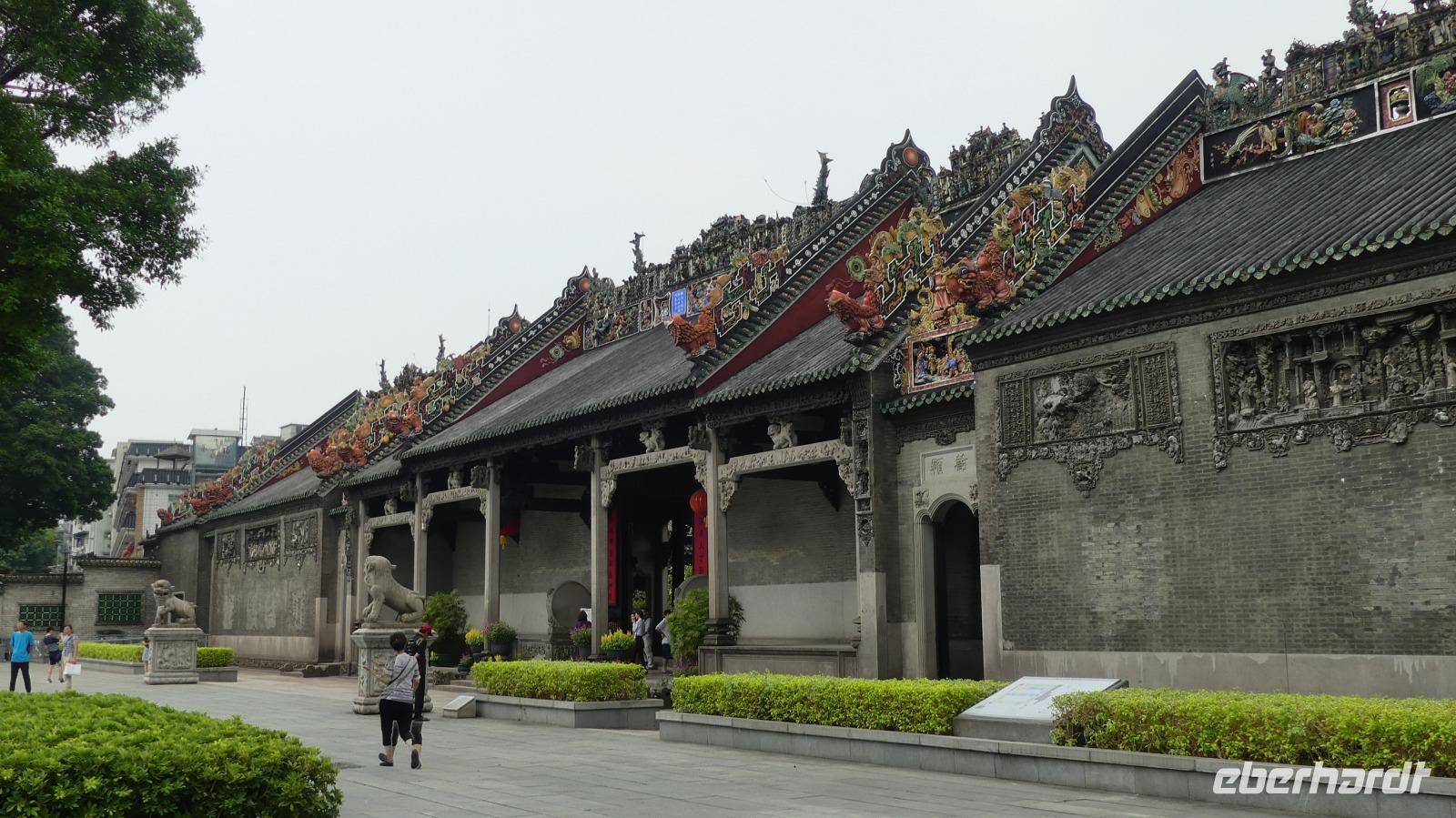 Pünktlich um 8.30 Uhr fährt unser Schnellzug in Guilin Richtung Kanton ab. Für einige Zeit sehen wir noch das für die Region Guilin bekannte Landschaftsbild mit den Karstkegeln. Nach fast 500 Kilometer Fahrt erreichen wir gegen 11.00 Uhr den Südbahnhof von Guangzhou, also Kanton. Nach längerer Busfahrt vom Bahnhof in die Stadt besuchen wir den Ahnentempel der Familie Chen, eine besonders prunkvolle Tempelanlage mit feinen Steinmetzarbeiten, Holzschnitzereien und farbenfrohen Figuren auf den Dächern. Es folgt noch eine buddhistische Klosteranlage, benannt nach den riesigen Bäumen im Innenhof - „Kloster der sechs Banyanbäume". Botanisch geht es weiter im Orchideenpark. Neben einigen blühenden Orchideen finden wir viele andere Pflanzen der Region wie Bananenstauden oder verschieden Bambussorten.