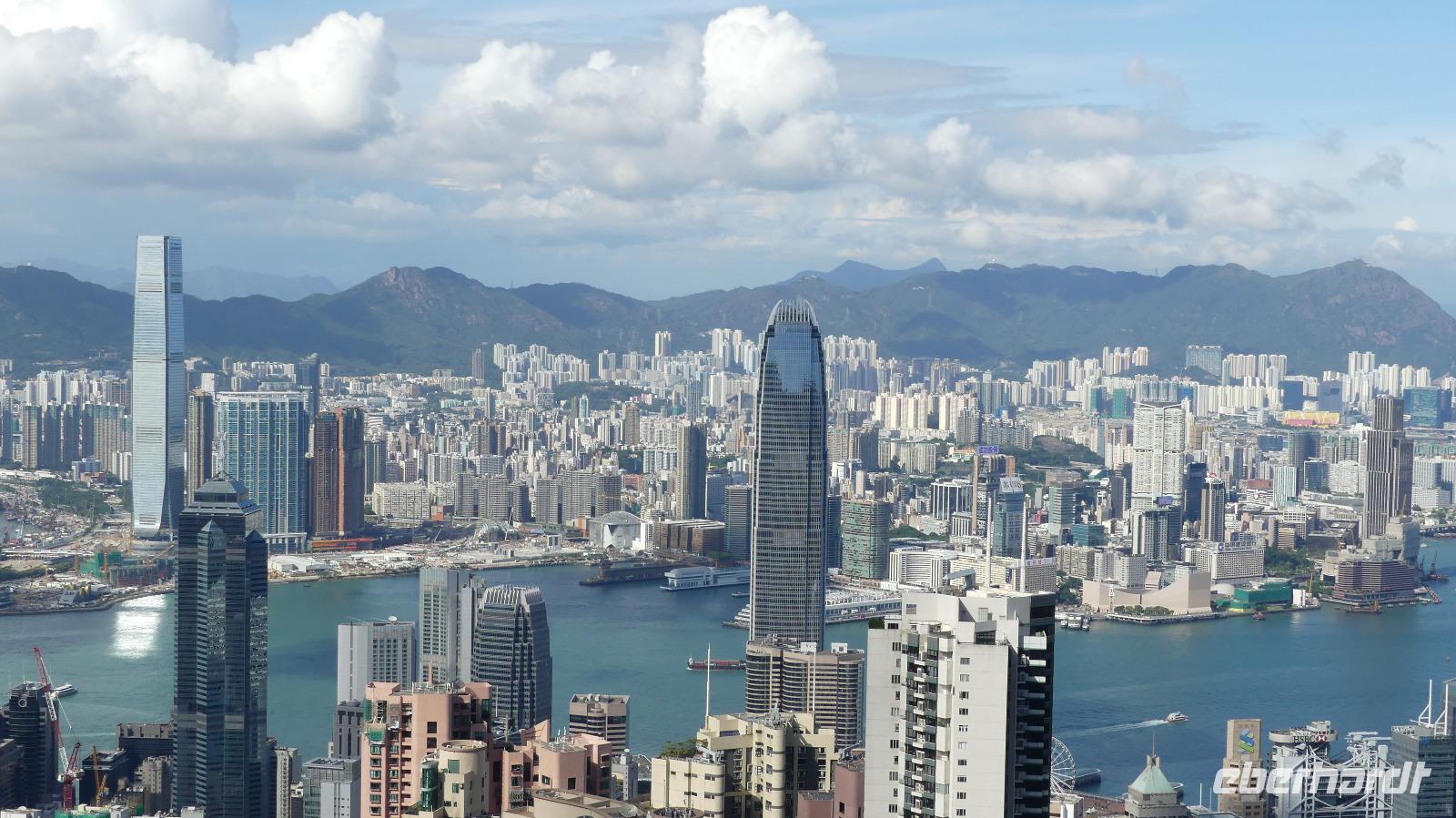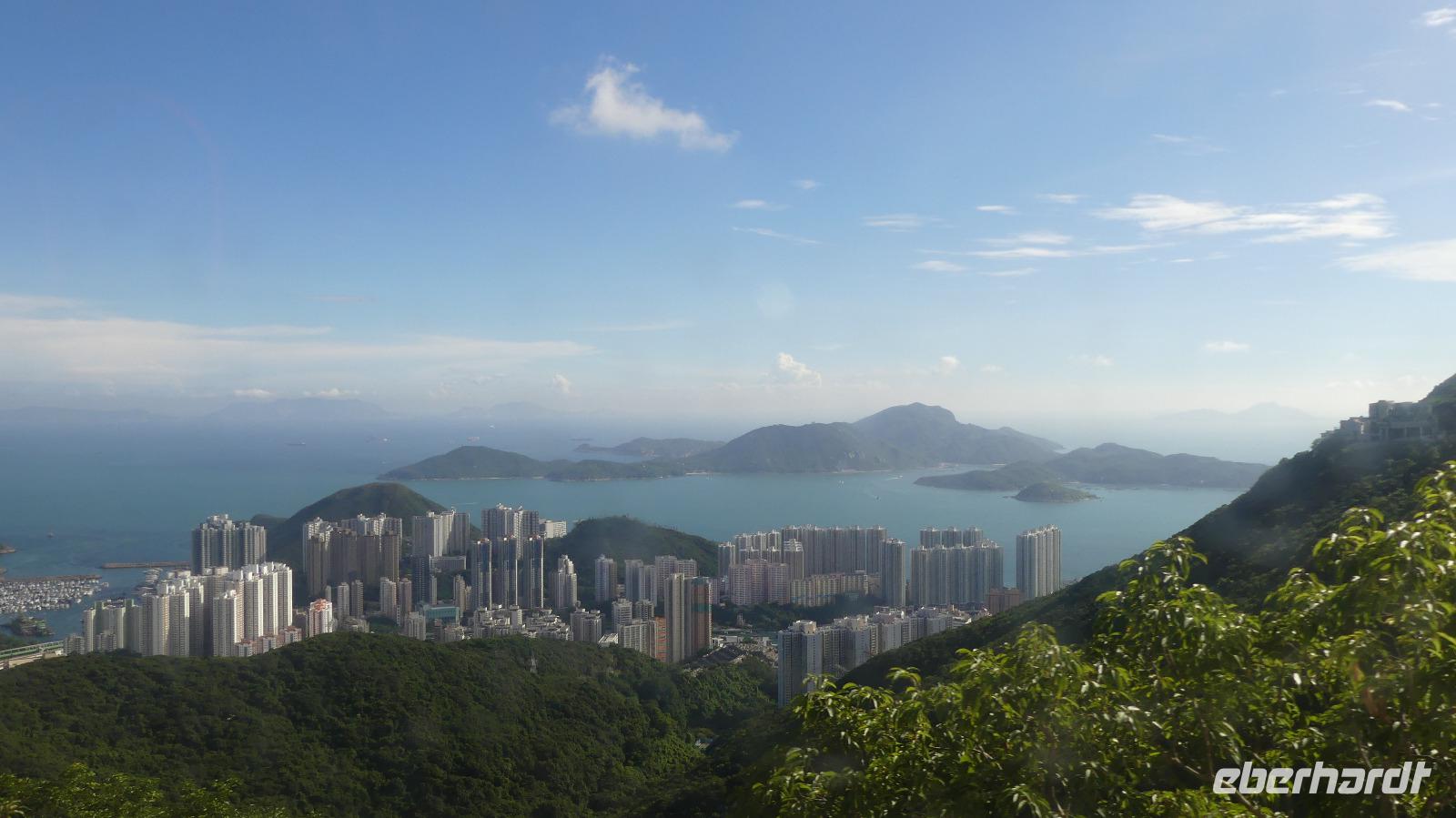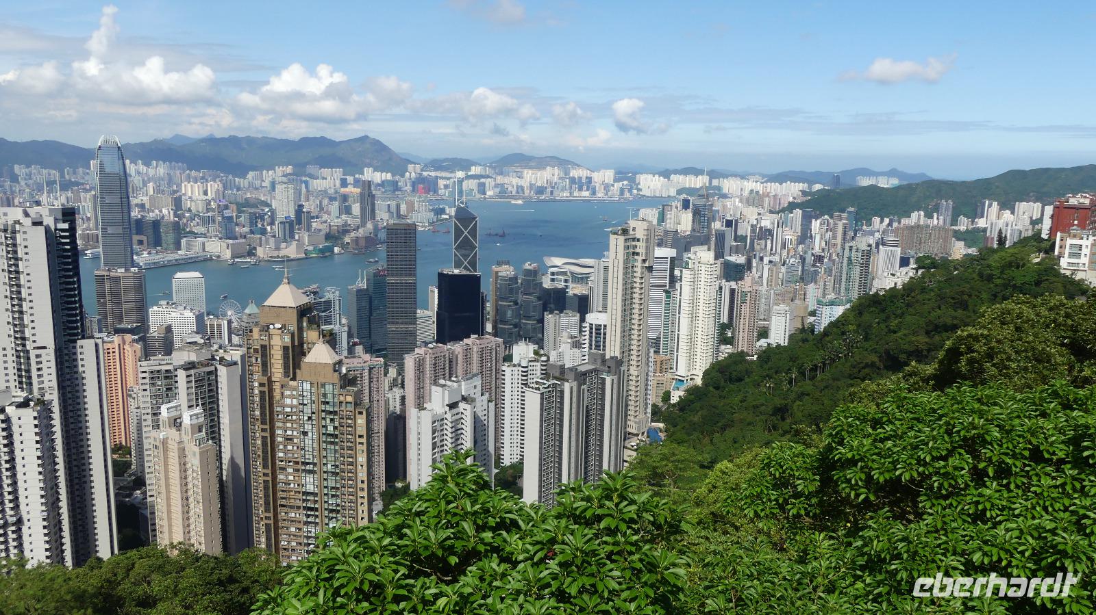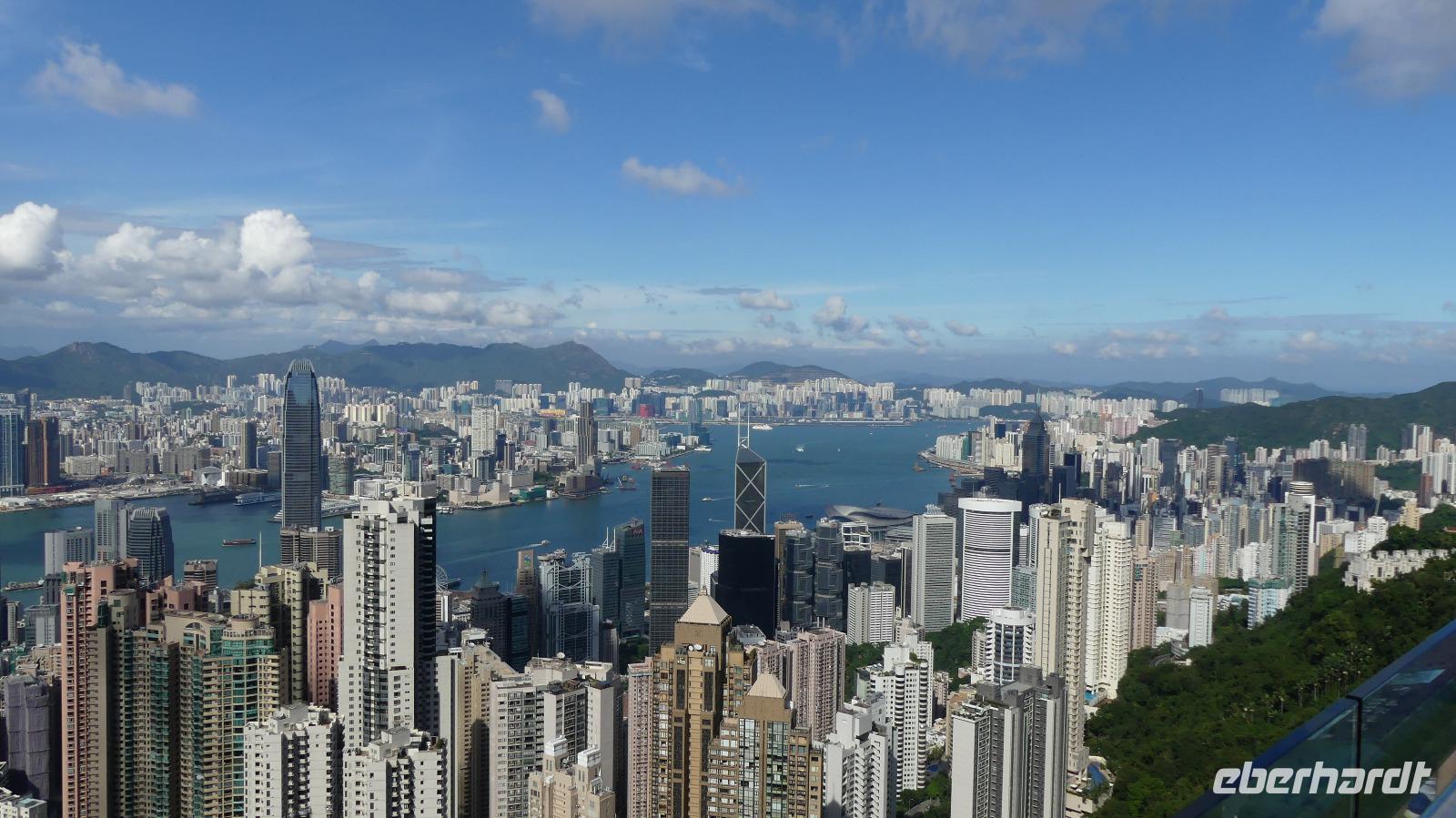 Mit der Fähre, einem schnellen Katamaran reisen wir jetzt nach Hongkong. Je näher wir der Sonderzone Hongkong kommen, umso besser wird das Wetter und meine Hoffnung auf gute Sichtverhältnisse wachsen. Schließlich gehen wir bei schönem Sonnenschein in Hongkong von Bord. Obwohl seit 1997 zu China gehörend ist es doch eine Reise wie in ein eigenes Land: Aus- und Einreiseformalitäten, sie haben ihre eigene Währung, auf den Straßen fahren sie links, sie haben eigen Pässe und plötzlich können alle Chinesen englisch sprechen zu dem berühmten Aussichtspunkt und es wirklich ein sehr beeindruckender Blick! Hier liegt uns bei besten Sichtverhältnissen Hongkong zu Füßen, was für ein Glück wir haben.