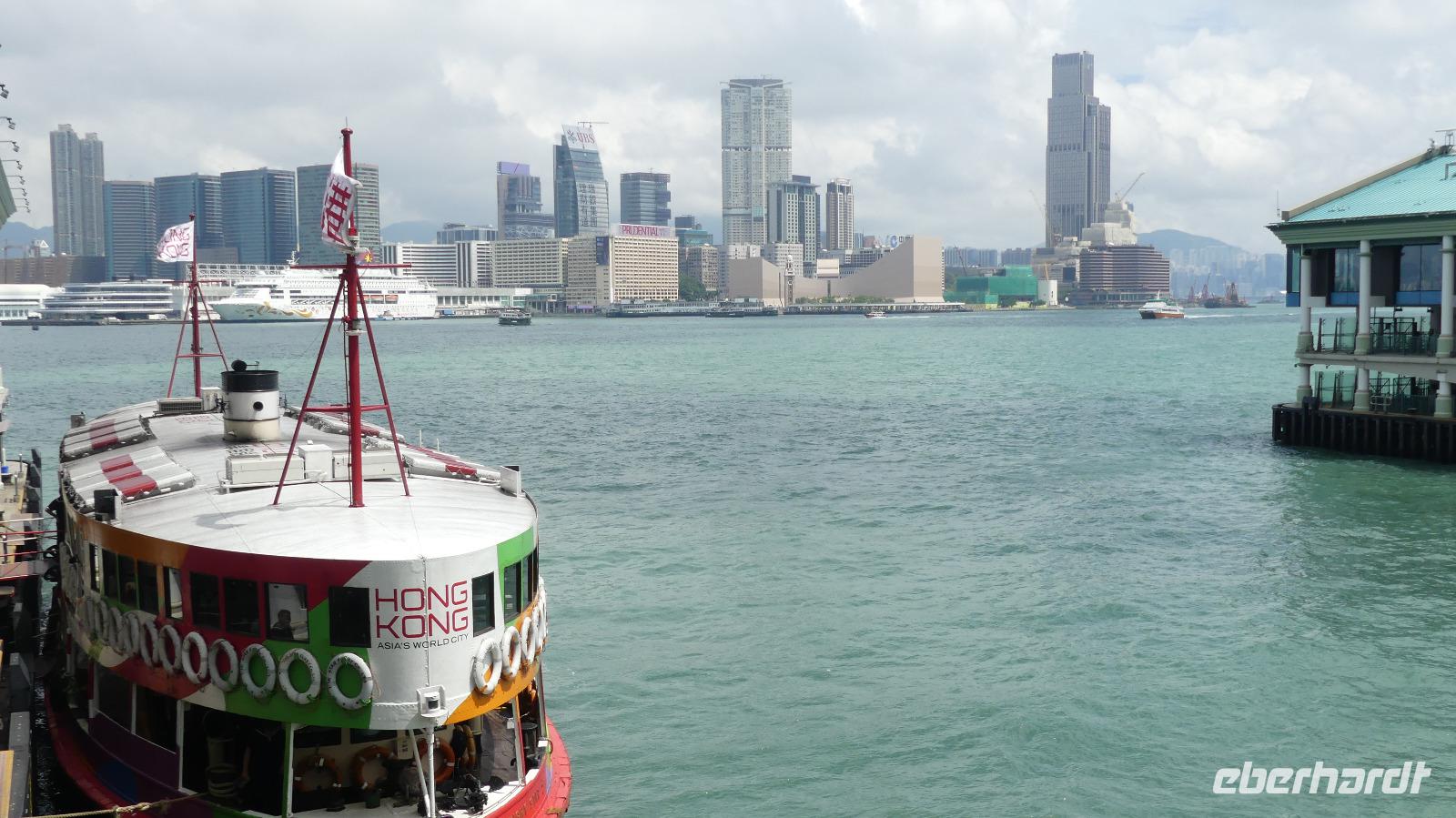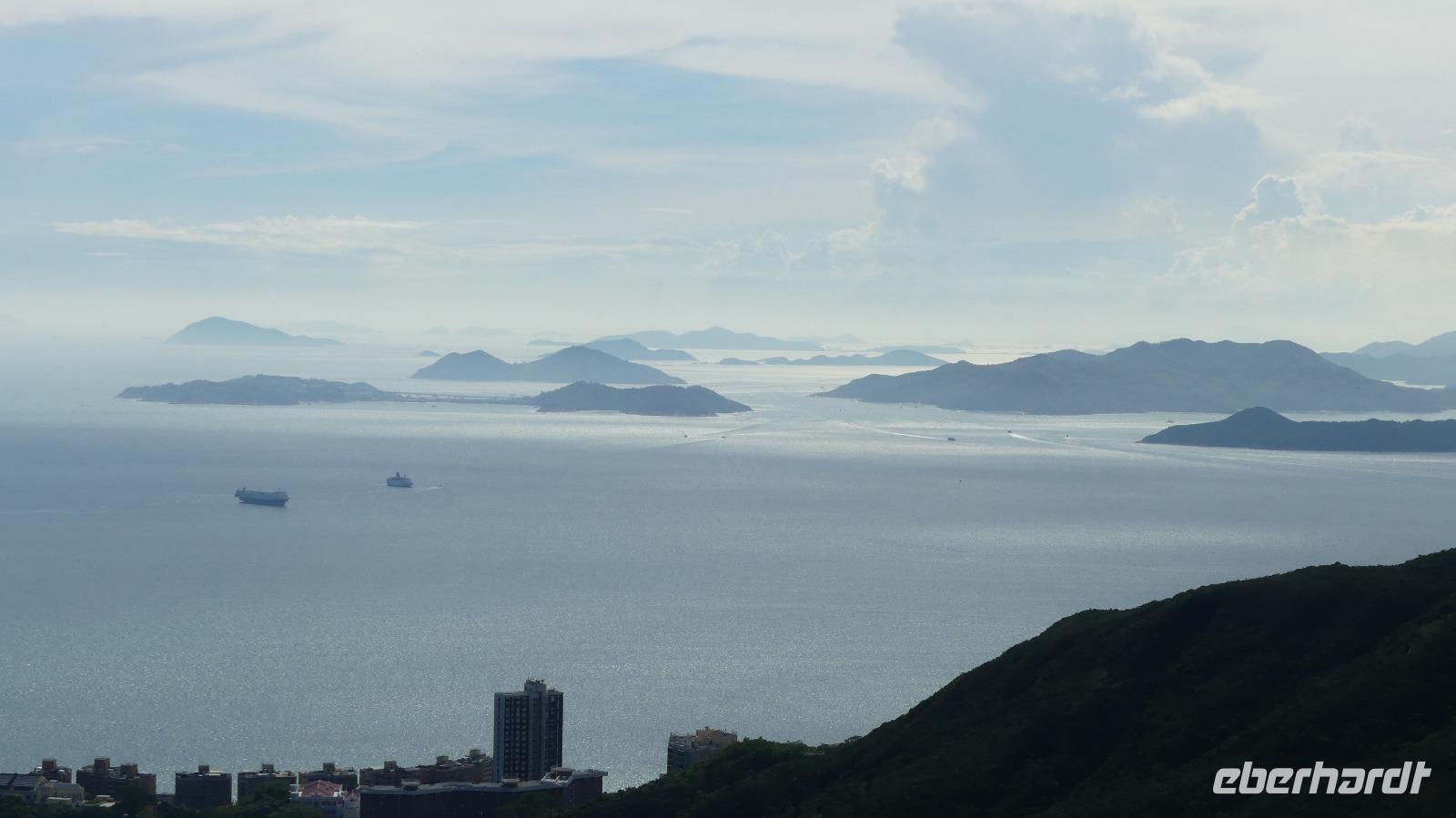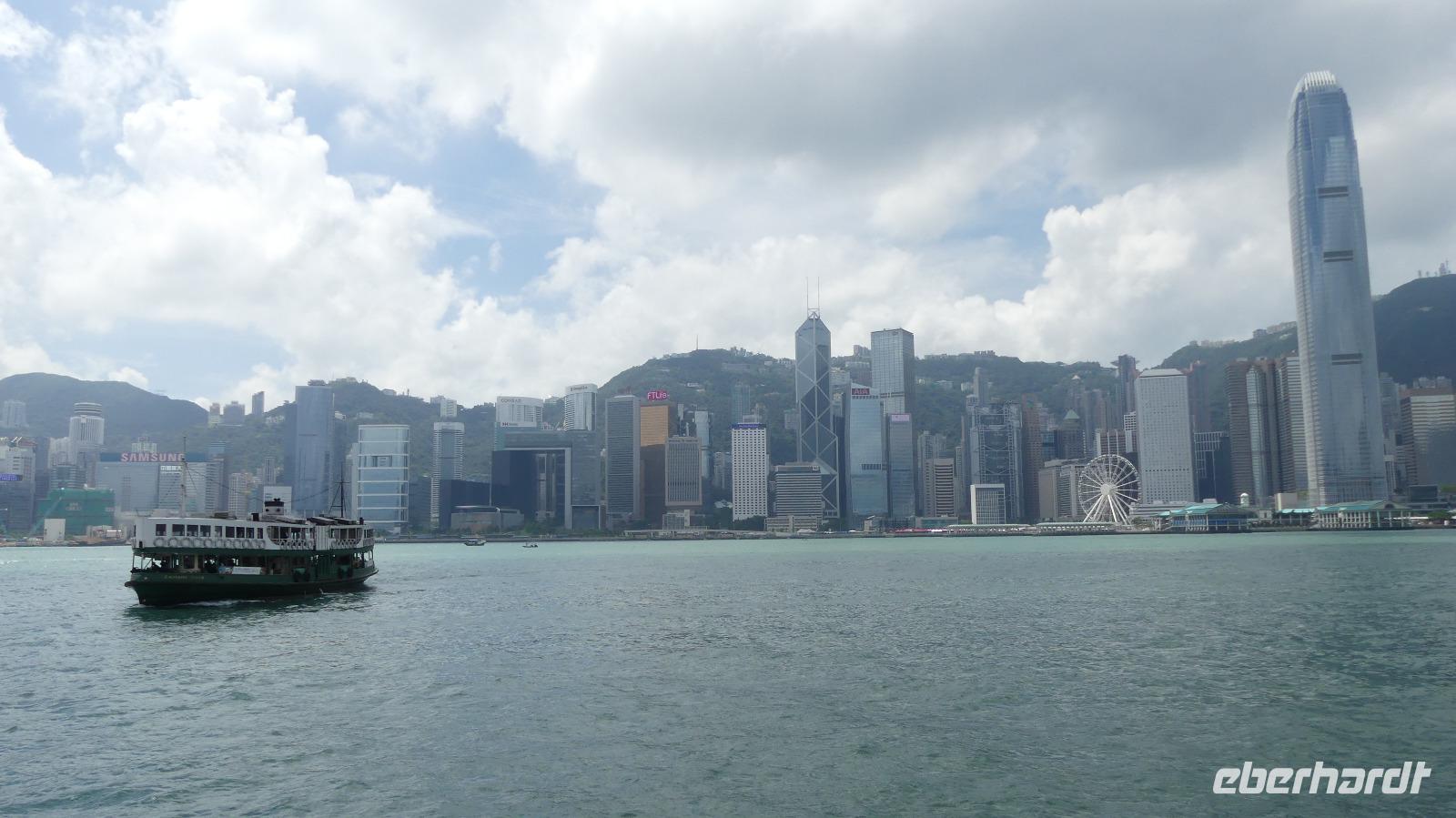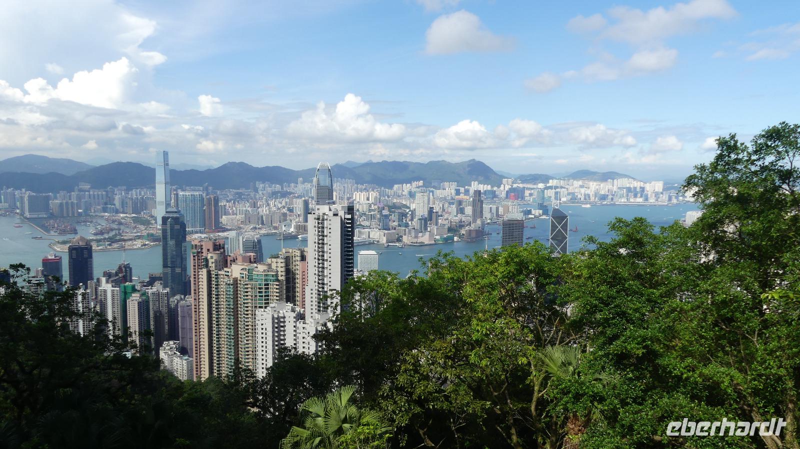 Mit der Fähre, einem schnellen Katamaran reisen wir jetzt nach Hongkong. Je näher wir der Sonderzone Hongkong kommen, umso besser wird das Wetter und meine Hoffnung auf gute Sichtverhältnisse wachsen. Schließlich gehen wir bei schönem Sonnenschein in Hongkong von Bord. Obwohl seit 1997 zu China gehörend ist es doch eine Reise wie in ein eigenes Land: Aus- und Einreiseformalitäten, sie haben ihre eigene Währung, auf den Straßen fahren sie links, sie haben eigen Pässe und plötzlich können alle Chinesen englisch sprechen zu dem berühmten Aussichtspunkt und es wirklich ein sehr beeindruckender Blick! Hier liegt uns bei besten Sichtverhältnissen Hongkong zu Füßen, was für ein Glück wir haben.