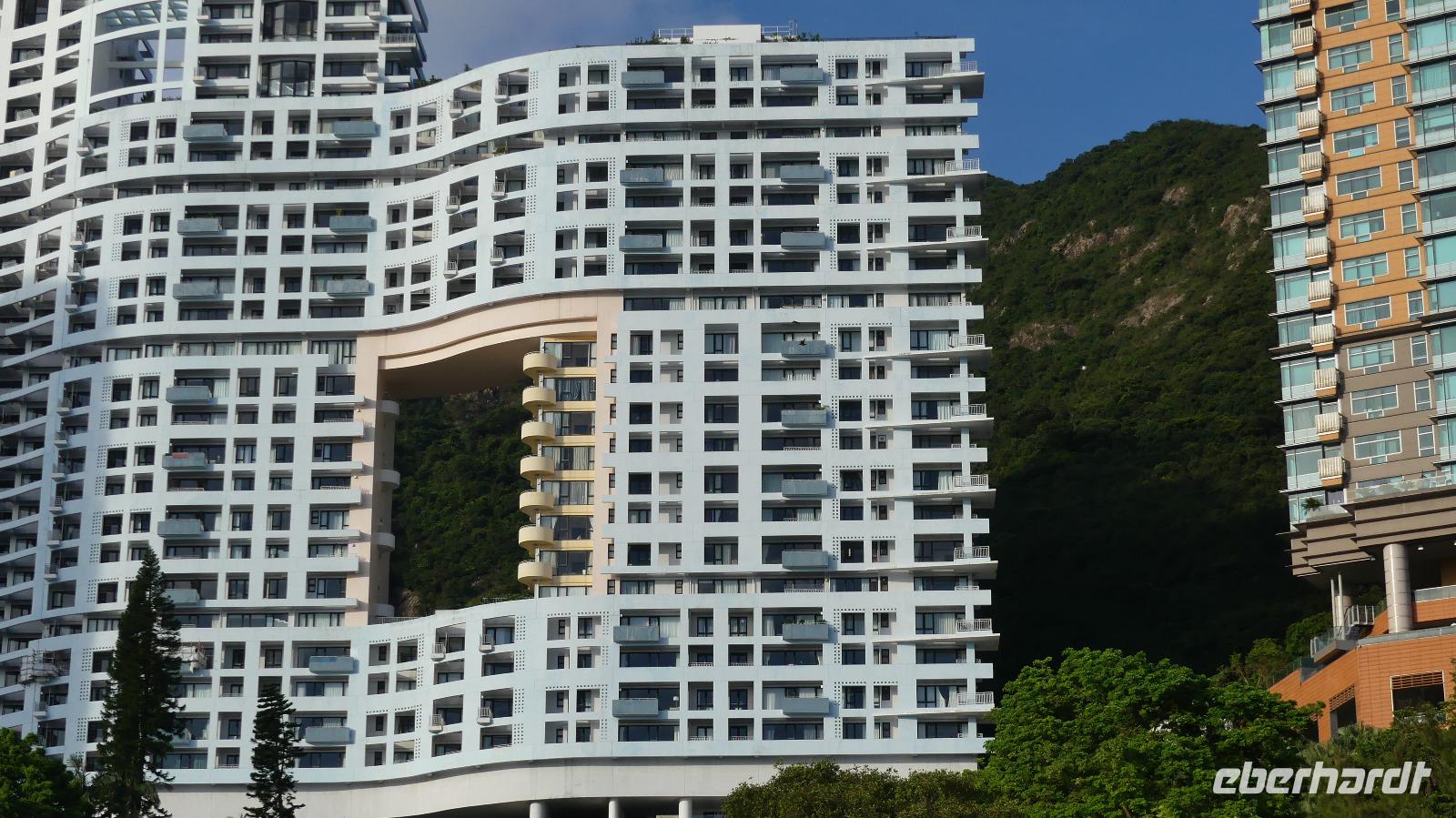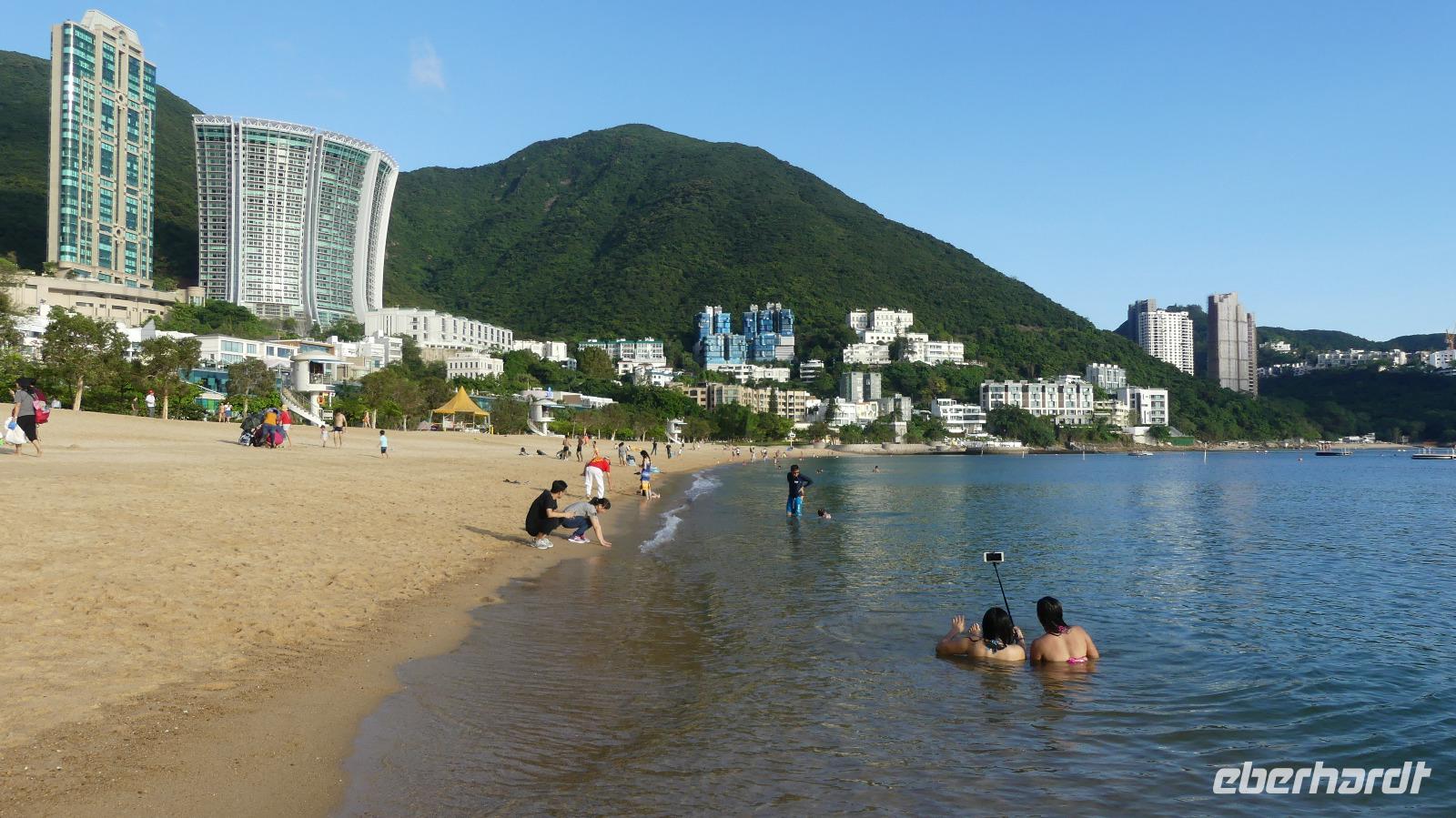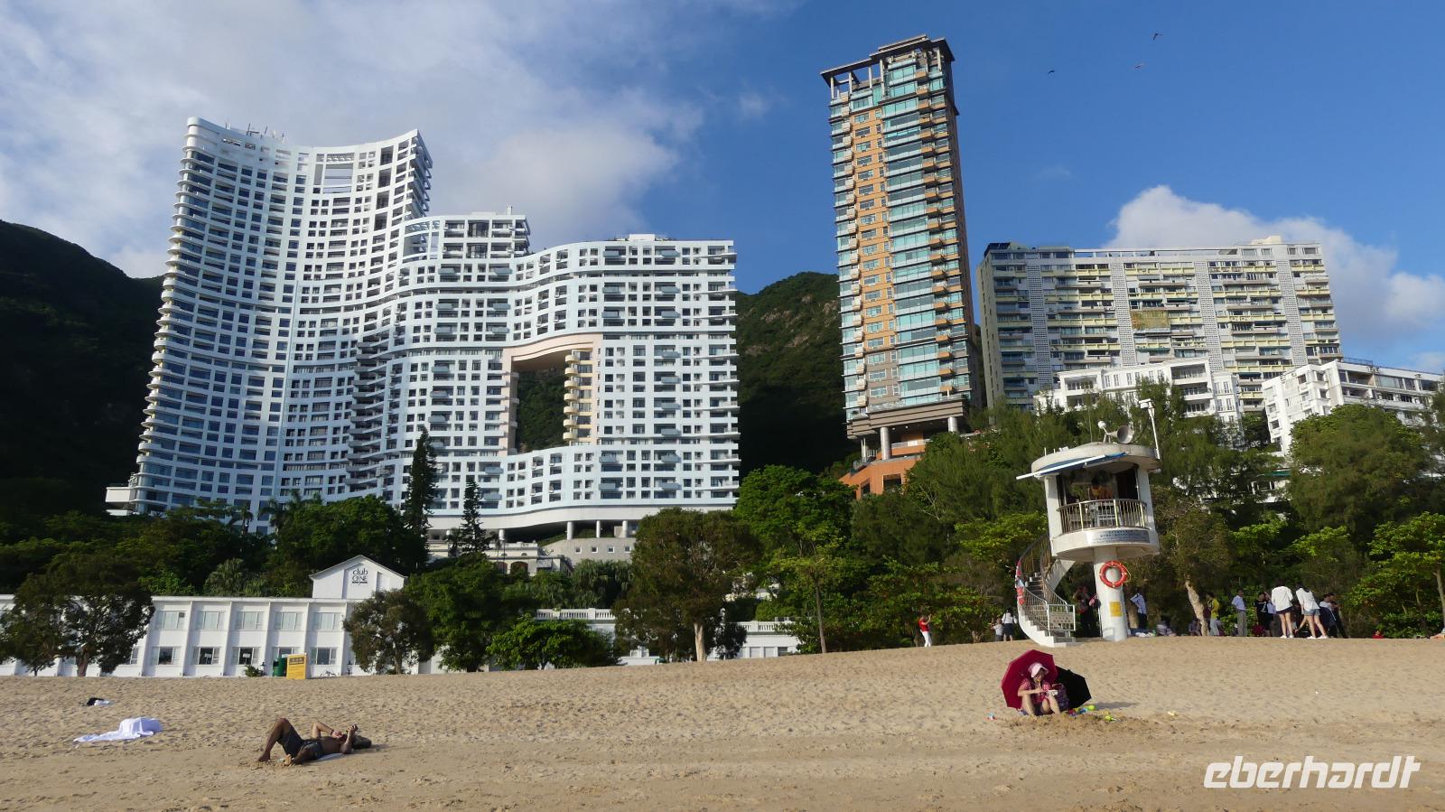 Das „New York Chinas" zeichnet sich durch Extreme aus: über 300 Wolkenkratzer mit mehr als 150 Meter Höhe, soviel gibt es in keiner anderen Stadt. Nirgendwo sonst leben Menschen so dicht zusammen und gleich daneben Naturschutzgebiete mit seltenen Arten, die es sonst in China gar nicht mehr gibt. 41% der Fläche sind streng geschütztes Naturschutzgebiet! So kann man hier innerhalb von 40 - 50 Minuten dem Trubel der Stadt in die Natur entfliehen, zum Beispiel an einen der vielen Strände. Wir selbst fahren in wenigen Minuten vom Victoria Peak über Aberdeen an den Strand der Repulse Bay. Sauberes, 26 Grad warmes Meerwasser laden ein, zumindest mal mit den Füßen einzutauchen.... Blickt man zurück aufs Land, fällt das Gebäude mit dem „Loch" auf - nach Fengshui ist dieses notwendig, damit der Drachen als Glücksbringer freie Flugbahn hat.
