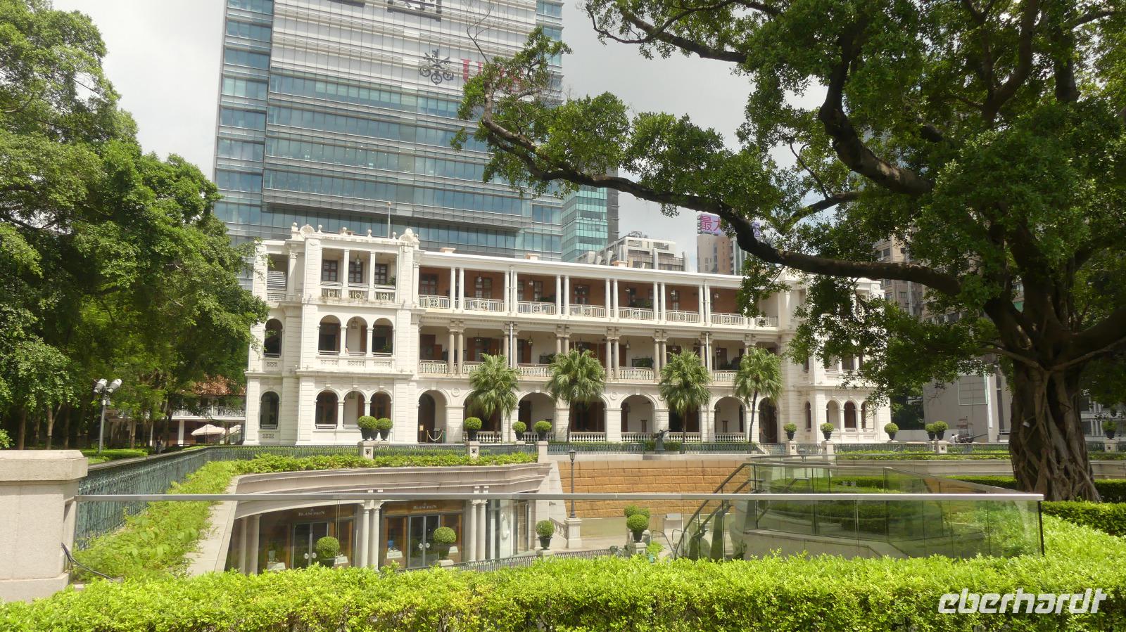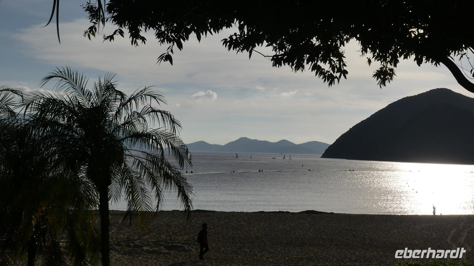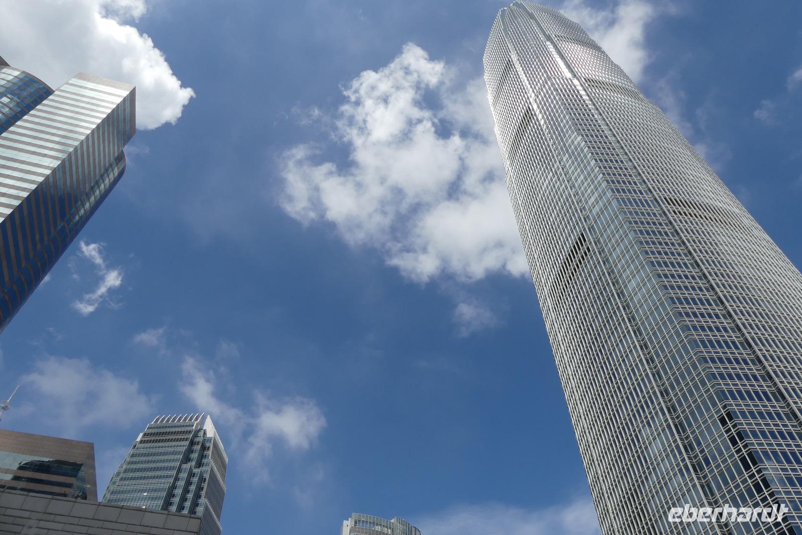 Das „New York Chinas" zeichnet sich durch Extreme aus: über 300 Wolkenkratzer mit mehr als 150 Meter Höhe, soviel gibt es in keiner anderen Stadt. Nirgendwo sonst leben Menschen so dicht zusammen und gleich daneben Naturschutzgebiete mit seltenen Arten, die es sonst in China gar nicht mehr gibt. 41% der Fläche sind streng geschütztes Naturschutzgebiet! So kann man hier innerhalb von 40 - 50 Minuten dem Trubel der Stadt in die Natur entfliehen, zum Beispiel an einen der vielen Strände. Wir selbst fahren in wenigen Minuten vom Victoria Peak über Aberdeen an den Strand der Repulse Bay. Sauberes, 26 Grad warmes Meerwasser laden ein, zumindest mal mit den Füßen einzutauchen.... Blickt man zurück aufs Land, fällt das Gebäude mit dem „Loch" auf - nach Fengshui ist dieses notwendig, damit der Drachen als Glücksbringer freie Flugbahn hat.
