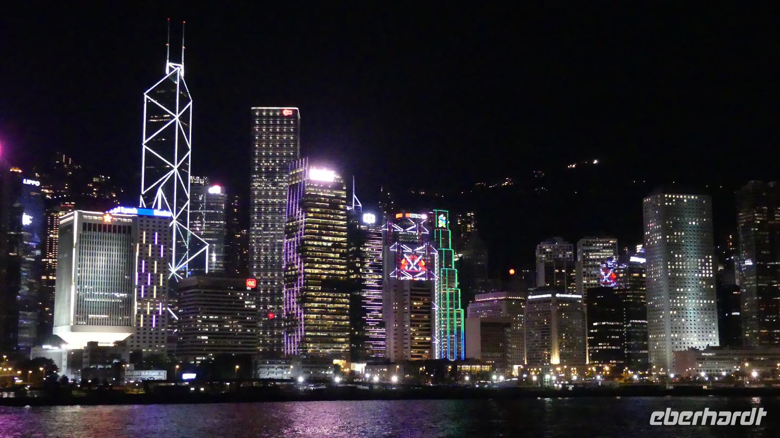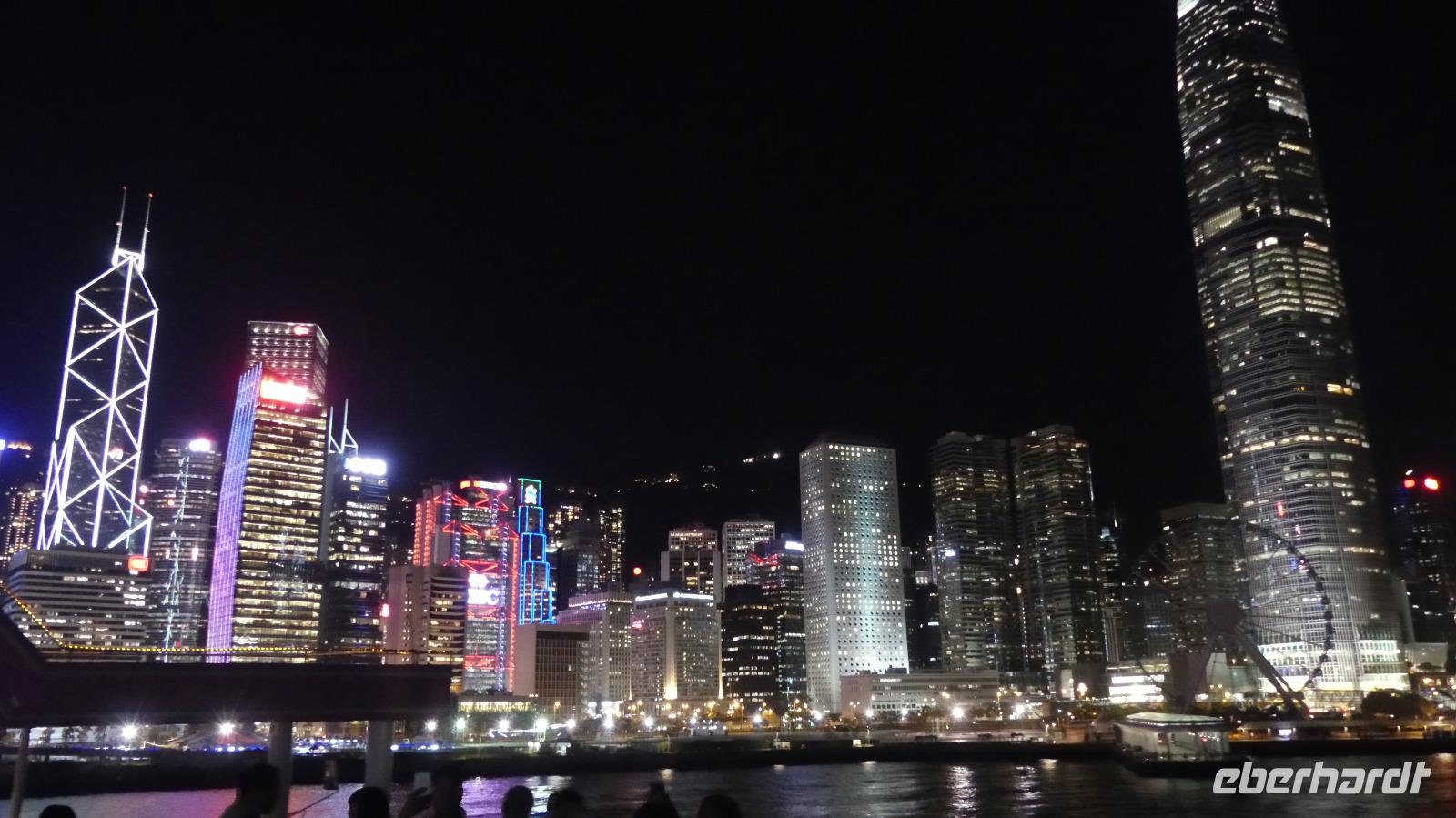 Am Abend erleben wir das Lichtermeer Honkongs von einem Ausflugsschiff aus, einer umgebauten Fähre. Beeindruckender als die Lasershow ist dabei die leuchtende Skyline selbst.