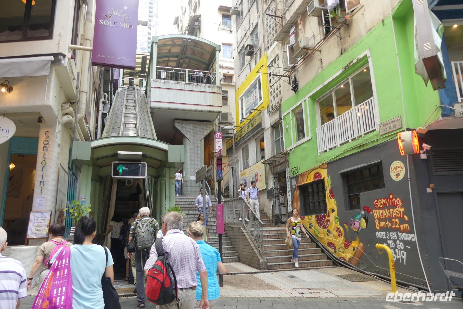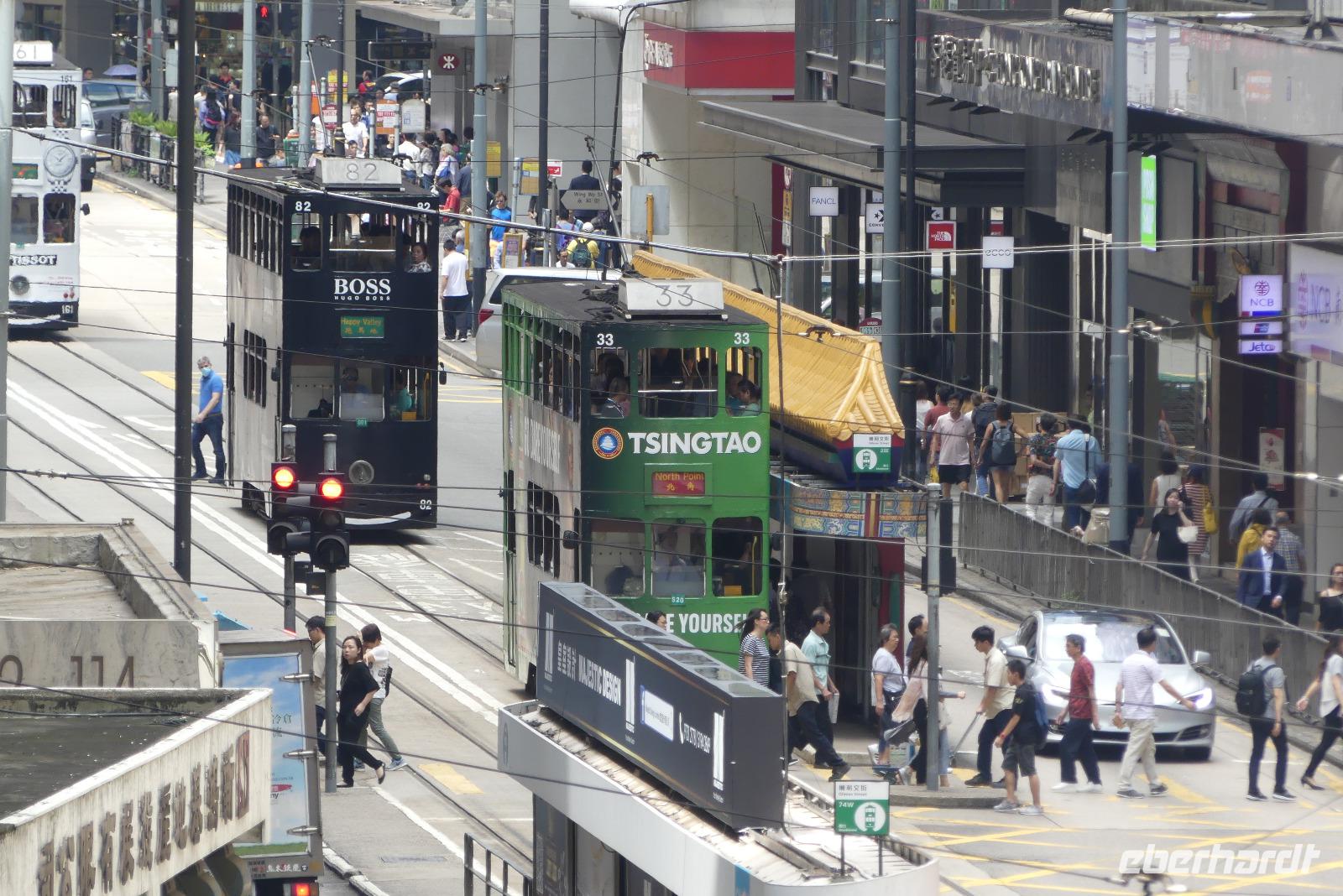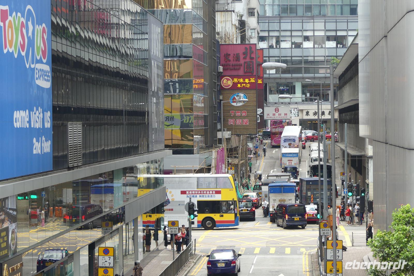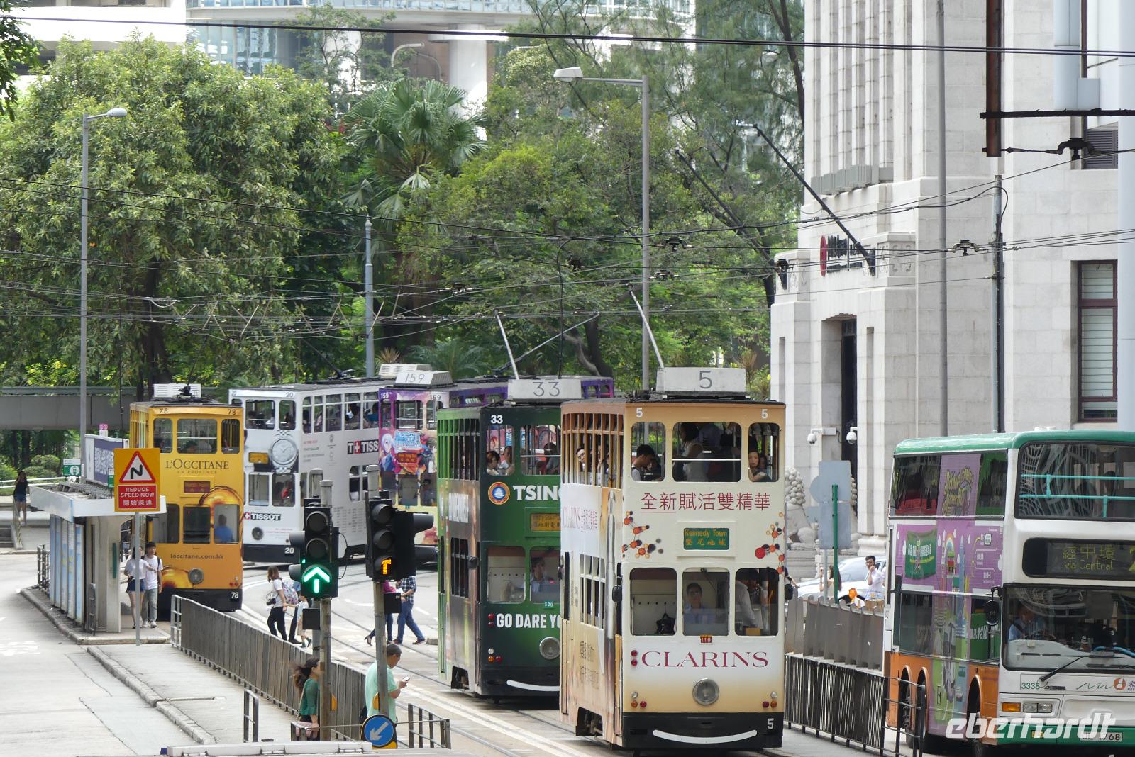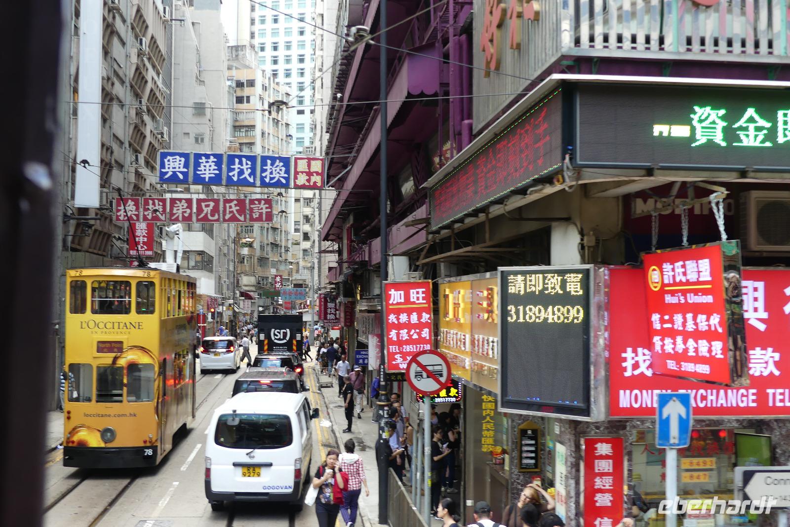 An unserem letzten Tag in Hongkong ändern wir unseren Zeitplan etwas und treffen uns schon am Vormittag mit Winnie. Ich finde, es ist eine tolle Idee, mit seinen verschieden Verkehrsmitteln zu erkunden: mit dem Doppeldeckerbus die bekannteste Einkaufsstraße, die Nathan Road hinunter, mit der Fähre (Star Ferry) gelangen wir vom Stadtteil Kowloon nach Hongkong Island. Auf der mit 800 Meter längsten Rolltreppe der Welt (je nach Tageszeit rollt sie hoch oder runter) steigen wir vorbei an kleinen Restaurants in die obere Stadt. Zwischendurch zeigt uns Winnie immer wieder interessante Ecken. Schließlich fahren wir mit einer Doppeldeckerstraßenbahn durch das Bankenzentrum und mit der Metro unter Wasser zurück nach Kowloon zum altehrwürdigen, luxuriösem Peninsula Hotel (das mit den grünen Rolls Royce vorm Eingang). Den Rest des Tages verbringt jeder auf eigene Faust, wir kennen uns ja jetzt schon etwas aus in der Stadt.