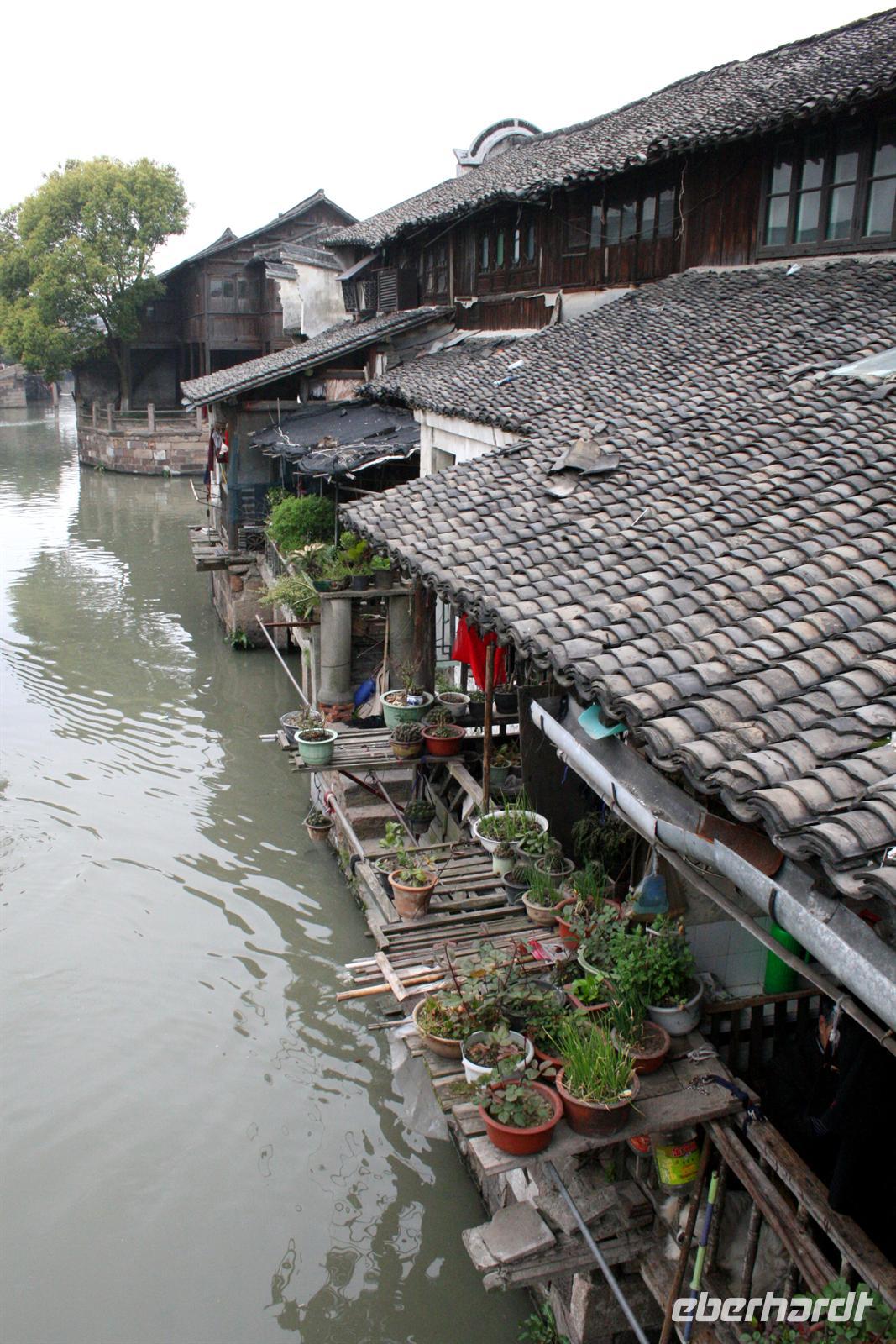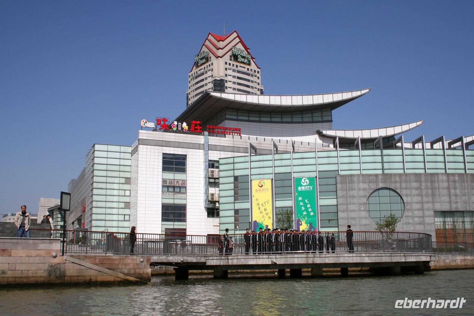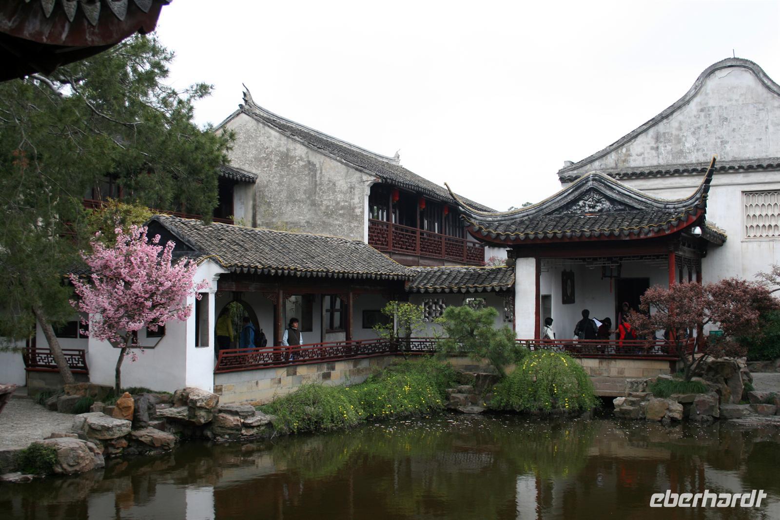 In Suzhou, auch „Venedig des Ostens“ genannt, hatten wir fakultativ die Möglichkeit, eine mehrstündige erlebnisreiche Rikschafahrt zu unternehmen, an der auch alle teilnahmen. Zwischendurch hielten wir in einem Lebensmittel-Markt, für einen Bummel auf einem Tiermarkt und in einem der typischen Gärten, die so viel Ruhe ausstrahlen. Unser Rikschafahrer war sehr nett und half uns immer beim Einsteigen in das Gefährt. Er lachte viel und legte sich ins Zeug für uns. Bei der Fahrt durch die Straßen wurde es teilweise ganz schön eng und überall fuhren Autos, Mopeds und Fahrräder durcheinander. Vorbei an den Kanälen der schönen Stadt genossen wir den Fahrtwind. Danach fuhren wir mit dem Bus weiter nach Shanghai.