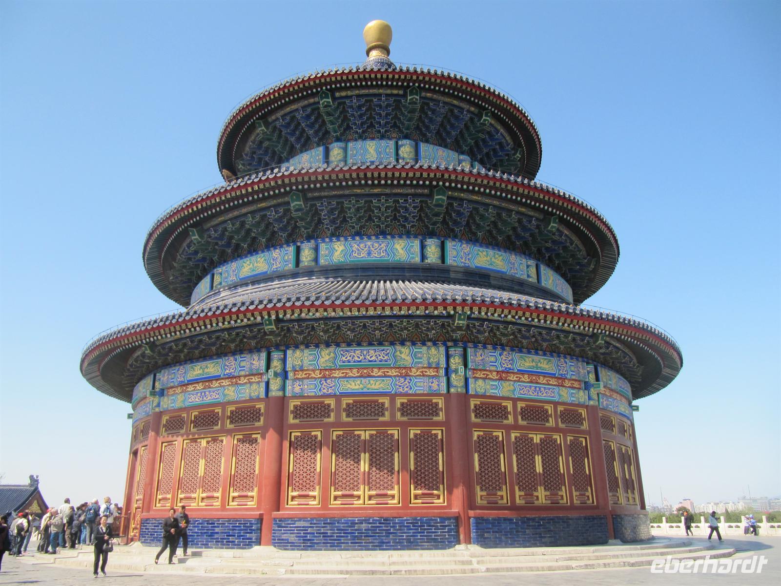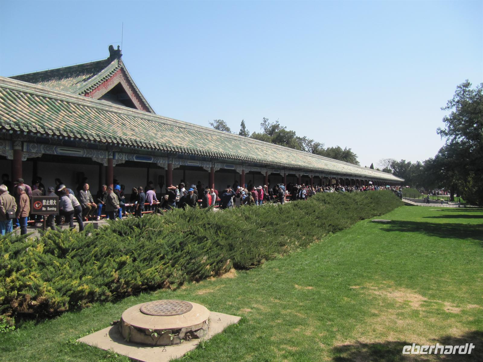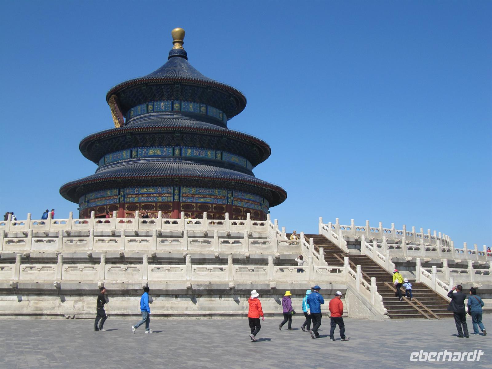 Nach einer erholsamen Nacht und einem guten Frühstück wartete heute ein weiterer Tag mit Pekinger Erlebnissen auf uns. Am Vormittag führte uns unser Weg in die größte Parkanlage der Stadt, mitten hinein in das allmorgendliche Schattenboxen, tanzen, kalligraphisieren, musizieren, Körper ertüchtigen und Mahjong oder Schach spielen, von vorwiegend älteren, augenscheinlich pensionierten Chinesen mit Hingabe und Ausdauer zelebriert. Mitmachen übrigens unbedingt erwünscht. Nach der Darbietung von derart viel Fitness, Lebenslust und Harmonie von Geist und Seele wandten wir uns den architektonisch-kulturellen Höhepunkten der Parkanlage zu. Die den Himmel symbolisierende Halle des Ernteopfers, auch als Himmelstempel bezeichnet, ragt mit ihren 38 Metern Höhe und den 50000 blauen Glasurziegeln weithin sichtbar heraus. Sie gilt deshalb auch als eines der schönsten und harmonischsten sakralen Bauwerke Chinas. Weiter ging es über das Himmelsgewölbe zum dreistufigen Himmelsaltar, auf dem der Kaiser einstmals Zwiesprache mit dem Himmel hielt und Opfergaben darbot, um sich so der himmlischen Hilfe und Unterstützung, u.a. für ertragreiche Ernten, zu versichern.