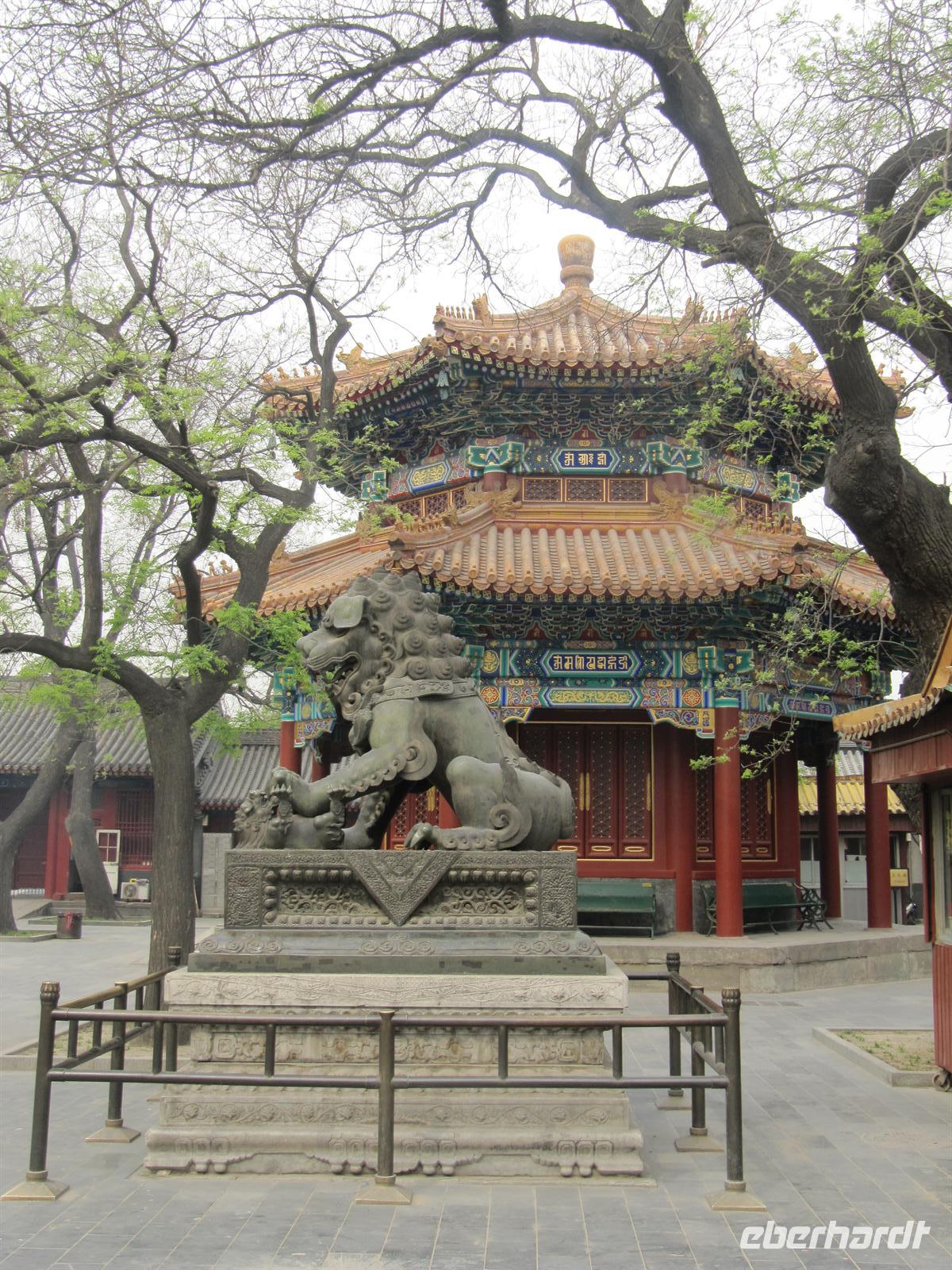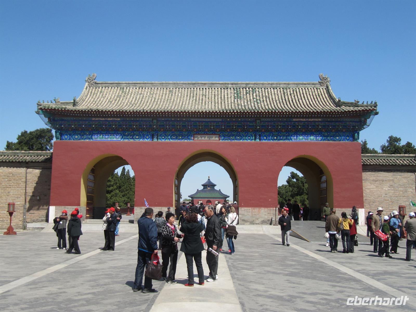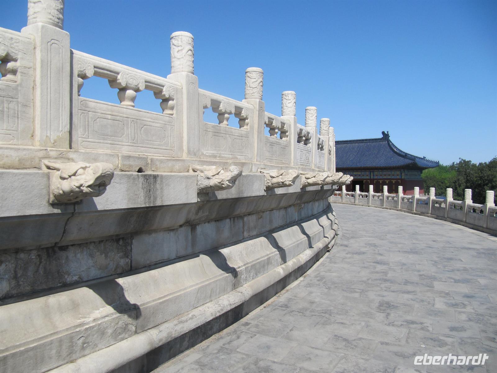 Nach einer erholsamen Nacht und einem guten Frühstück wartete heute ein weiterer Tag mit Pekinger Erlebnissen auf uns. Am Vormittag führte uns unser Weg in die größte Parkanlage der Stadt, mitten hinein in das allmorgendliche Schattenboxen, tanzen, kalligraphisieren, musizieren, Körper ertüchtigen und Mahjong oder Schach spielen, von vorwiegend älteren, augenscheinlich pensionierten Chinesen mit Hingabe und Ausdauer zelebriert. Mitmachen übrigens unbedingt erwünscht. Nach der Darbietung von derart viel Fitness, Lebenslust und Harmonie von Geist und Seele wandten wir uns den architektonisch-kulturellen Höhepunkten der Parkanlage zu. Die den Himmel symbolisierende Halle des Ernteopfers, auch als Himmelstempel bezeichnet, ragt mit ihren 38 Metern Höhe und den 50000 blauen Glasurziegeln weithin sichtbar heraus. Sie gilt deshalb auch als eines der schönsten und harmonischsten sakralen Bauwerke Chinas. Weiter ging es über das Himmelsgewölbe zum dreistufigen Himmelsaltar, auf dem der Kaiser einstmals Zwiesprache mit dem Himmel hielt und Opfergaben darbot, um sich so der himmlischen Hilfe und Unterstützung, u.a. für ertragreiche Ernten, zu versichern.
