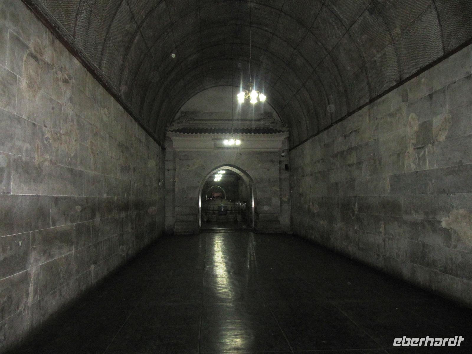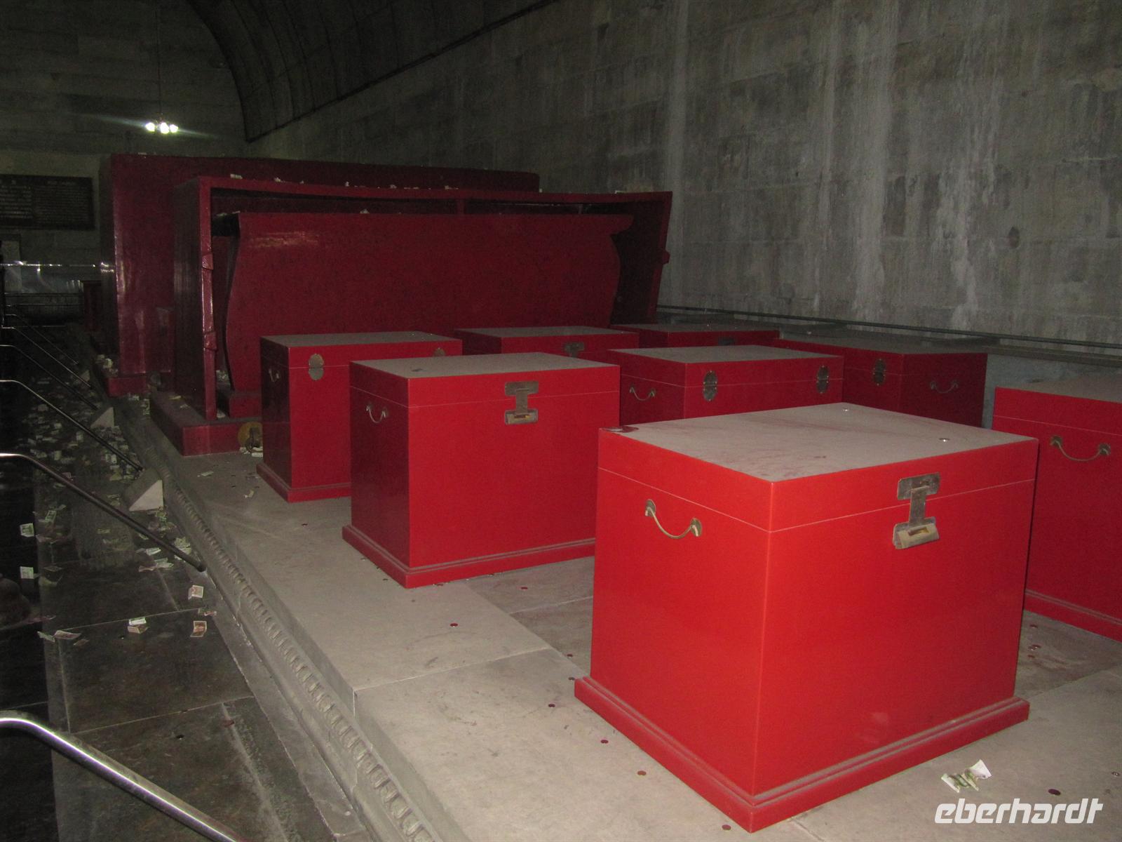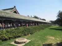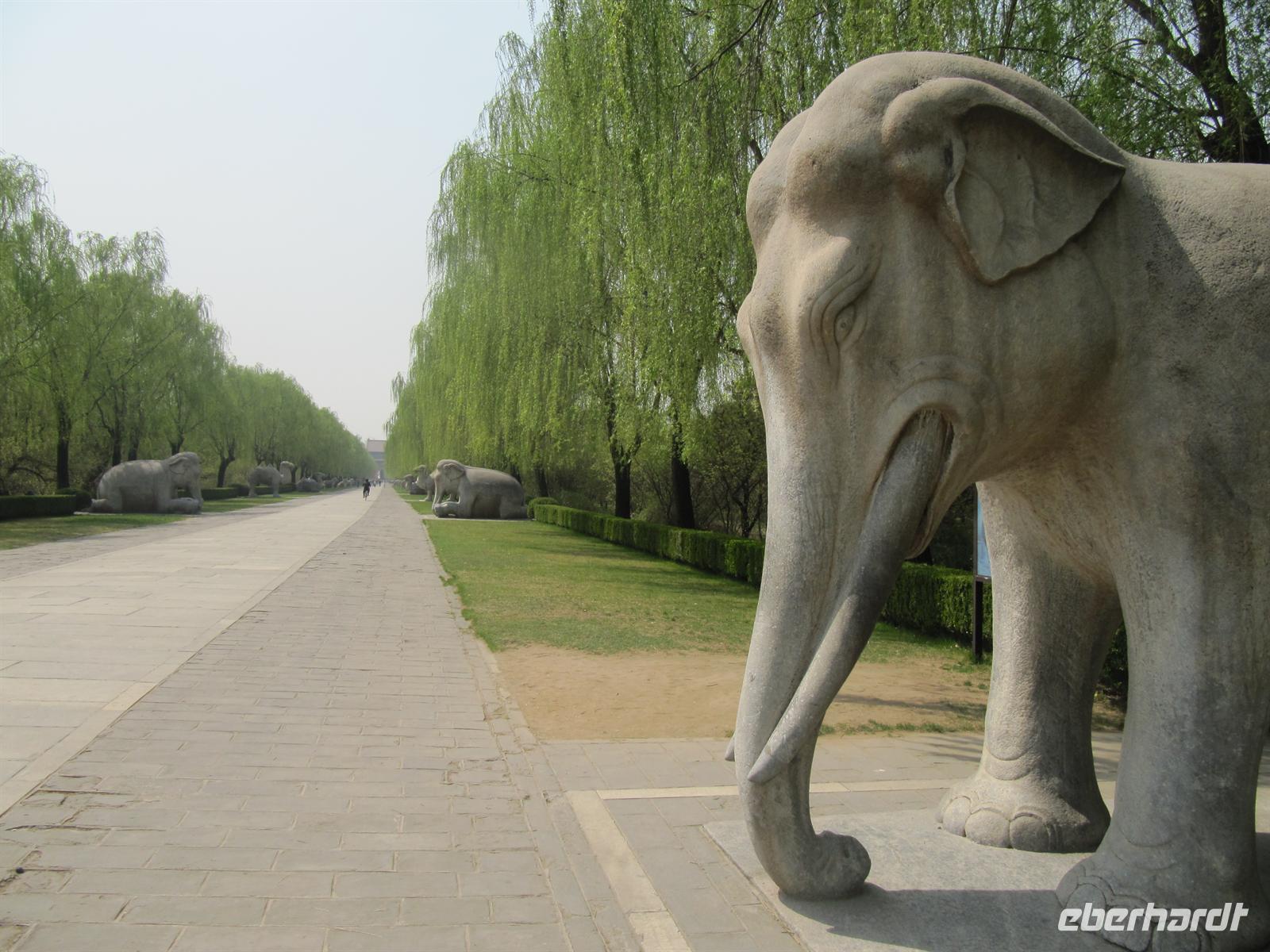 Nach etwas mehr als zwei Stunden haben wir unser erstes Ziel, die Geisterallee in der Nähe der Ming-Gräber, erreicht. Hier spazierten wir entlang der Statuen verschiedener Tier- und Menschenfiguren, die die Gräber vor Räubern und bösen Geistern schützen sollten. Im Anschluss daran fuhren wir zu den Grabanlagen der Ming-Kaiser, welche wir besichtigten. Dabei besuchten wir auch die unterirdische Grabkammer des Dingling, des 13. Ming-Kaisers Wanli, welche aus drei Tonnengewölben mit Marmorthronen und den Särgen und diversen Grabbeigaben bestand.